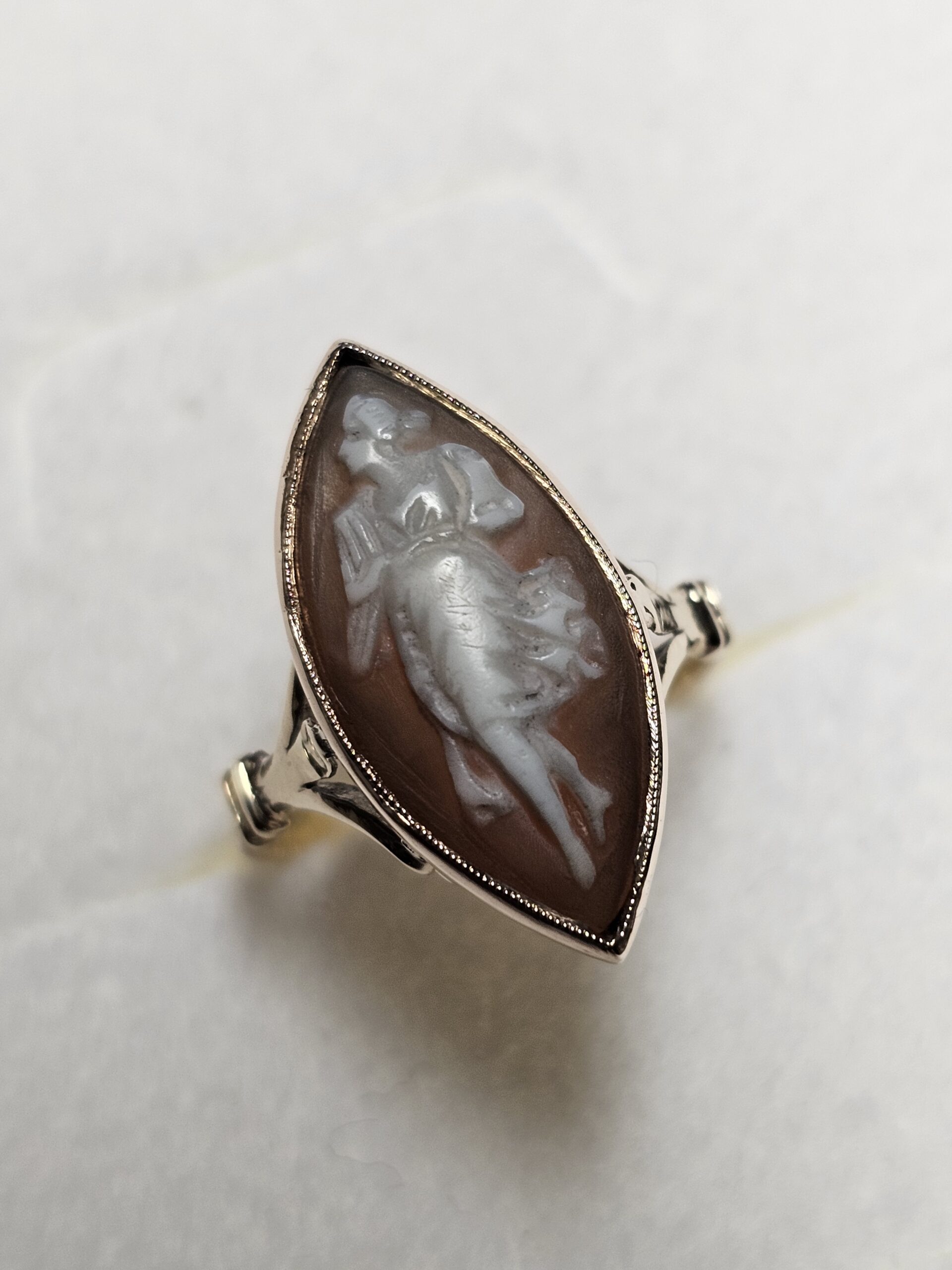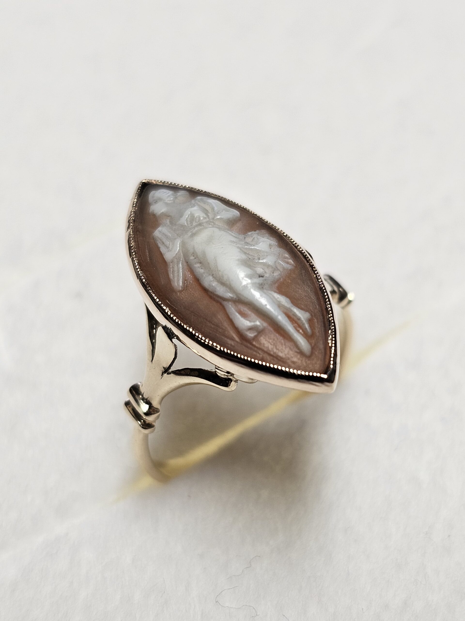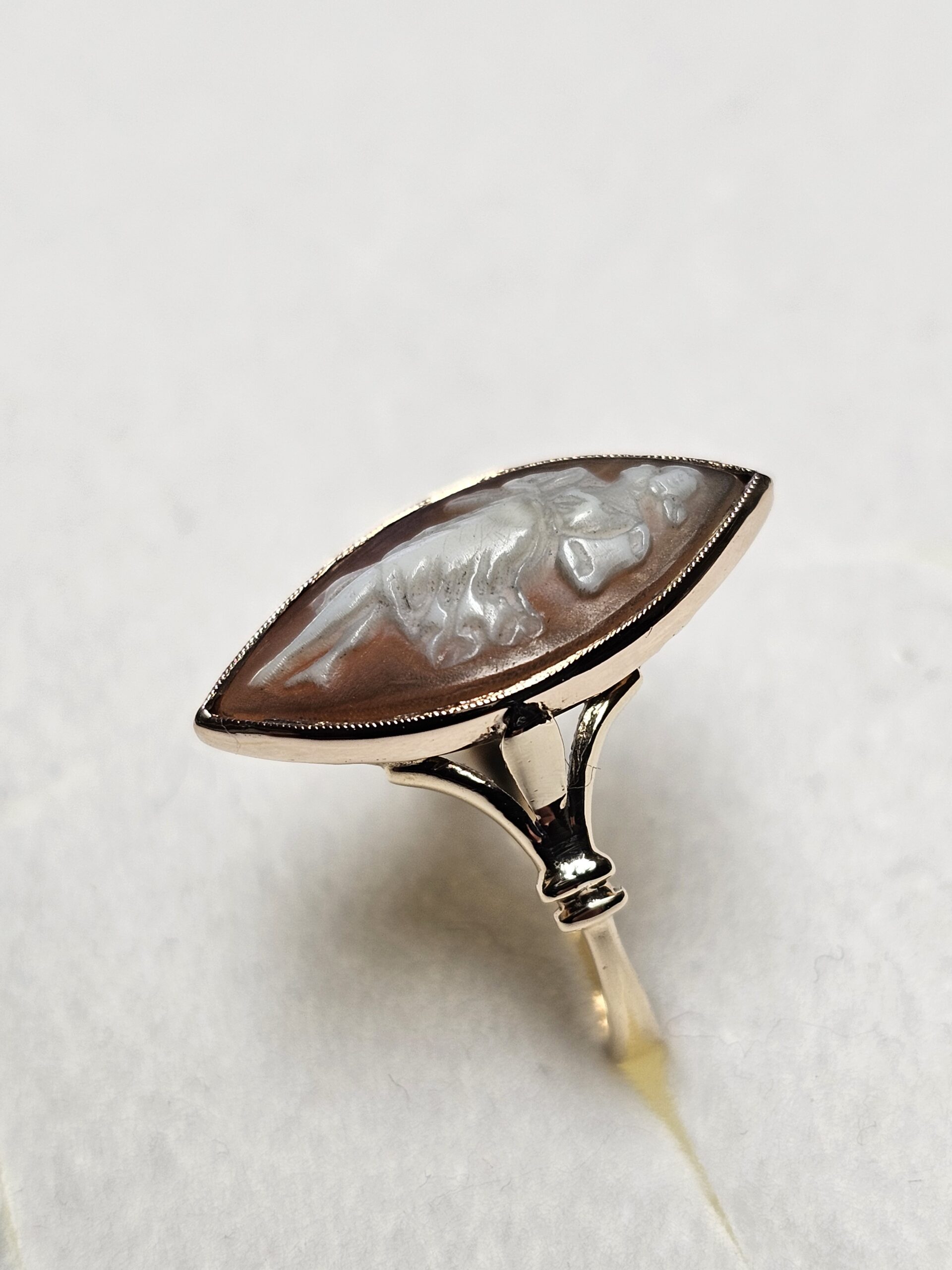 Nostalgischer Shabby Vintage Goldring 585 (geprüft, nicht gepunzt) mit einer Frauenabbildung Muschel Kamee / Gemme.