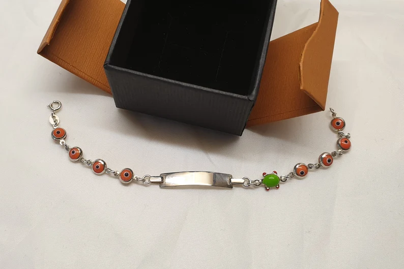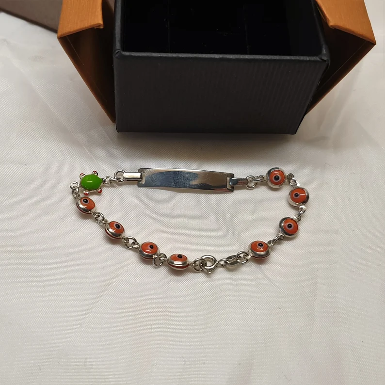 15 cm Kinder Armband Gliederarmband mit Gravurplatte Silber 925 Emaille Schildkröte Augen Vintage SA467