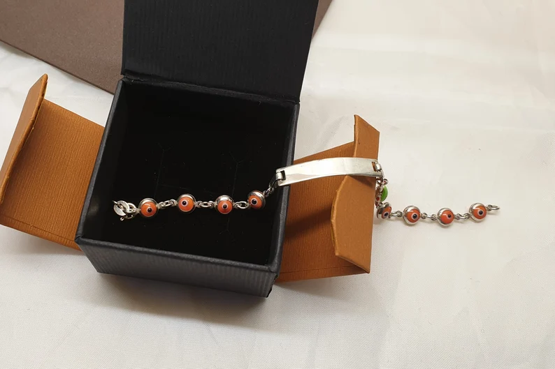 Das Armbändchen ist mit kleinen orangefarbenen Augen geschmückt und einer kleinen Schildkröte als Glücksbringer.