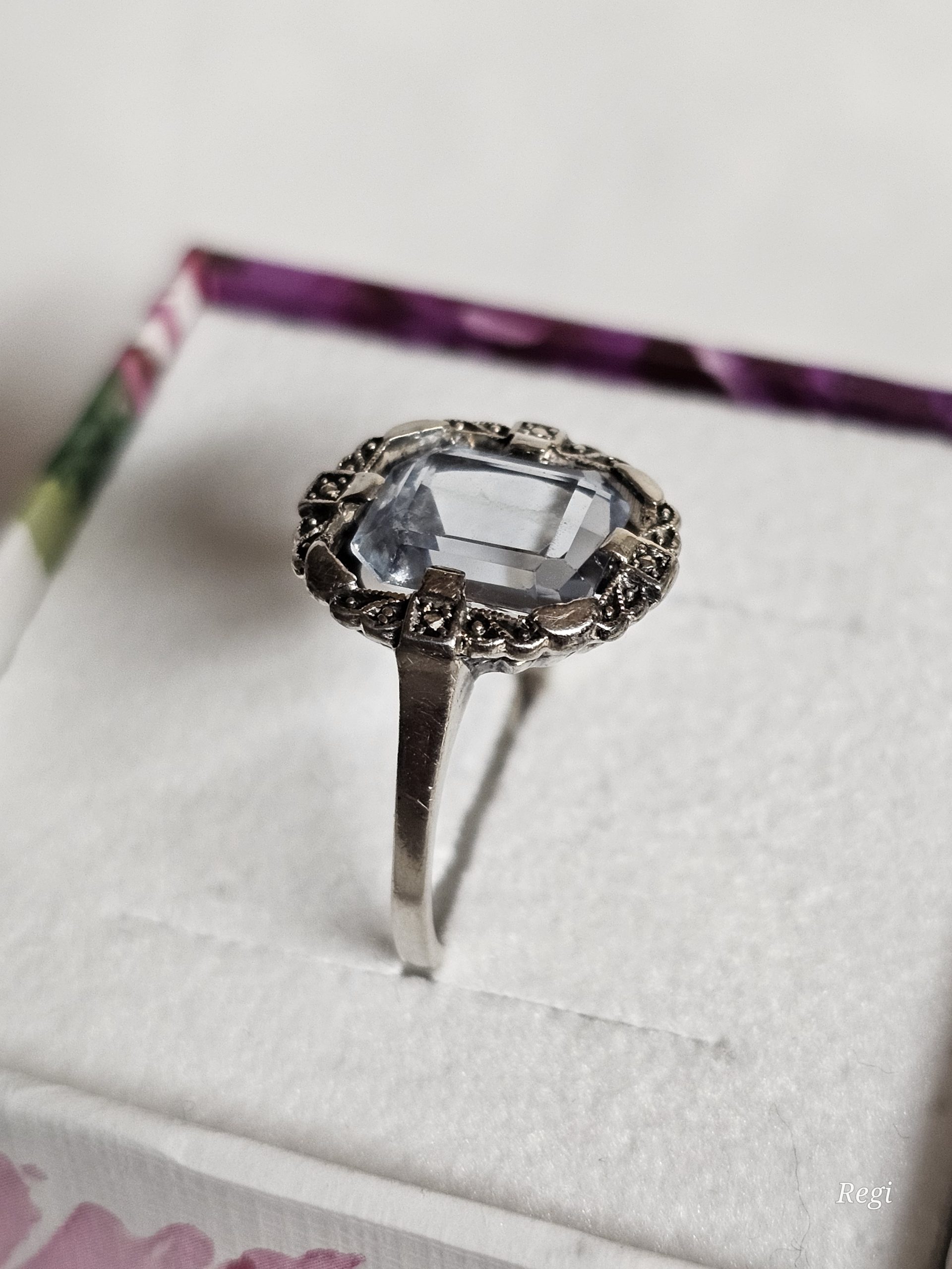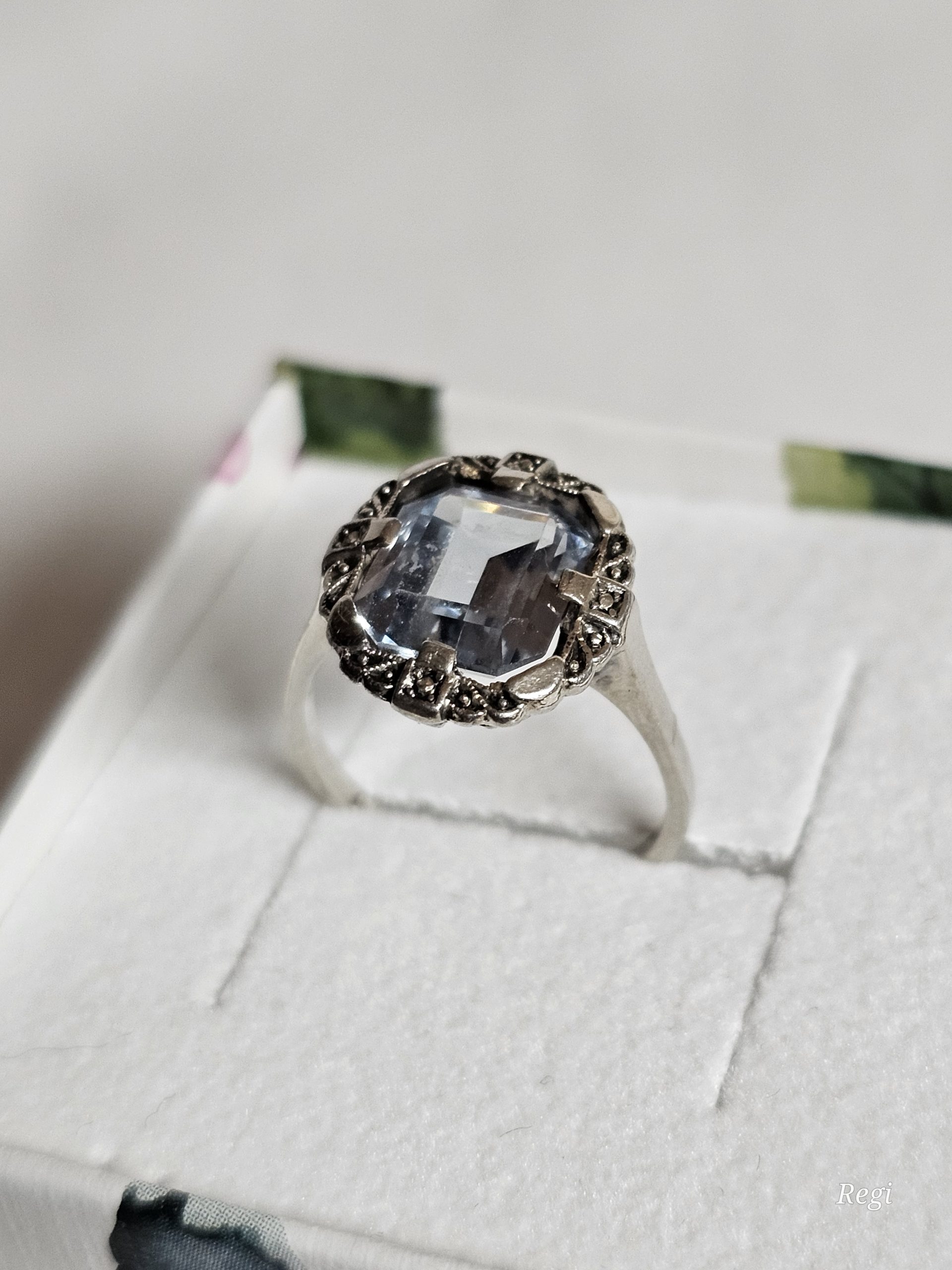 16,2 mm Jugendstil Ring Silber 935 Topas Blautopas & Markasiten antik selten Design Shabby Vintage elegant SR1582