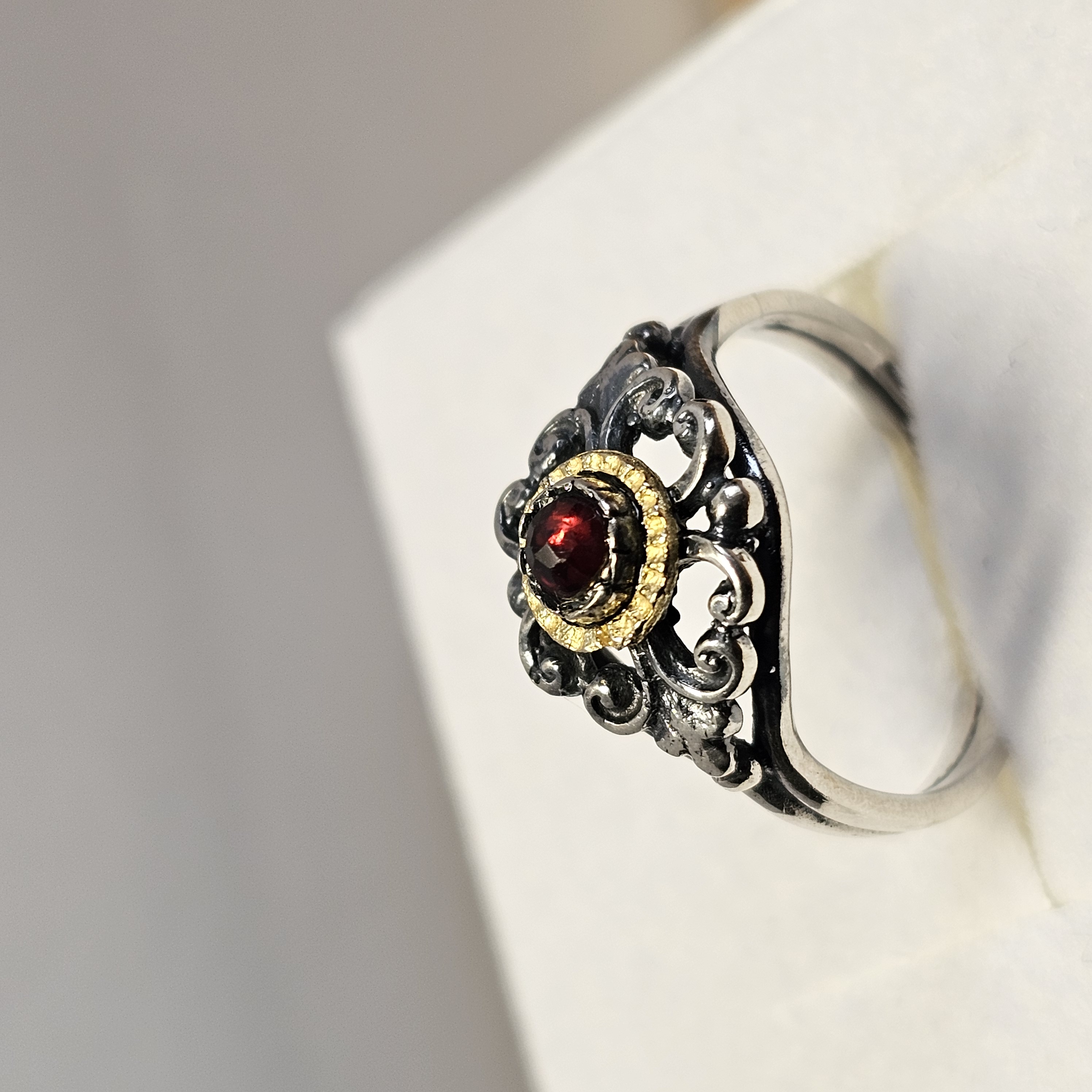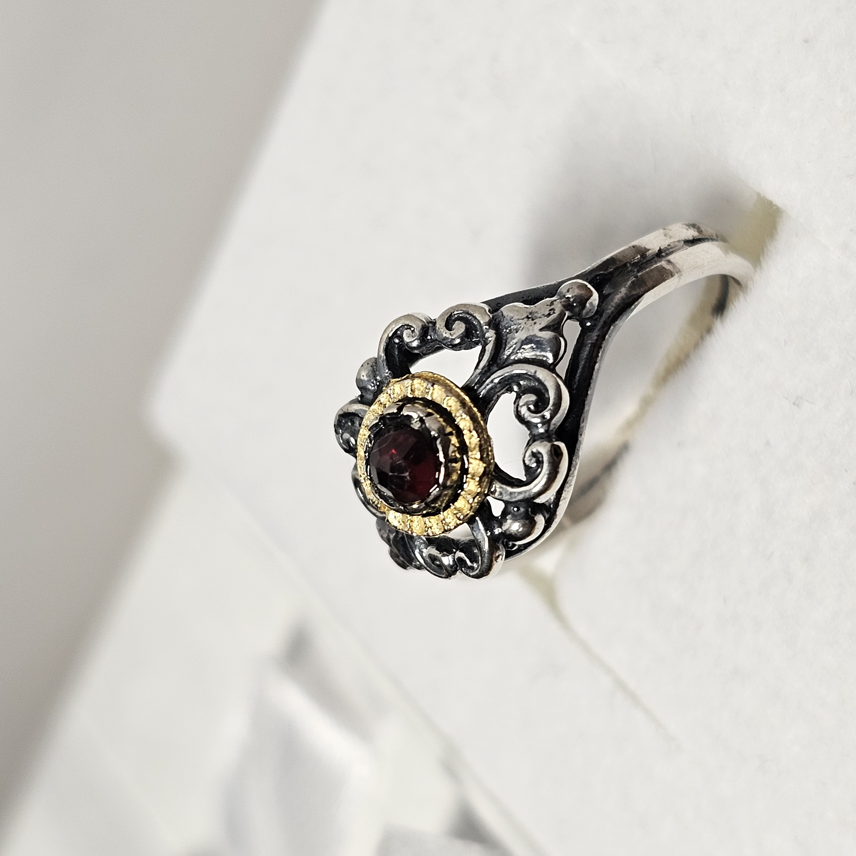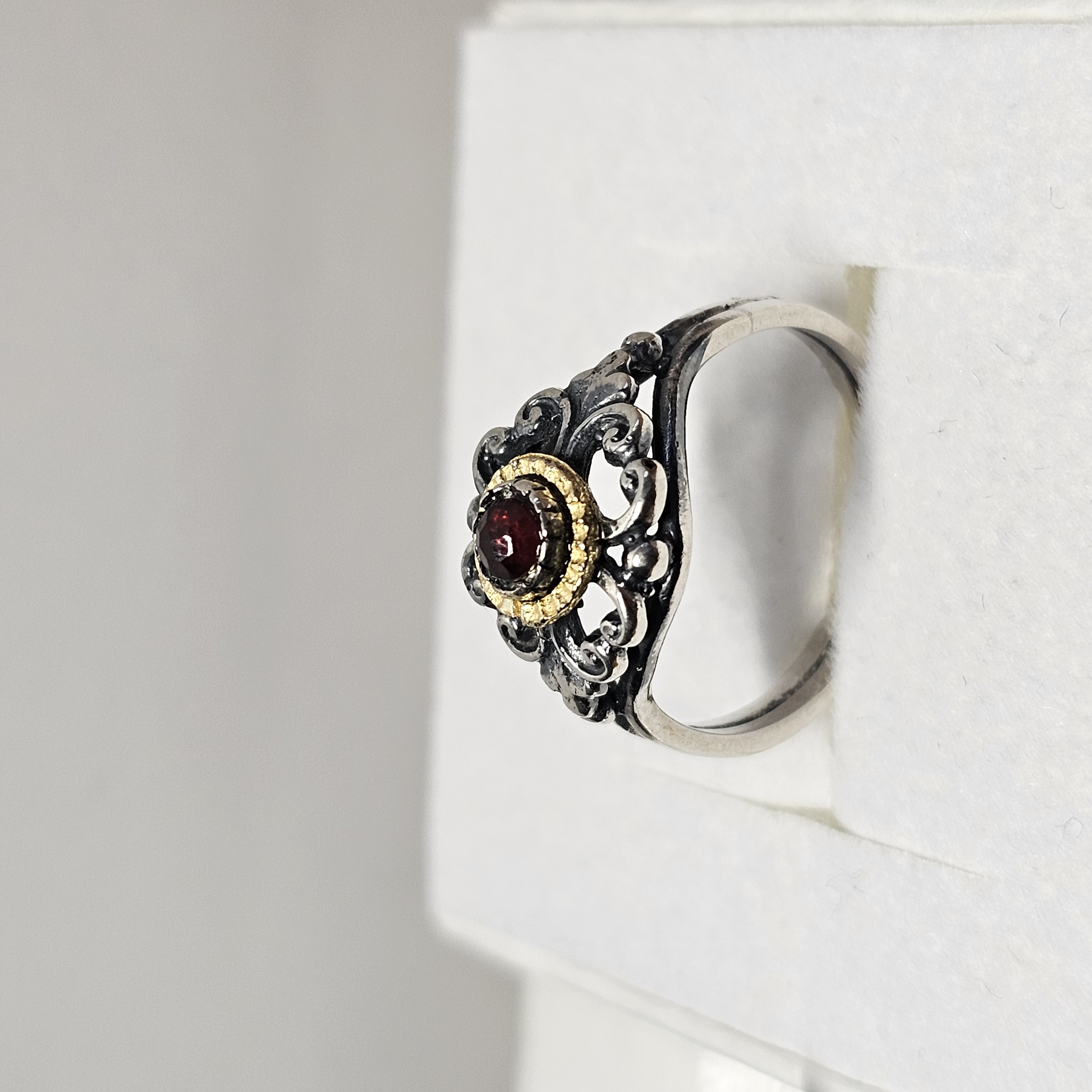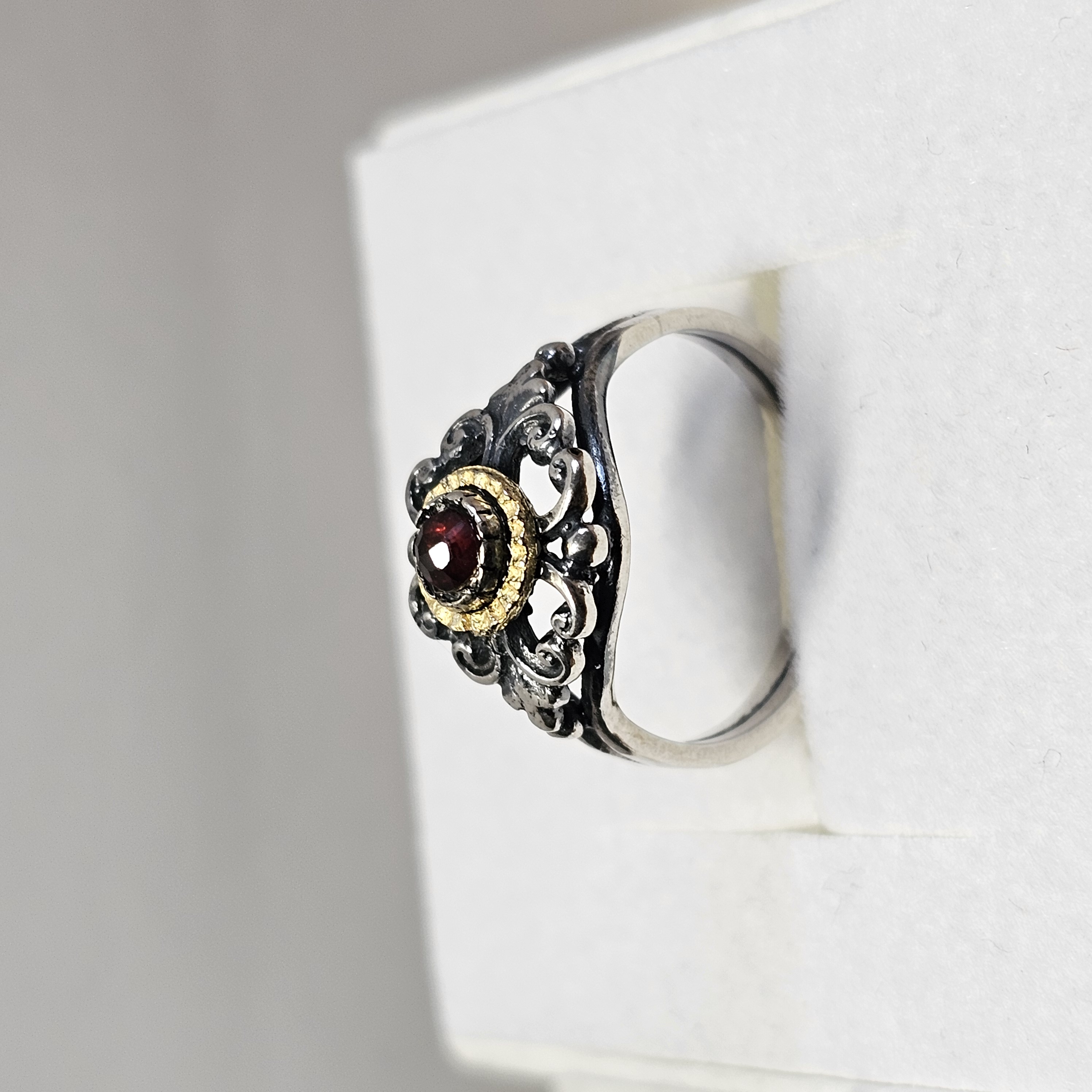 Nostalgischer Ring Silber 835. Er trägt eine Teilvergoldung am Ringkopf und ist mit einem schönen himbeerfarbenen Turmalin geschmückt.