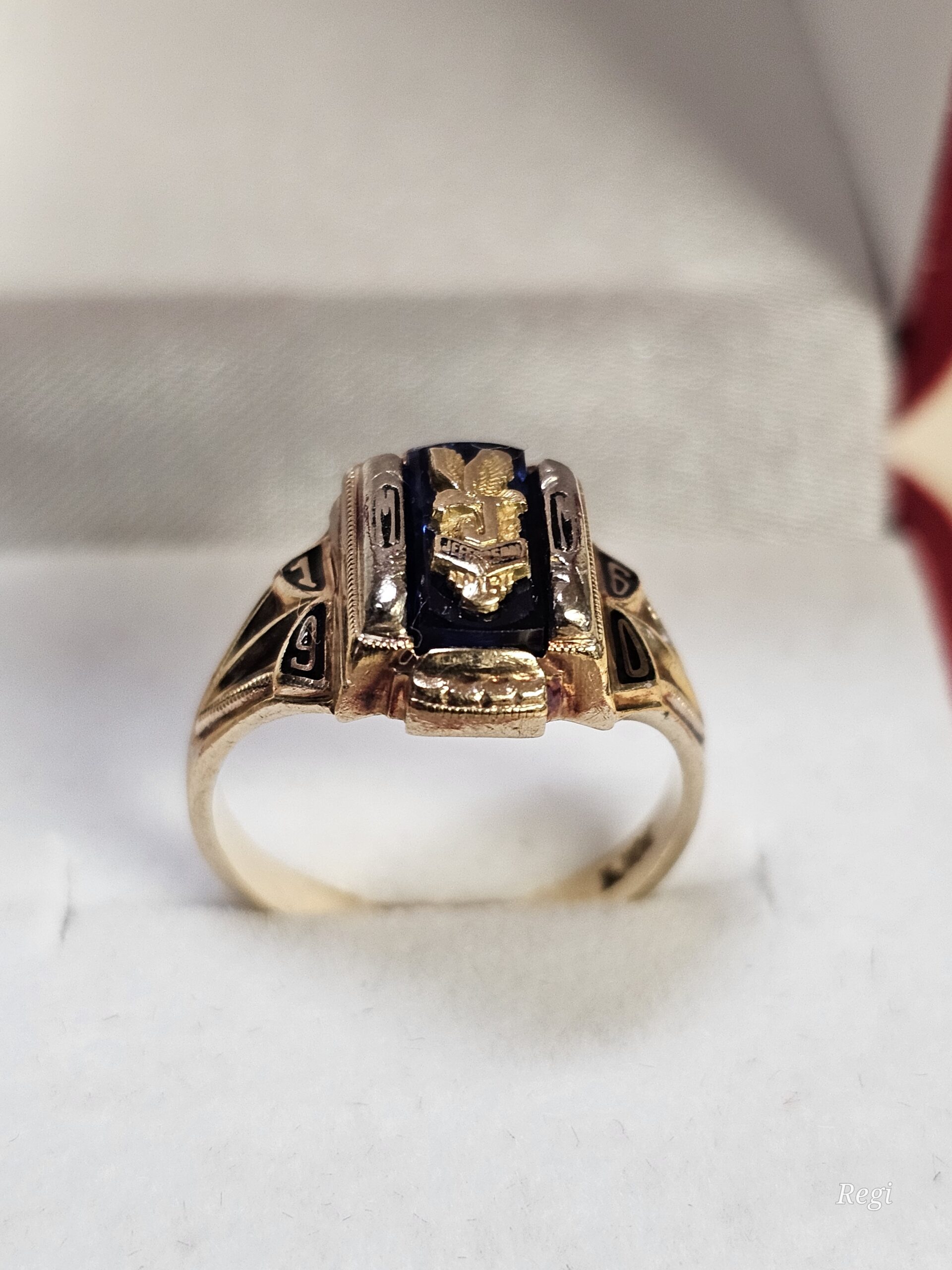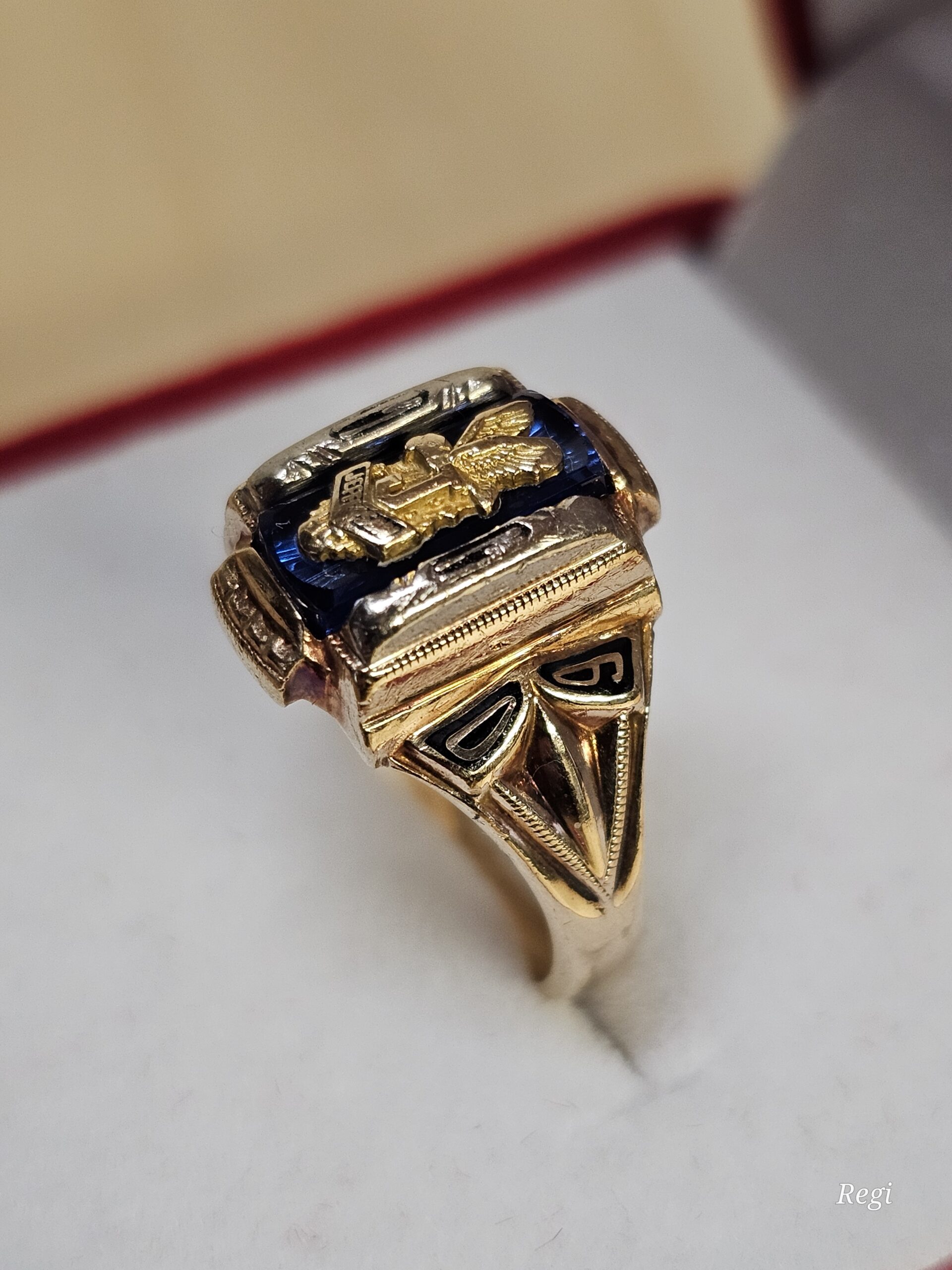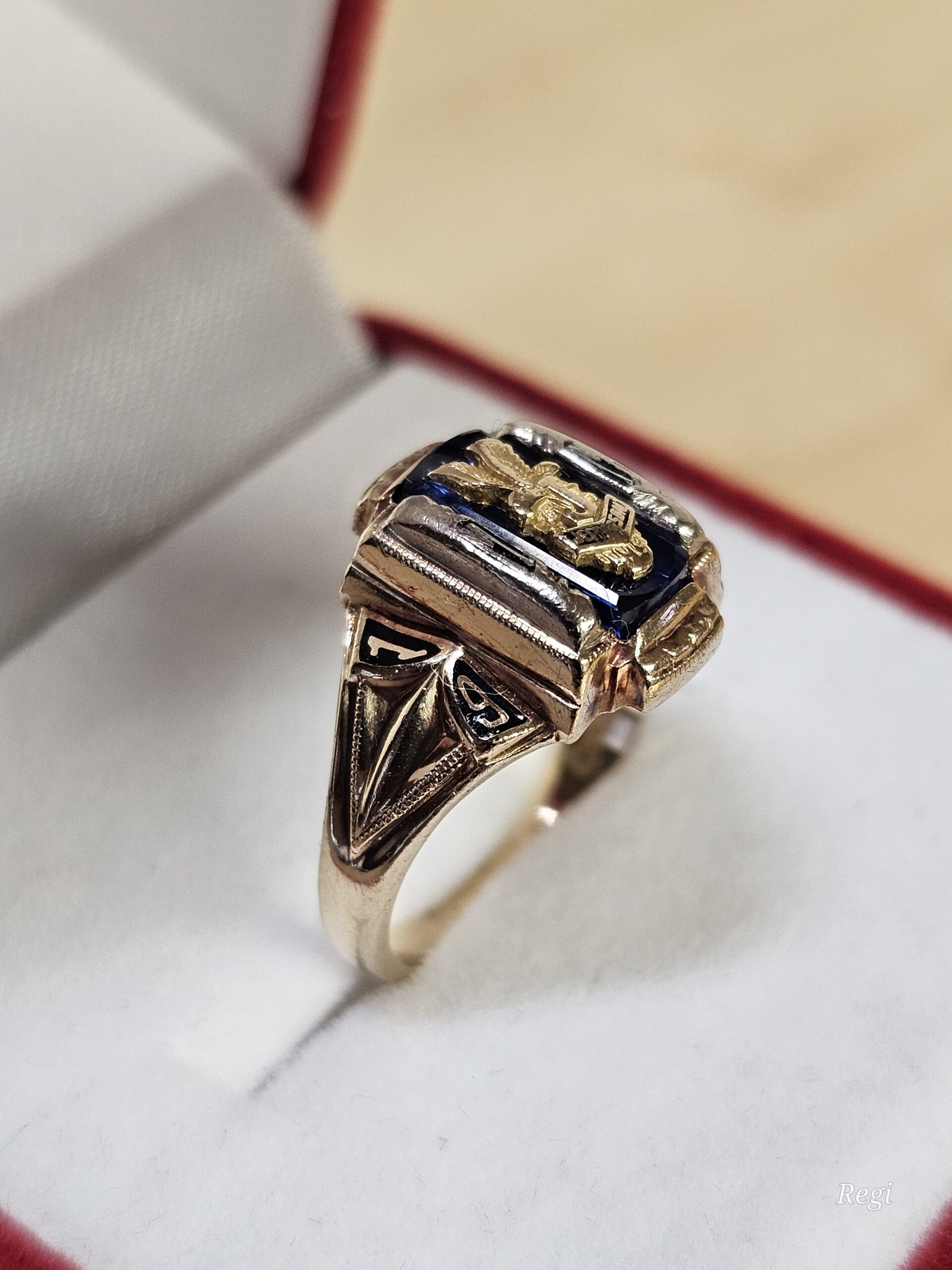 16,5 mm Goldring Ring Gold 10 k Farbstein blau High School aus dem Jahr 1960 American Eagle Adler Vintage selten rar GR335