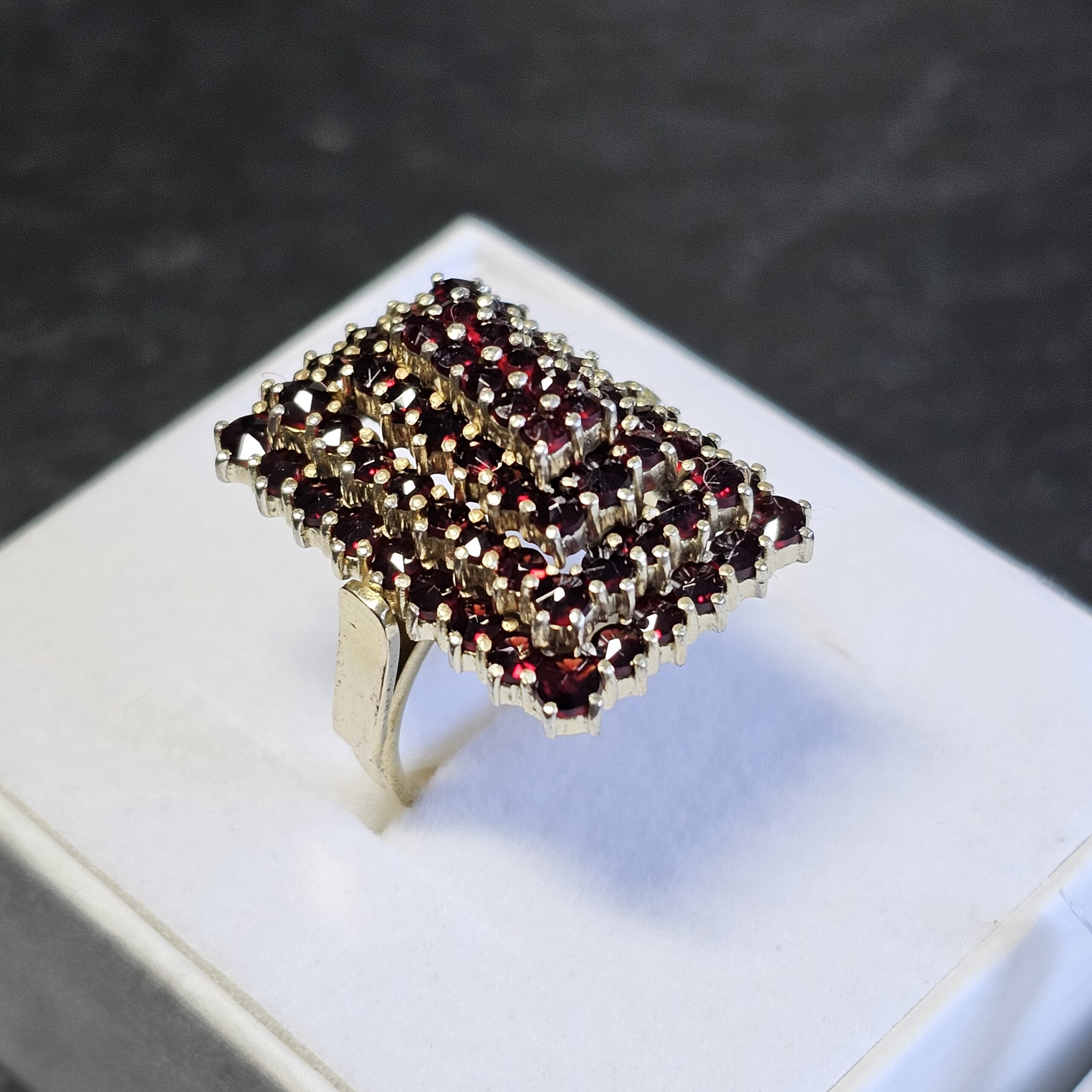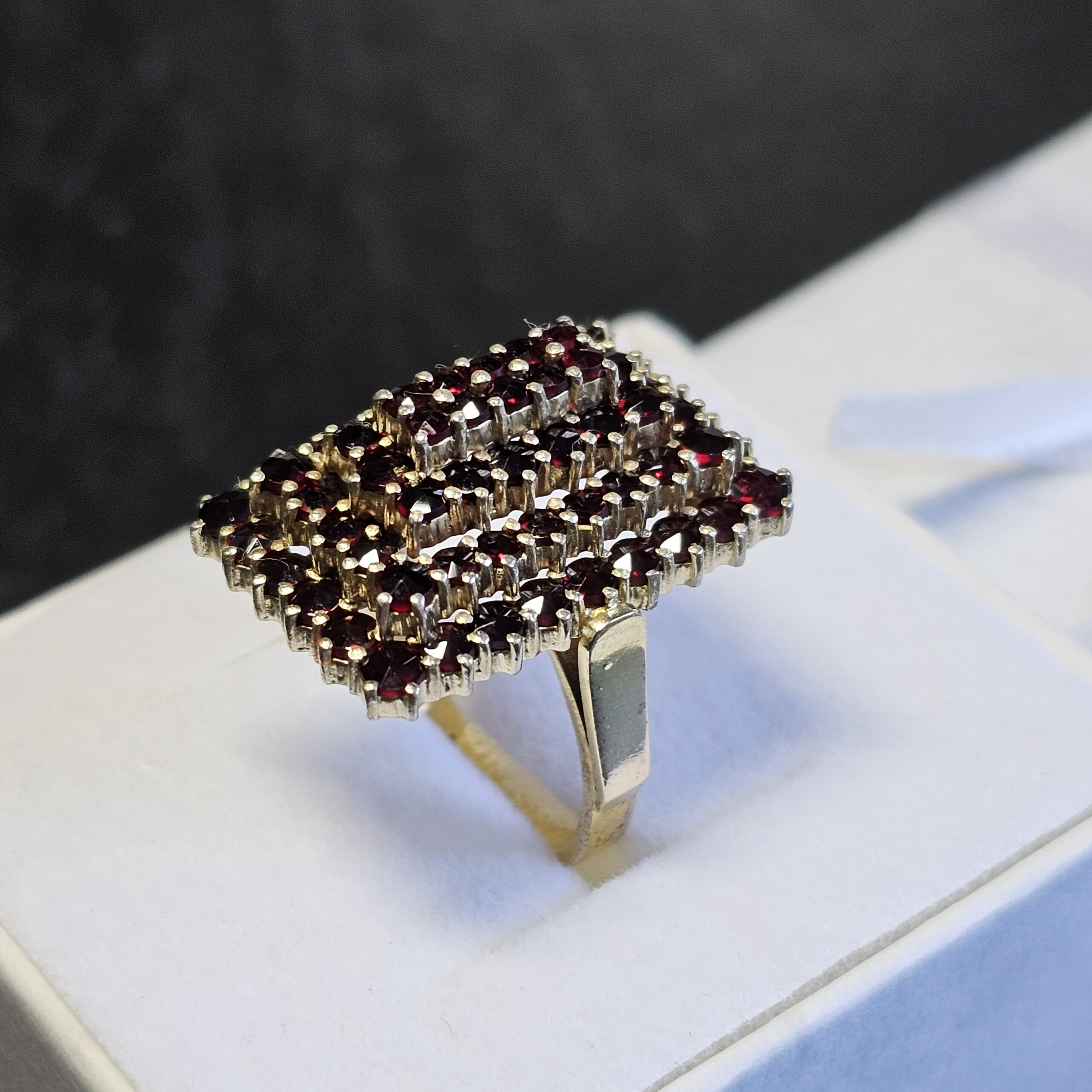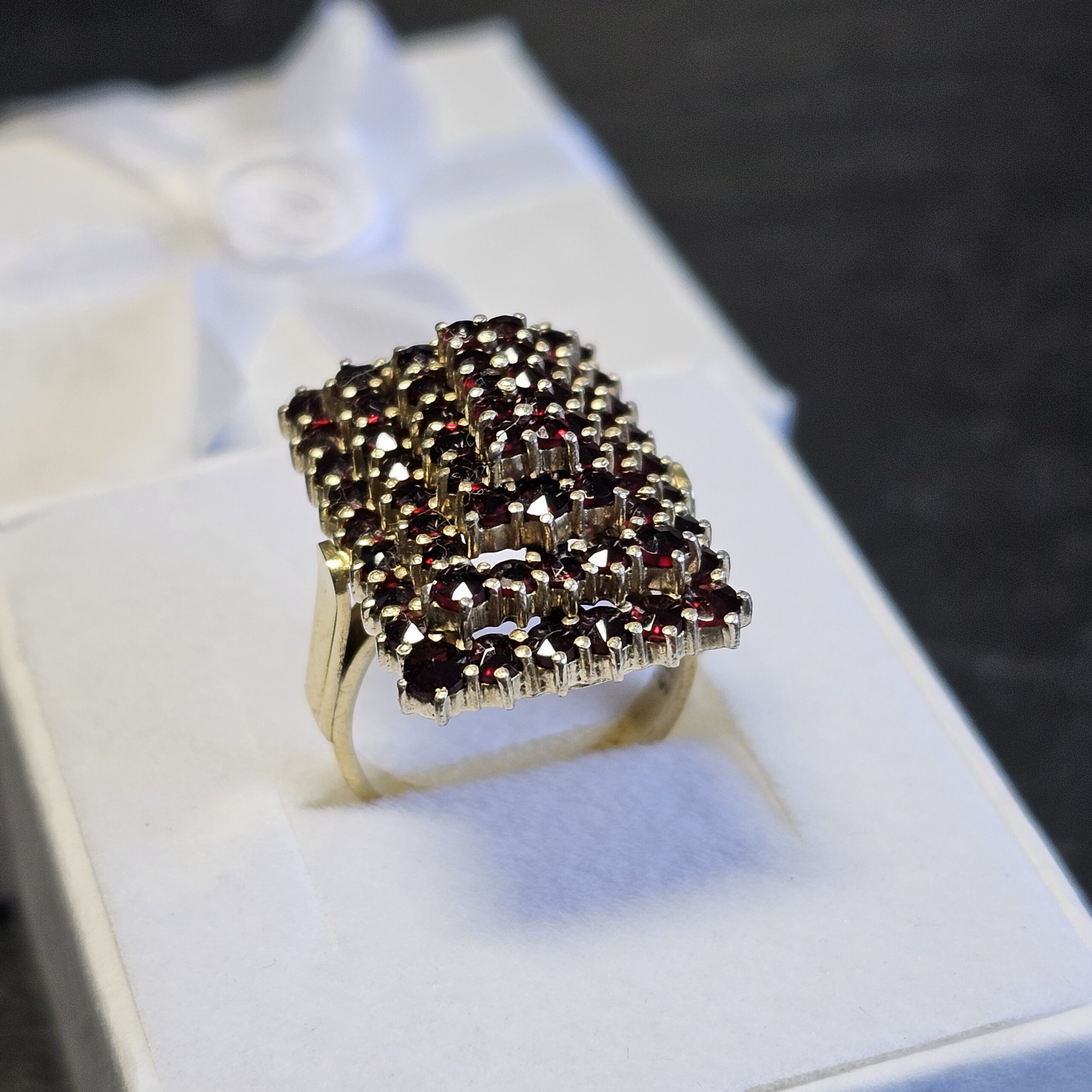 Eleganter prachtvoll gestalteter 333 Goldring besetzt mit böhmischen Granatsteinen.