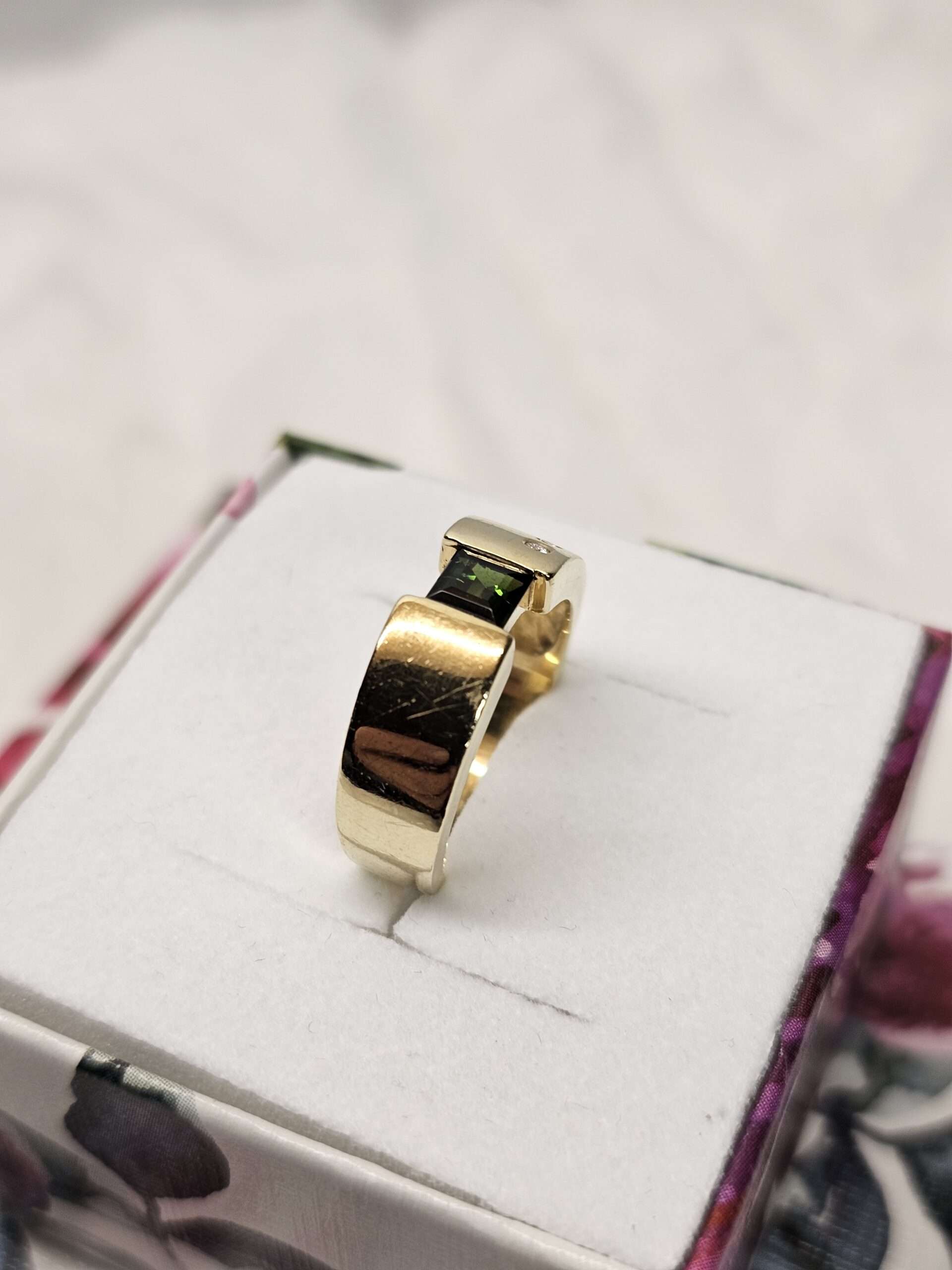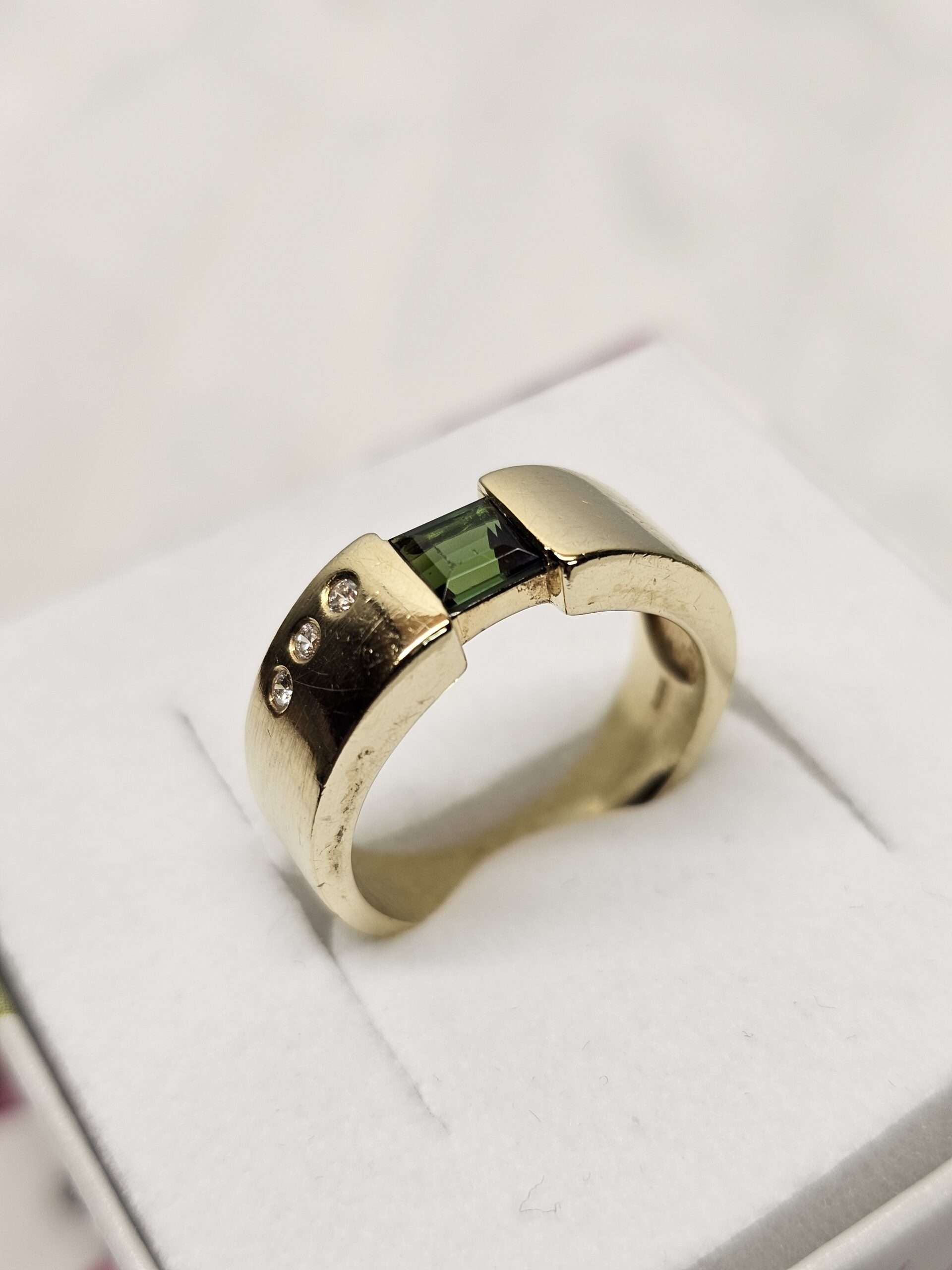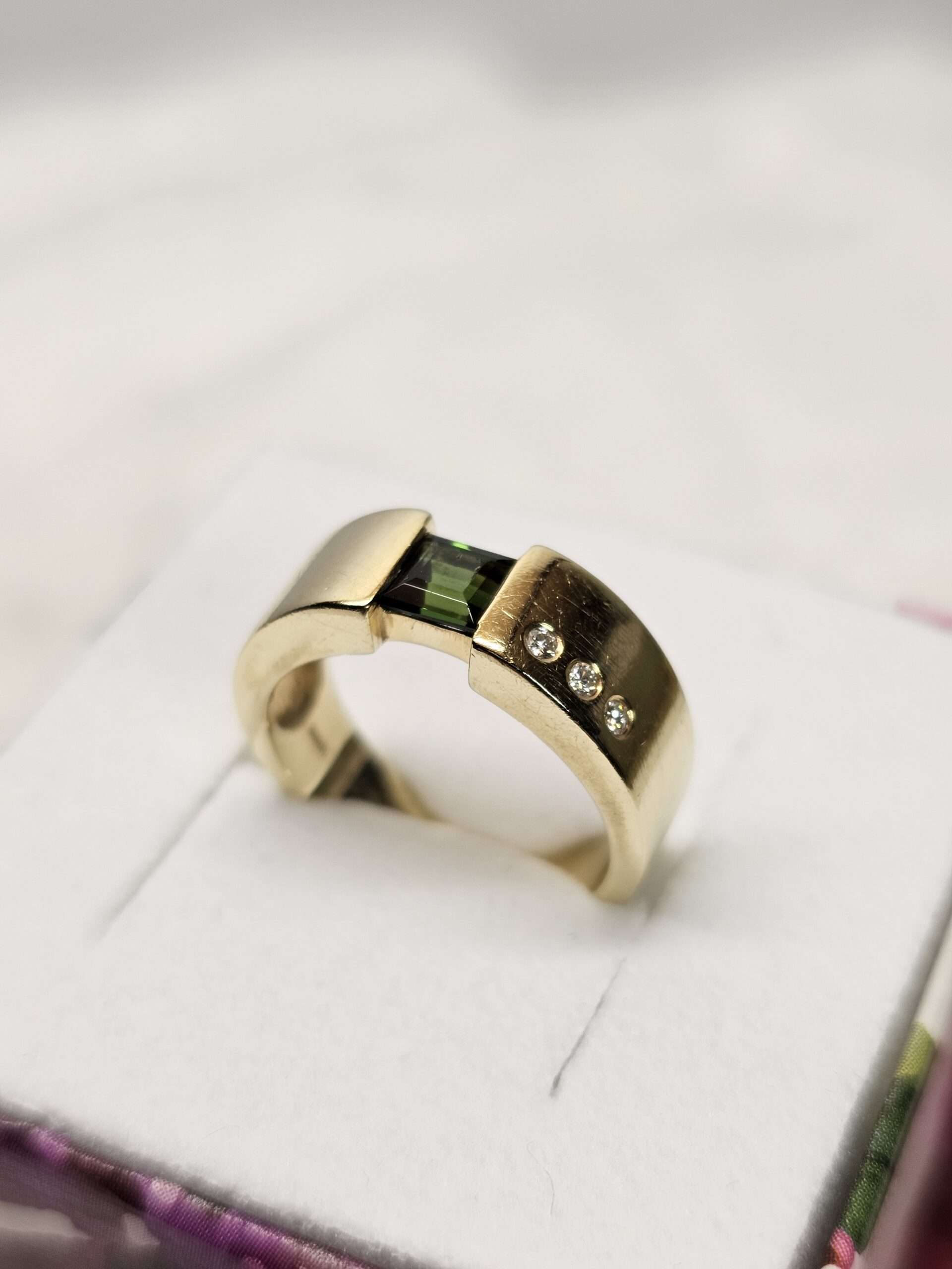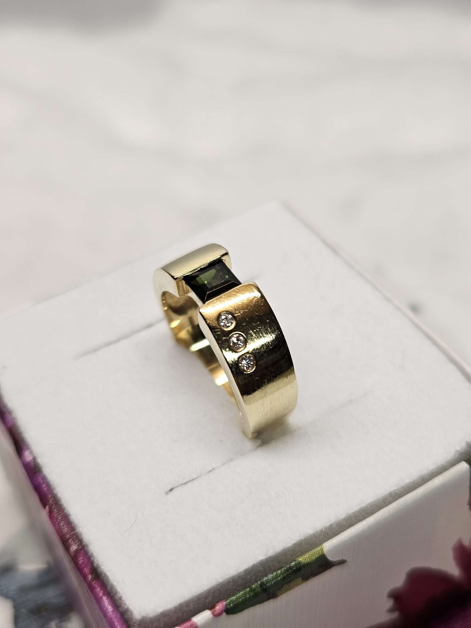 Schöner Vintage Goldring aus Gold 585, im Kopfbereich mit einem Peridot und 3 Stck. Diamantsteinchen besetzt.