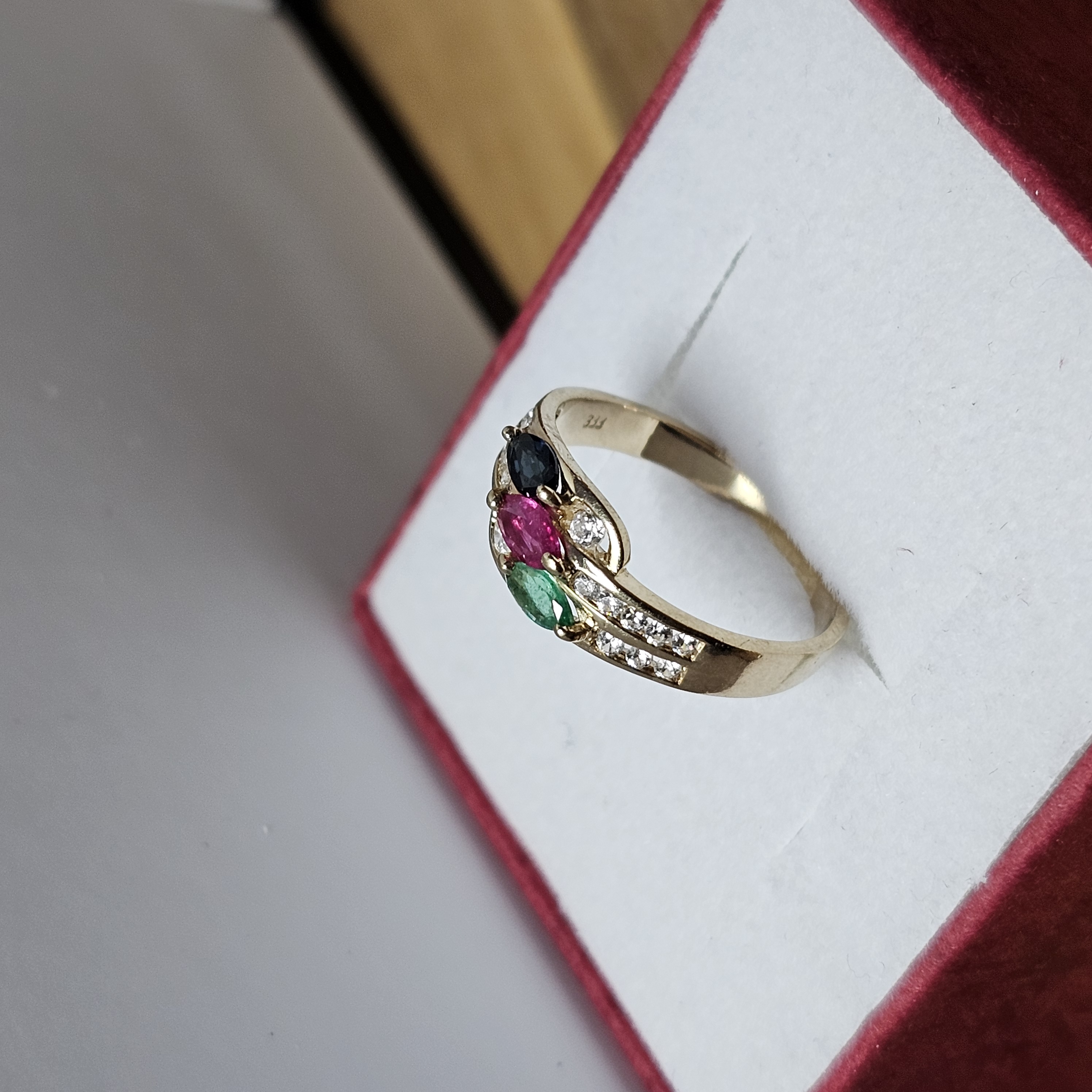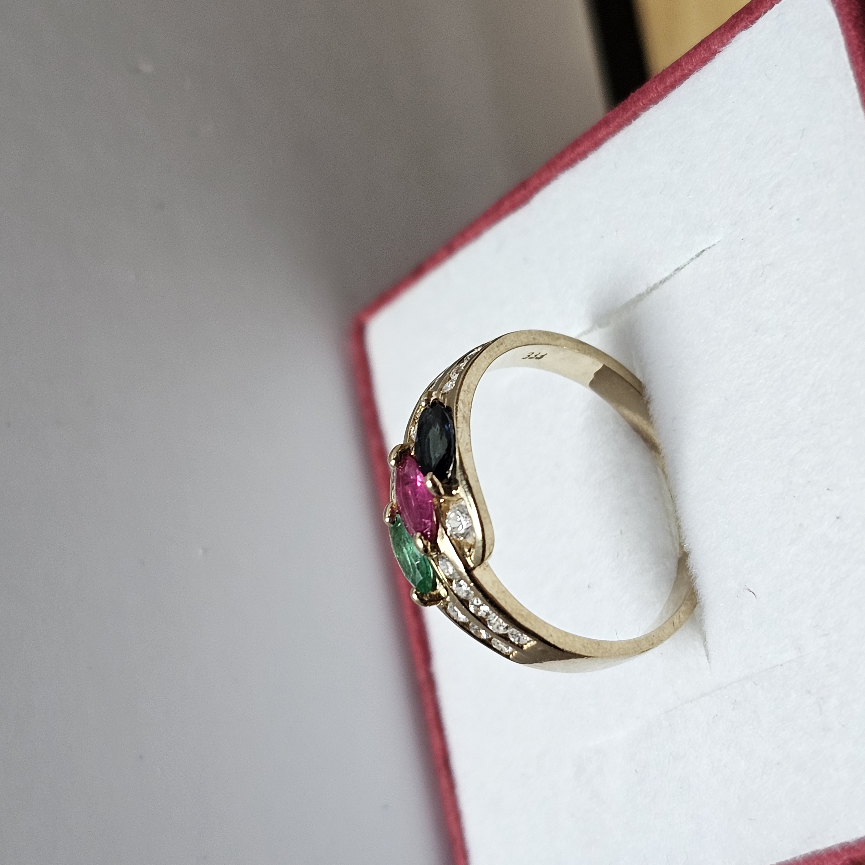 16,9 mm Ring Gold 333 Saphir Rubin Smaragd Kristallsteinchen klar Design Vintage elegant GR353