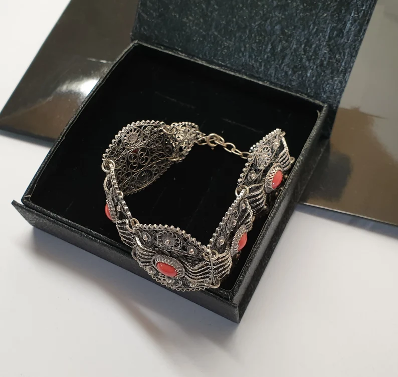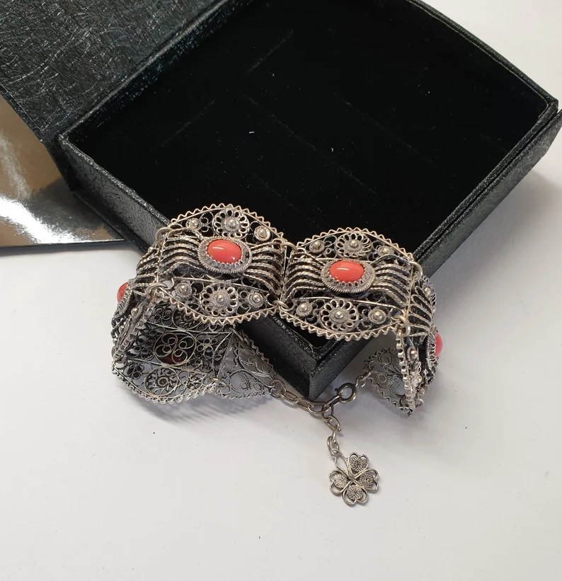 Ein tolles Vintage-Gliederarmband. Sehr aufwendige feine Silberschmiedekunst aus Silber 800 (geprüft). Die Glieder sind in einem aufwendigen Design gearbeitet und mit Karneol-Steinen verziert. Ein tolles und seltenes Schmuckstück!