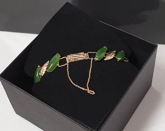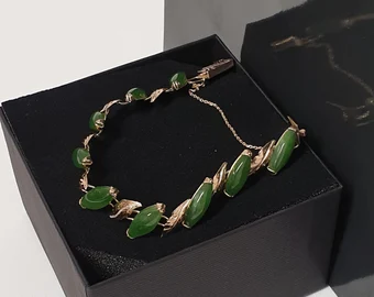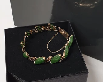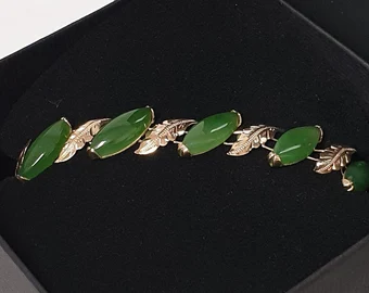 Tolles Gliederarmband mit einem außergewöhnlich schönen Blätter Design. Gefertigt ist das schöne Stück aus 585er Gelbgold und mit Jade Steinen besetzt.