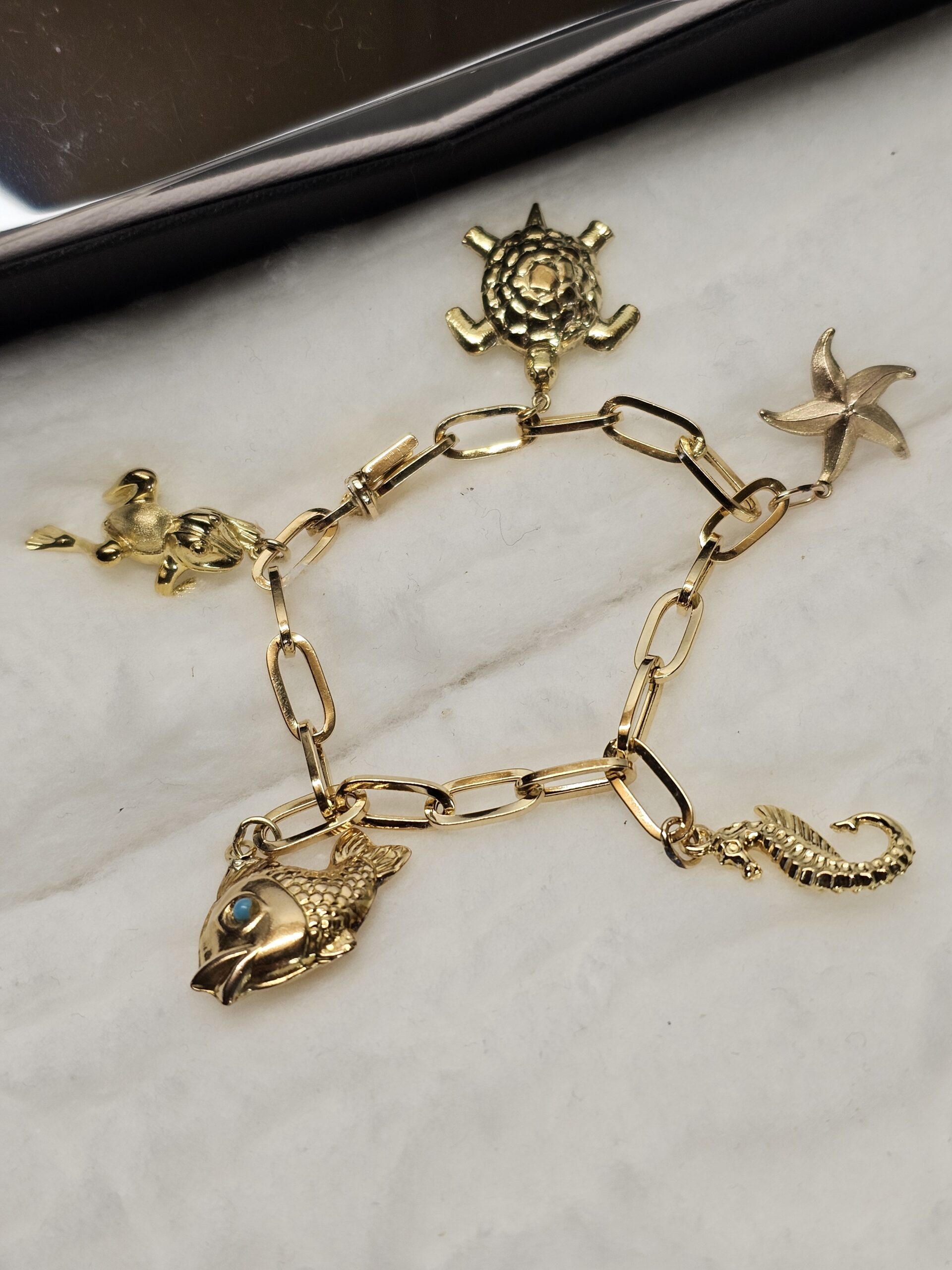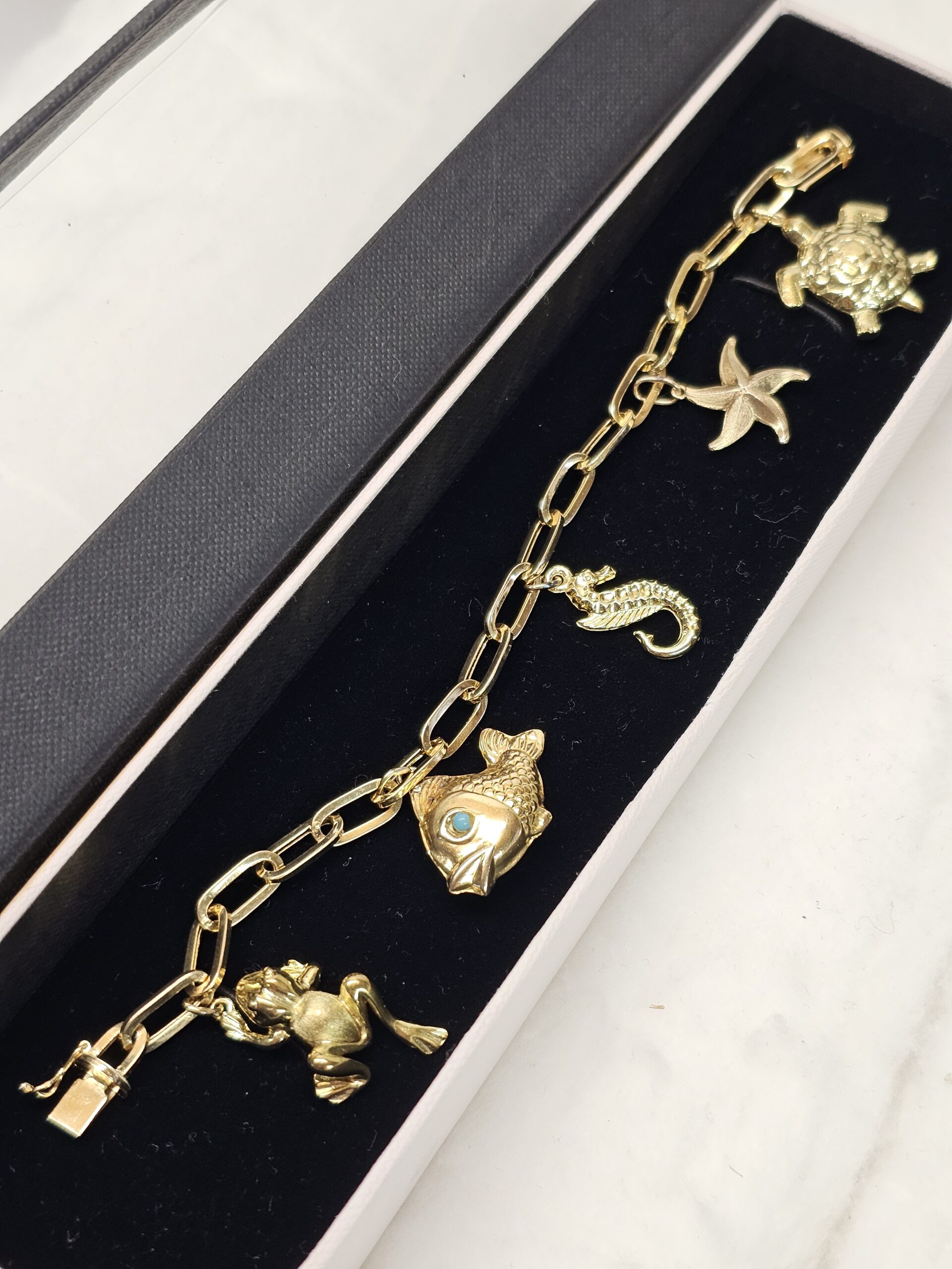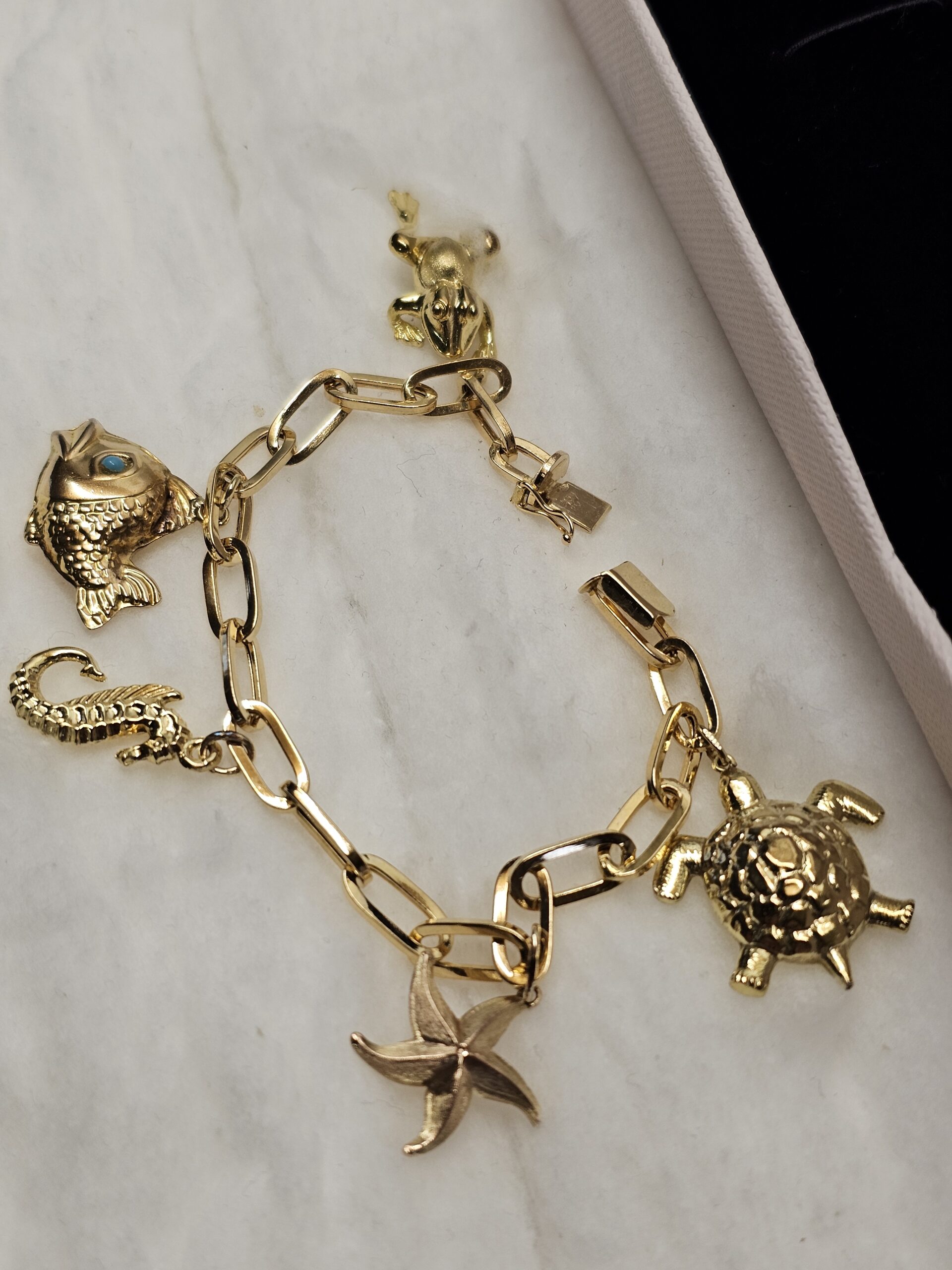 Ein sehr schönes Schmuckstücke! Goldarmband / Gliederarmband als Bettelarmband aus Gold 585. Bestückt ist das schöne Stück mit insgesamt 5 Stck. Anhänger wie Schildkröte, Seestern, Seepferdchen, Fisch und Frosch. Die Anhänger sind aus Gold 333 hergestellt, der Fische hat Augen aus hellblauem Achat-Stein. Das Armband ist mit einem tollen Gliederdesign gestaltet.
