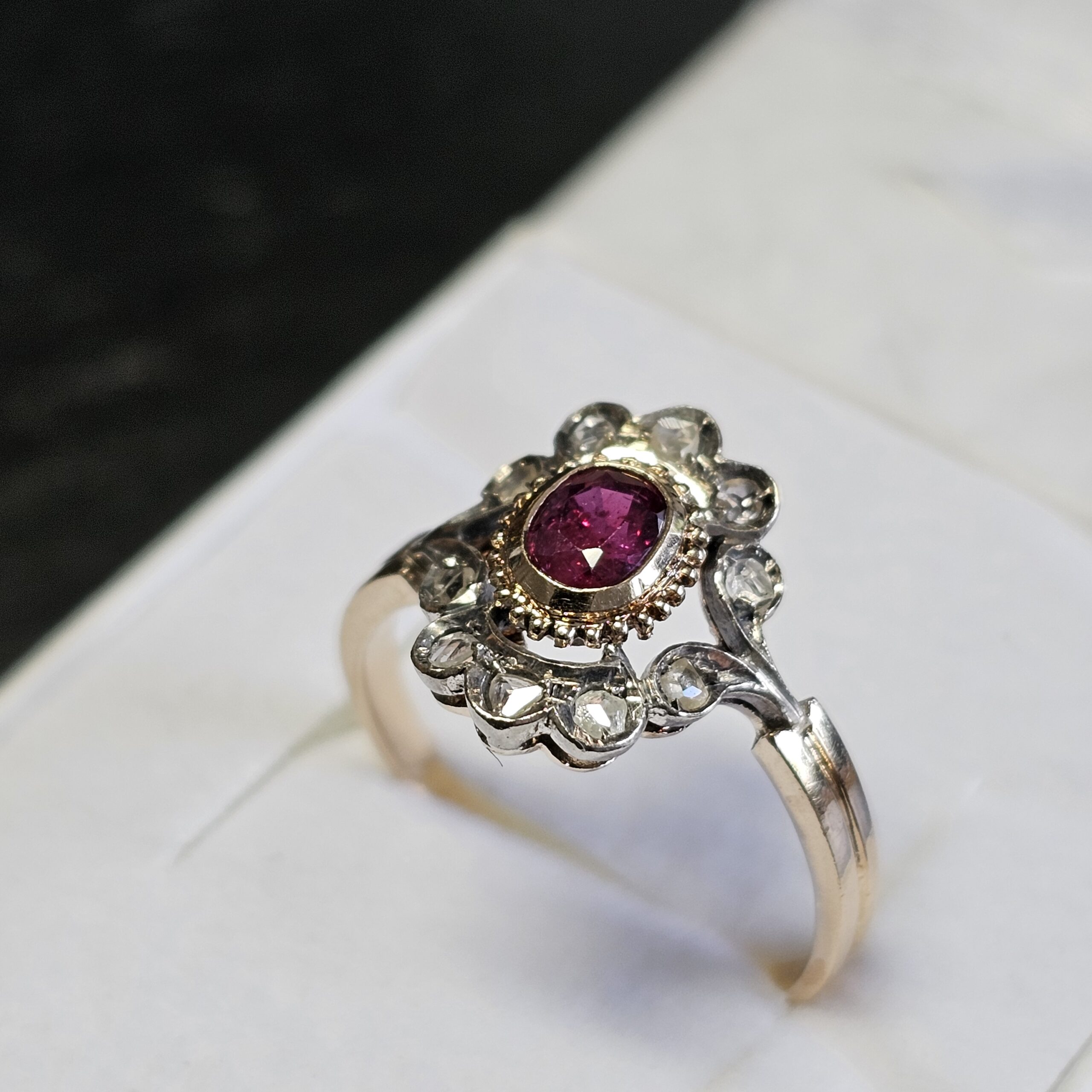 Nostalgisch hübscher Shabby Vintage Ring / Goldring Gold 585 mit Teilplatinierung. Er ist mit einem Rubin mittig besetzt und trägt 10 Stck. Diamantsteinchen, naturbelassen, als Umrandung.