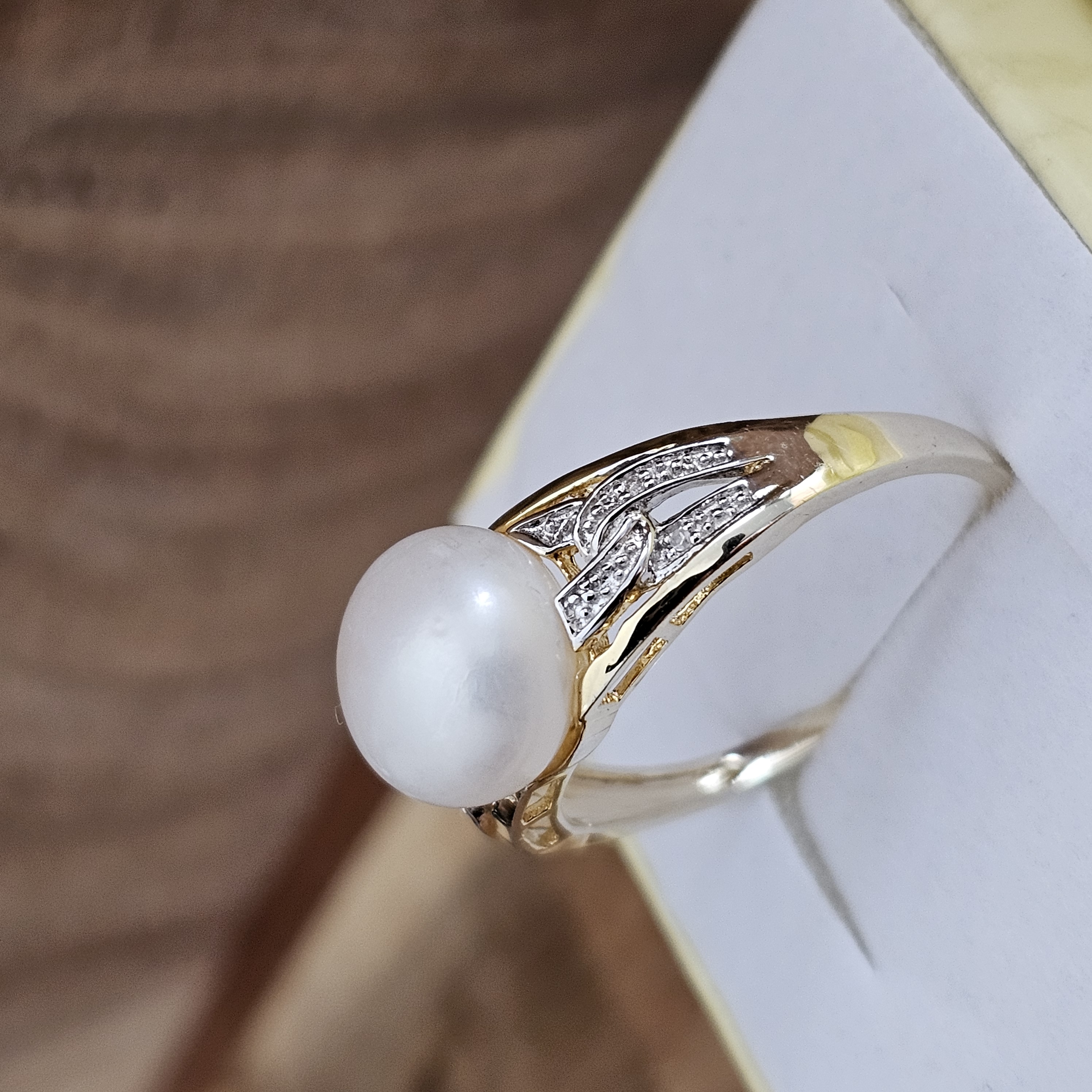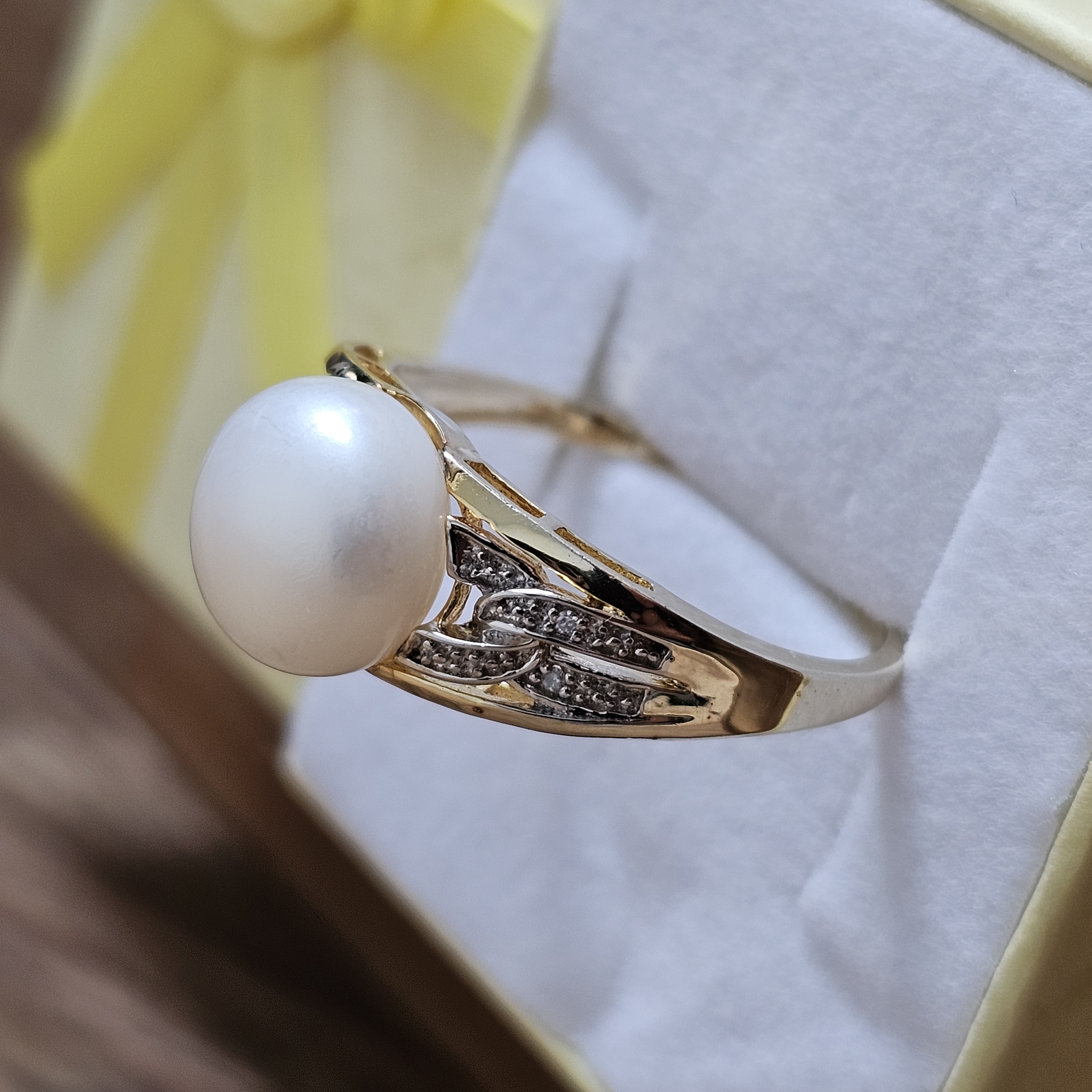 Toller Ring Silber 925 vergoldet. Wunderschöne Gestaltung mit einer hübschen Perle verziert. Seitlich neben der Perle wird das Design auf jeder Seite von je 2 Stck. kleinsten Diamantsteinchen geschmückt.
