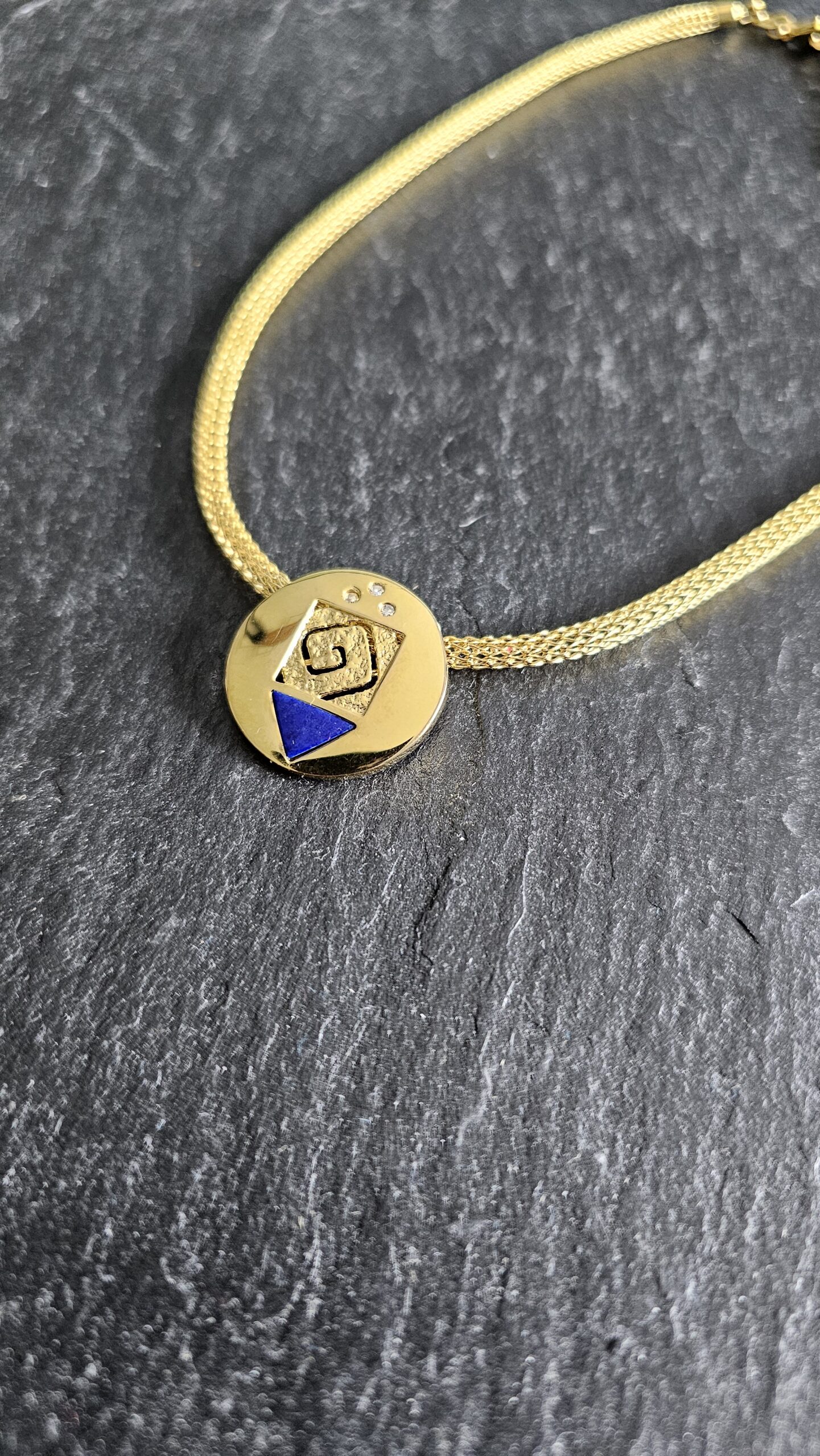 Tolles modisch stylisches Set. Kette mit Anhänger aus Gold 375. Kunstvolle Eleganz. Die Kette ist in einem gewebten Design gestaltet. Der runde Anhänger besticht durch sein modisch extravagantes Design und ist mit einem Dreieck aus Lapislazuli geschmückt. Die Ösen sind rückseitig angebracht, dadurch liegt der Anhänger unheimlich schön beim Tragen an. Mittig ist er mit einem durchbrochen gestalteten Design ausgearbeitet. Die drei kleinen Diamantsteinchen runden die Eleganz des Schmuckstückes ab.