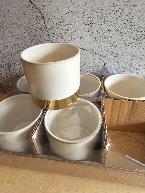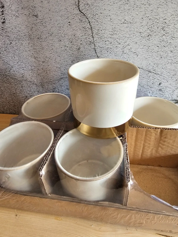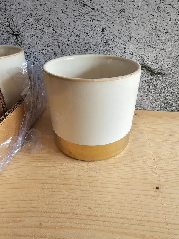 Ideal für all unsere Babyplants! 6 St. Übertopf Juna weiß / gold Maße: groß - 10 x 9,5cm (h) Farbe: weiß glasiert mit goldenem Fuß