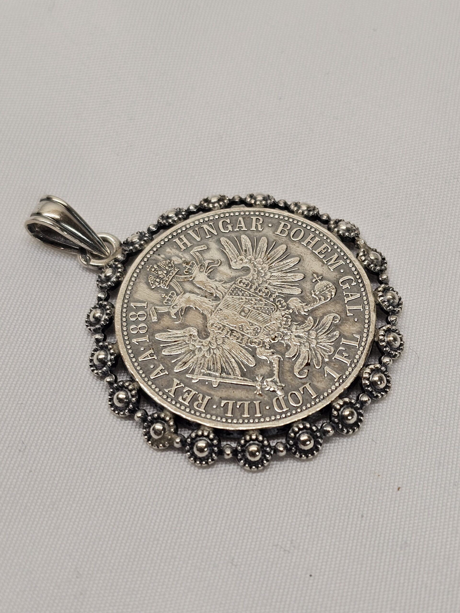Sehr schöner Anhänger / Charivari-/Schürzen-Anhänger. Silber-Münze Silber 900. Auf der einen Seite eine Abbildung von Franz Josef I., Kaiser von Österreich mit der Aufschrift FRANC·IOS·I·D·G·AVSTRIAE IMPERATOR und auf der anderen Seite das Wappen mit der Aufschrift HUNGAR· BOHEM· GAL· 1 FL LOD· ILL· REX A· A· 1881.