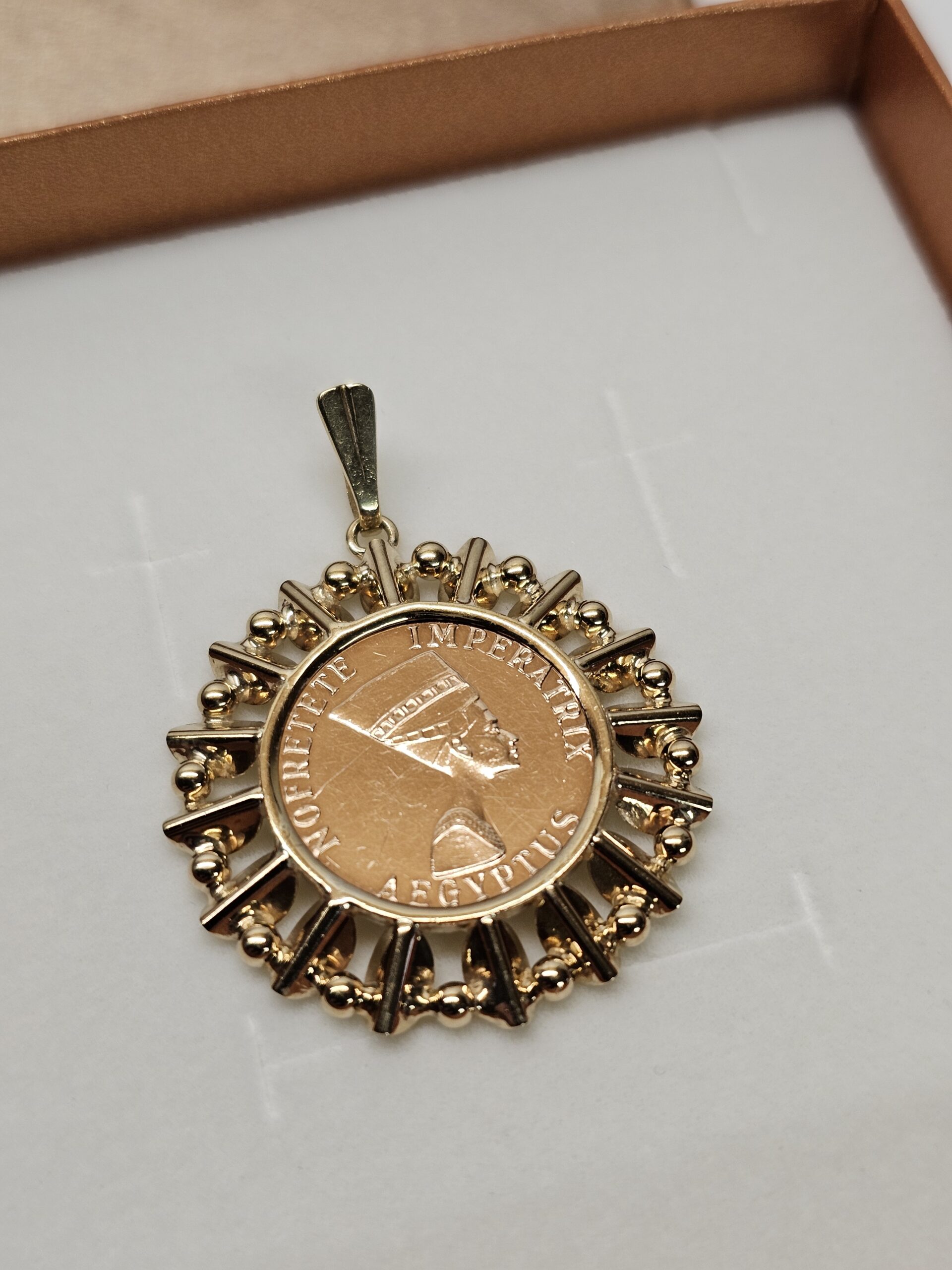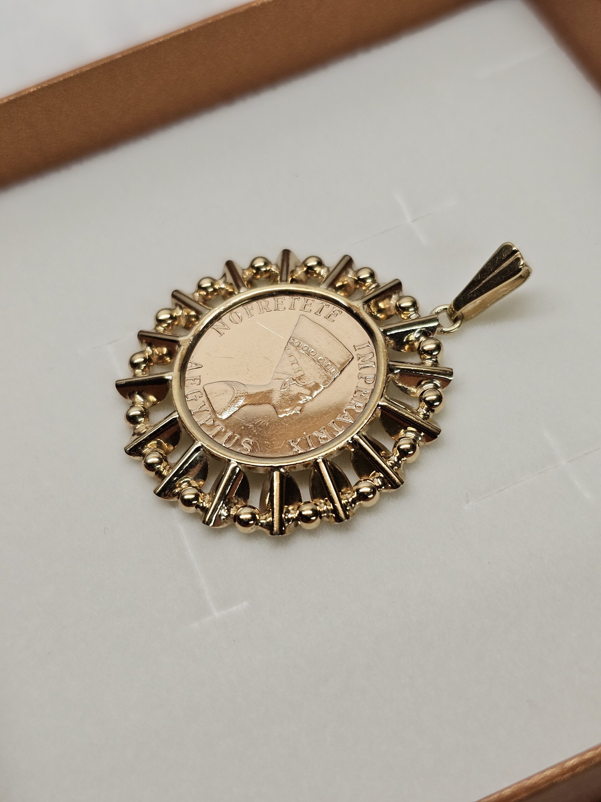 Wunderschöner nostalgischer Anhänger Gold 333 mit einer Abbildung vorne von Nofretete, Königin von Ägypten und mit der Aufschrift umrandet “Nofretete Imperartix Aegyptus”.