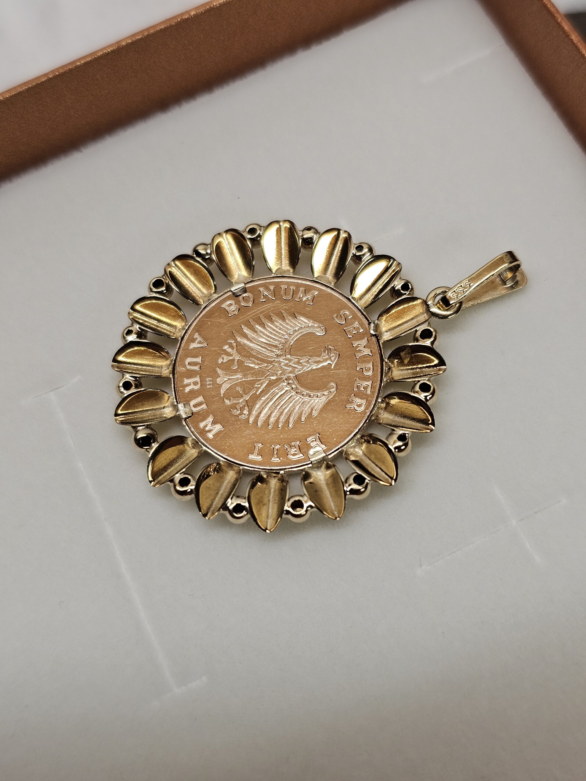 Auf der Rückseite ist ein Adler abgebildet um randet mit der Aufschrift “Bonum Semper Erit Aurum”.
