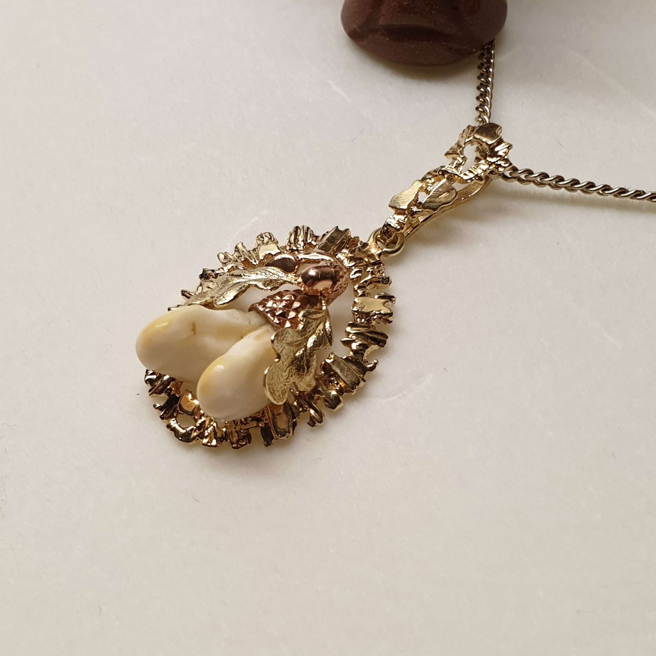 Toller Trachtenanhänger in 585 Gelbgold. Die wunderschöne Goldschmiedearbeit mit Blättermotiv trägt zwei Grandeln und wurde in Gelbgold, teils in Rotgold gearbeitet.