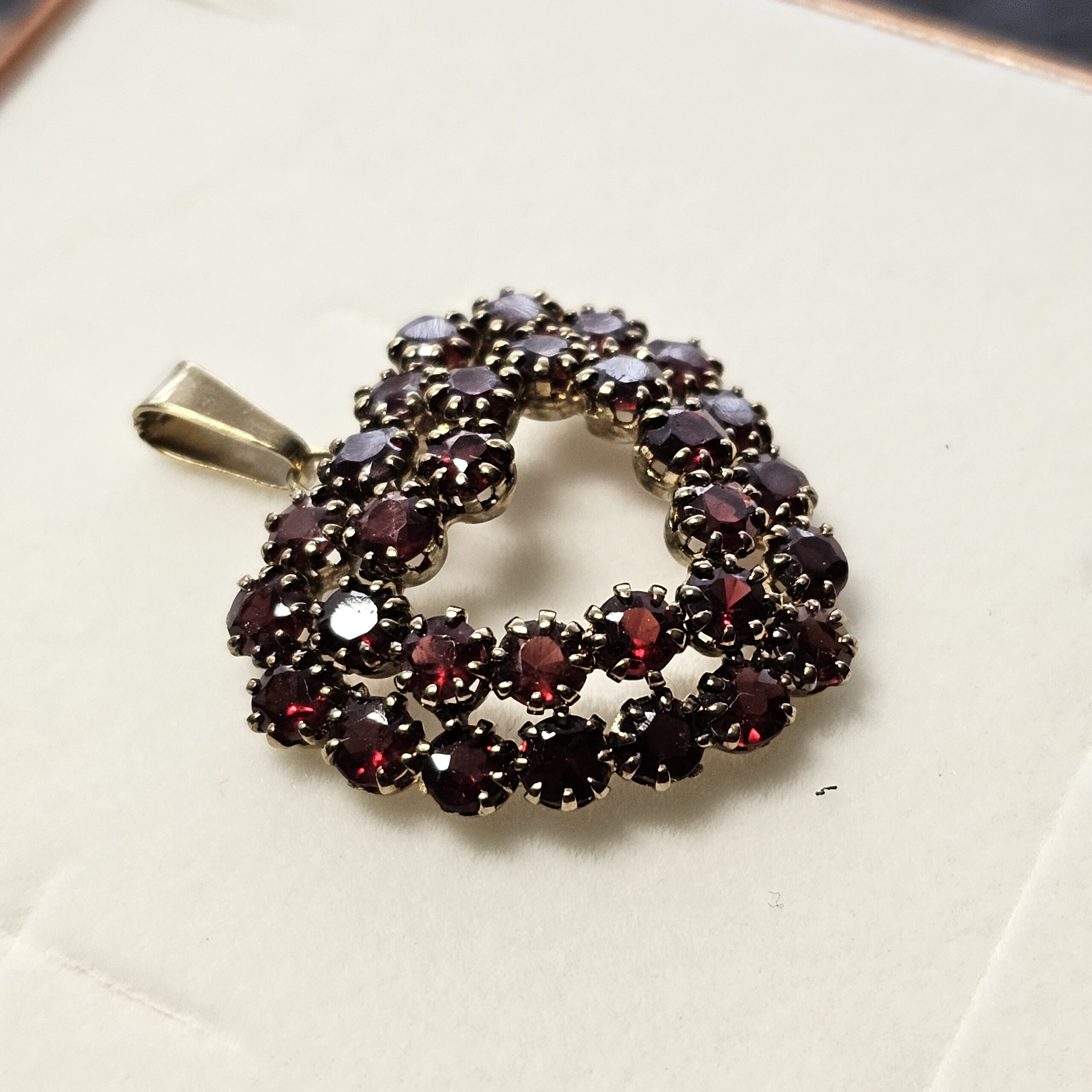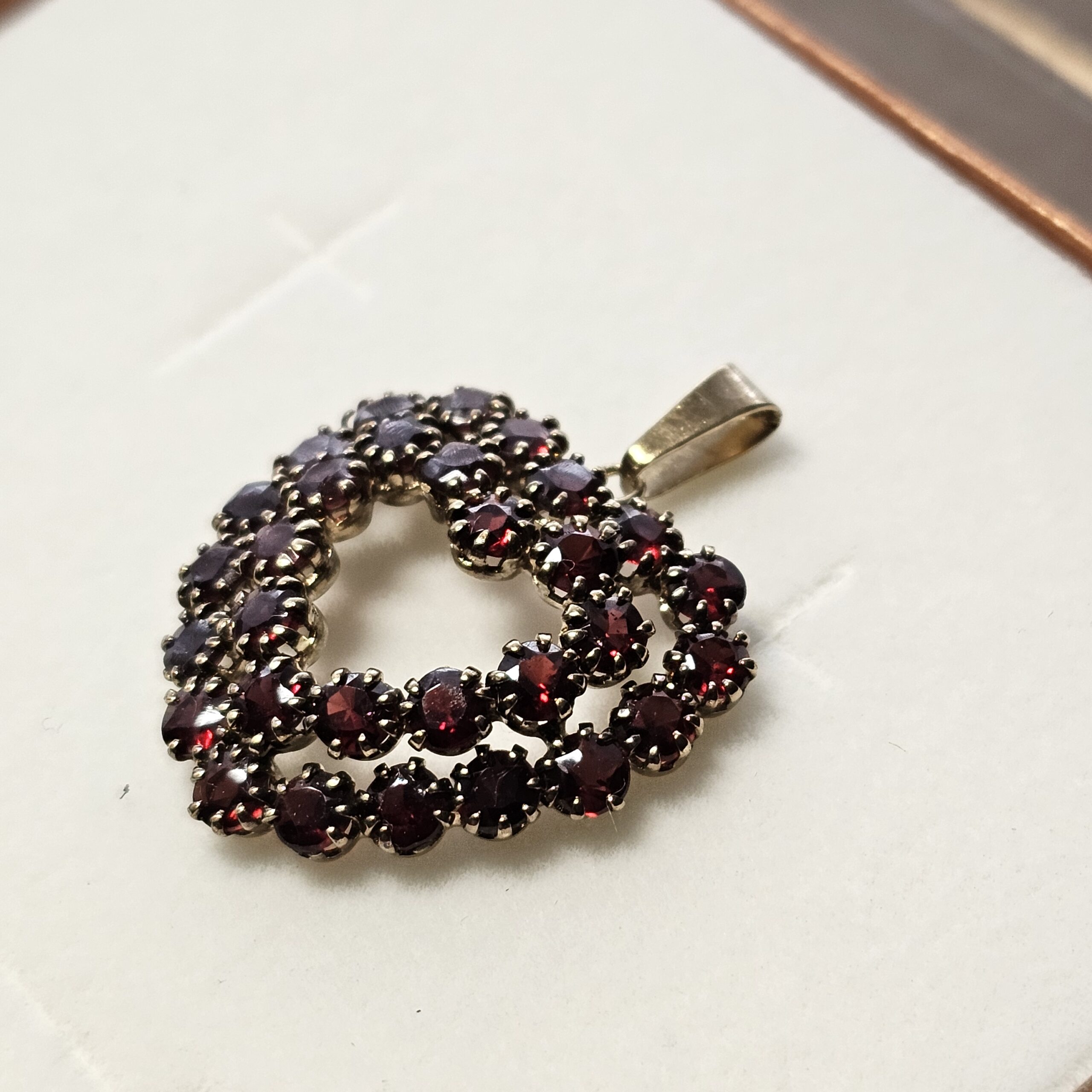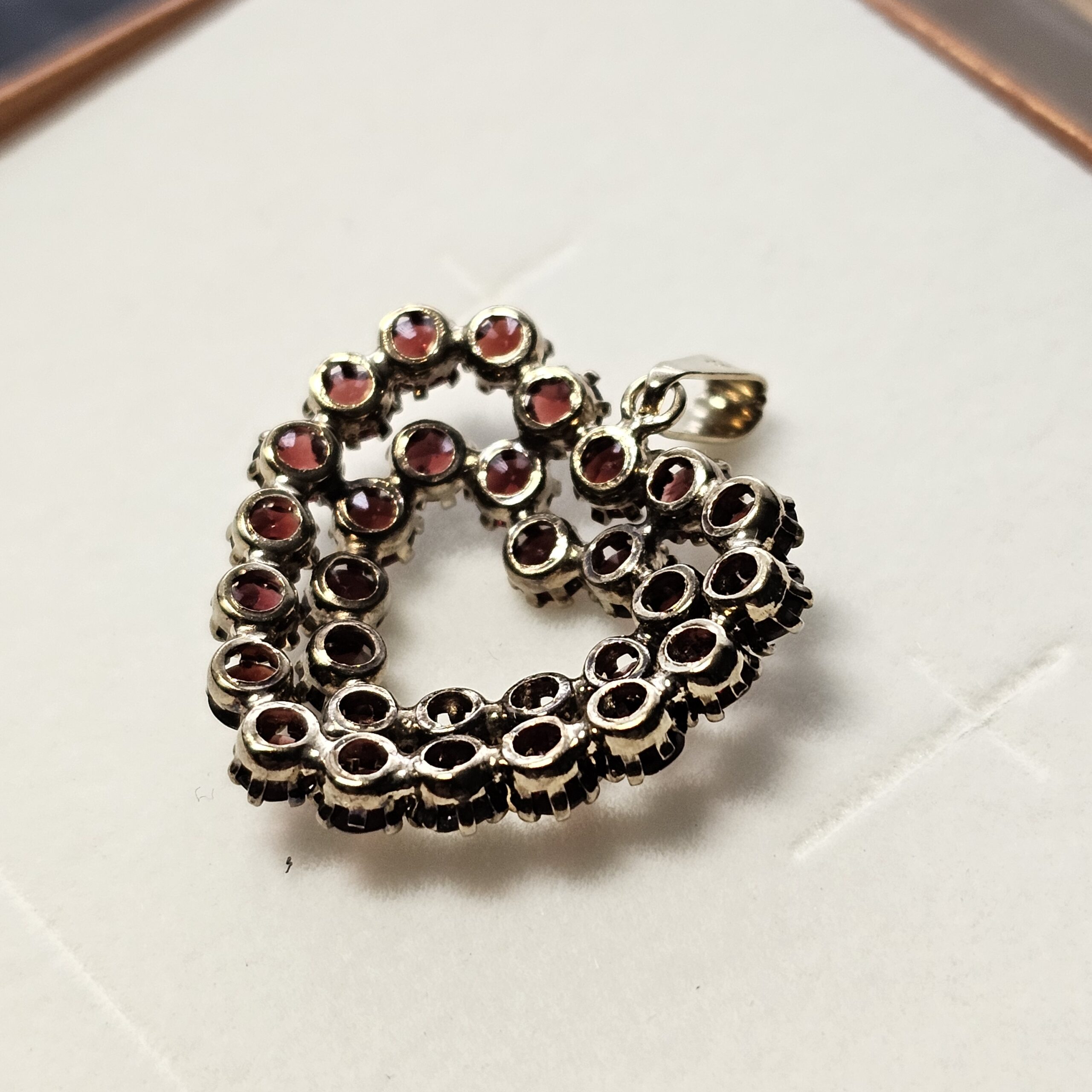 Shabby-Vintage-Anhänger Herz mit Granatsteinen besetzt. Eine wunderschöne Größe, schönes Design, mittig etwas erhöht gearbeitet. Ein traumhaft schönes Schmuckstück.