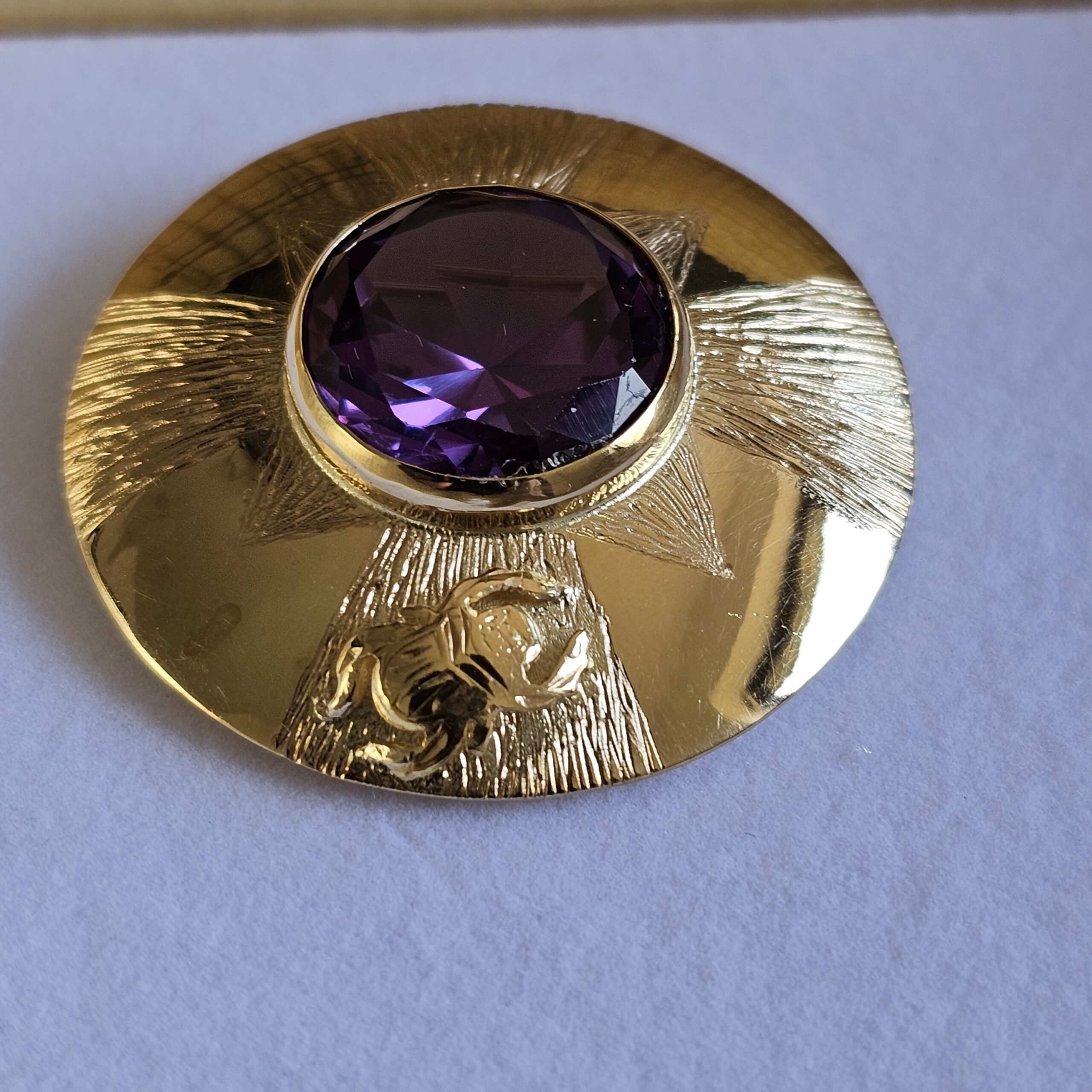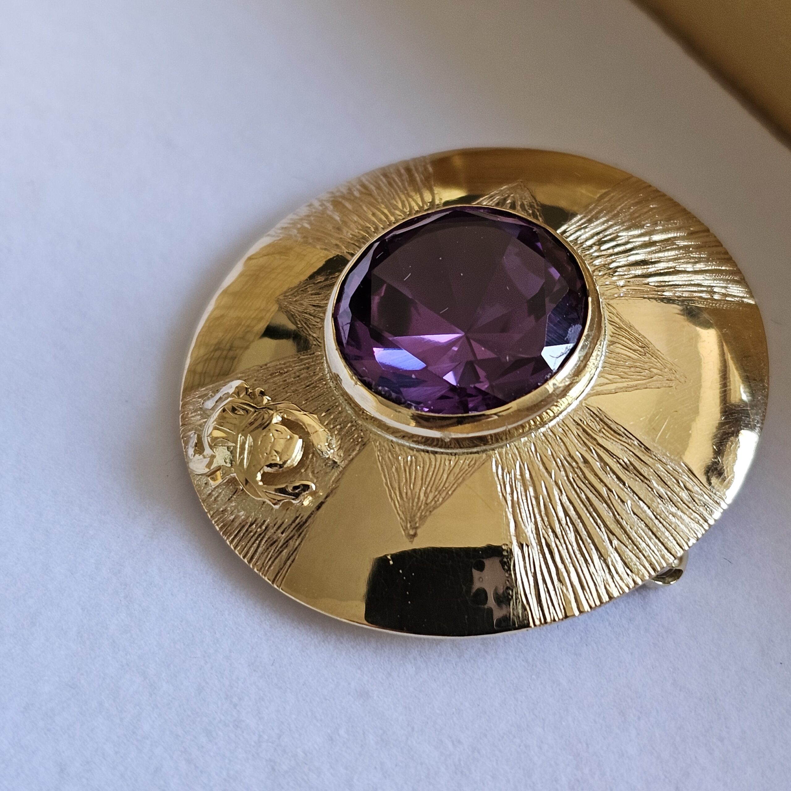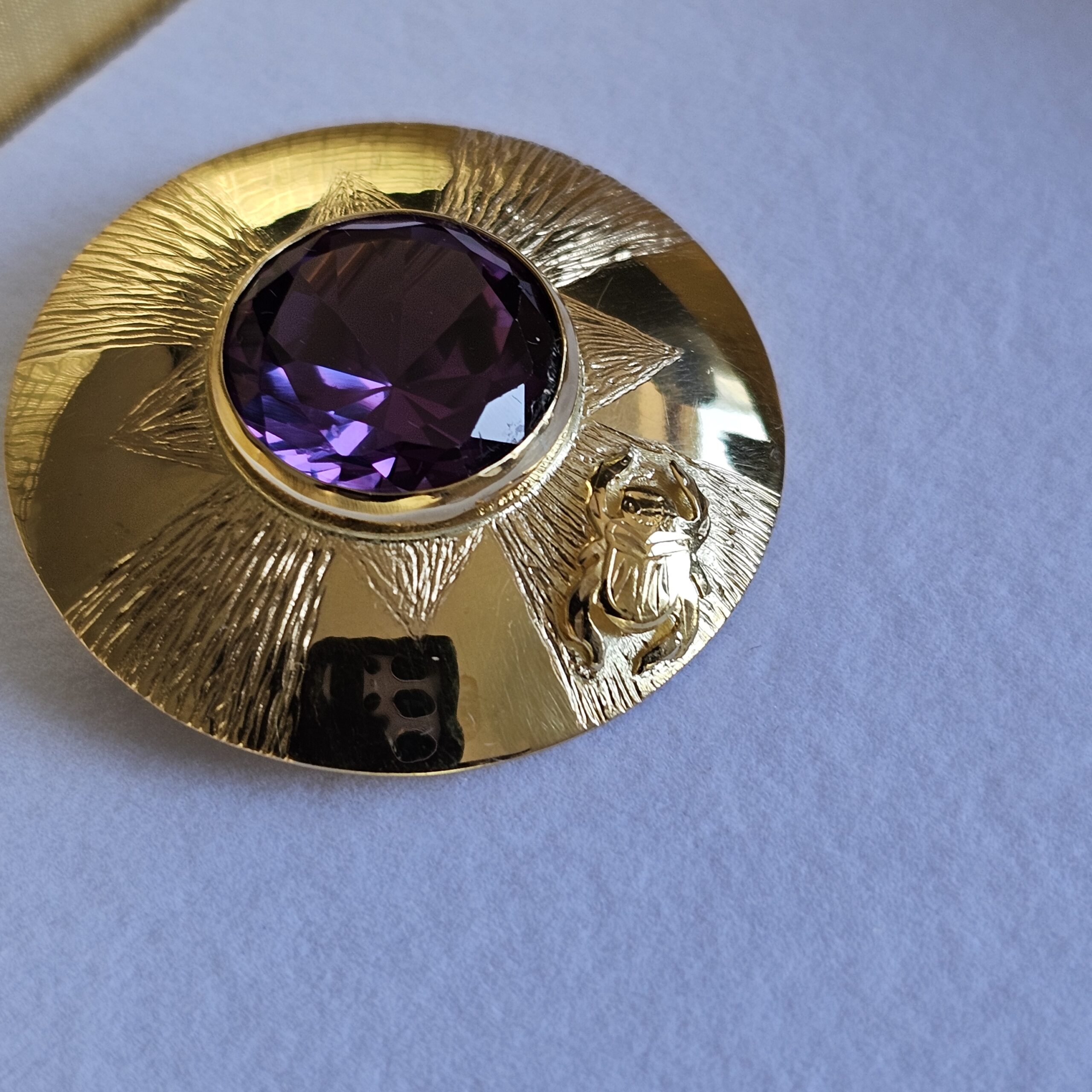 Toller Anhänger, der auch als Brosche getragen werden kann. Das schöne Stück ist mit einem ägyptischen Amethyst geschmückt. Am Rand des Schmuckstücks sind ein Skarabäus.