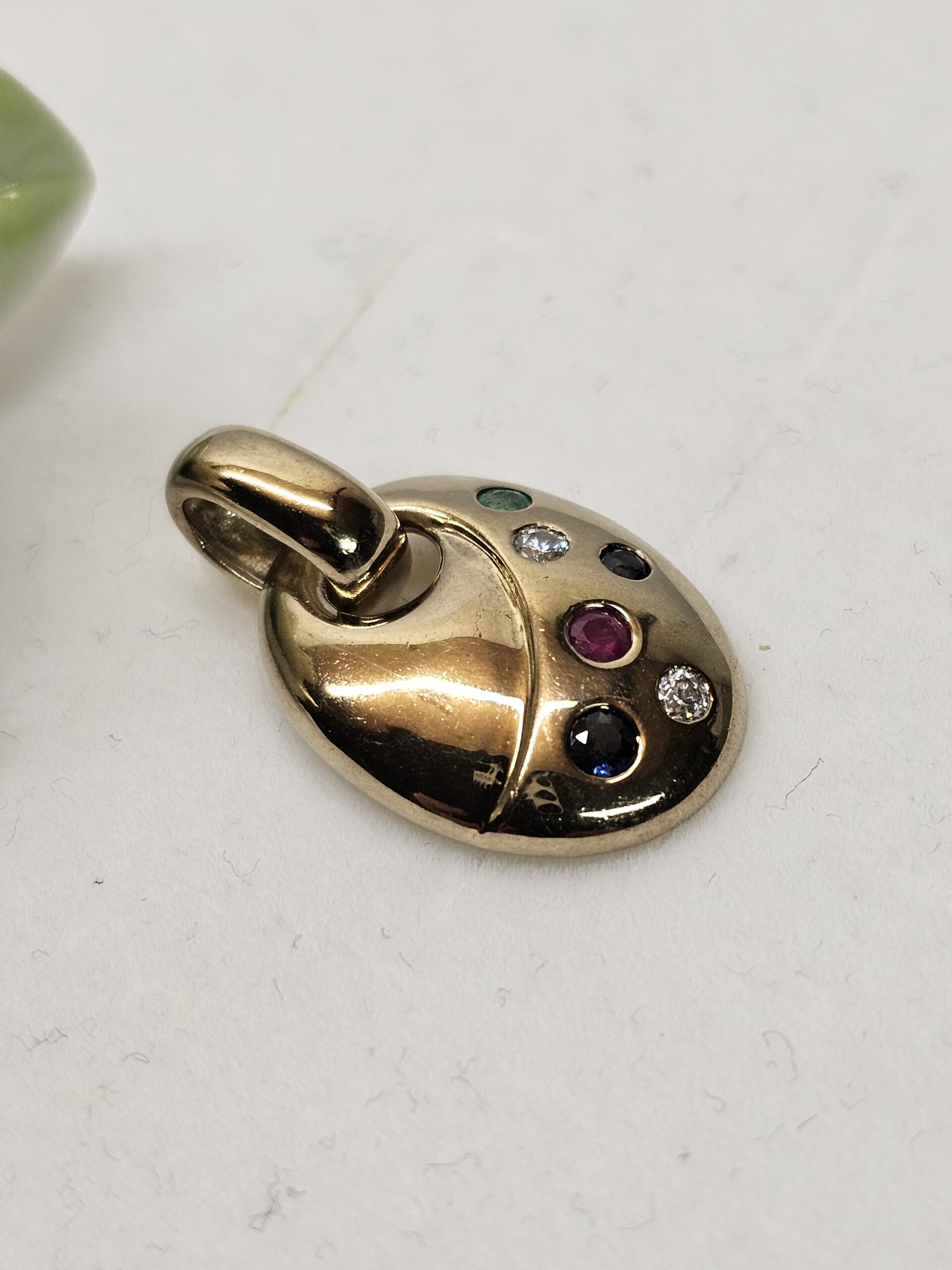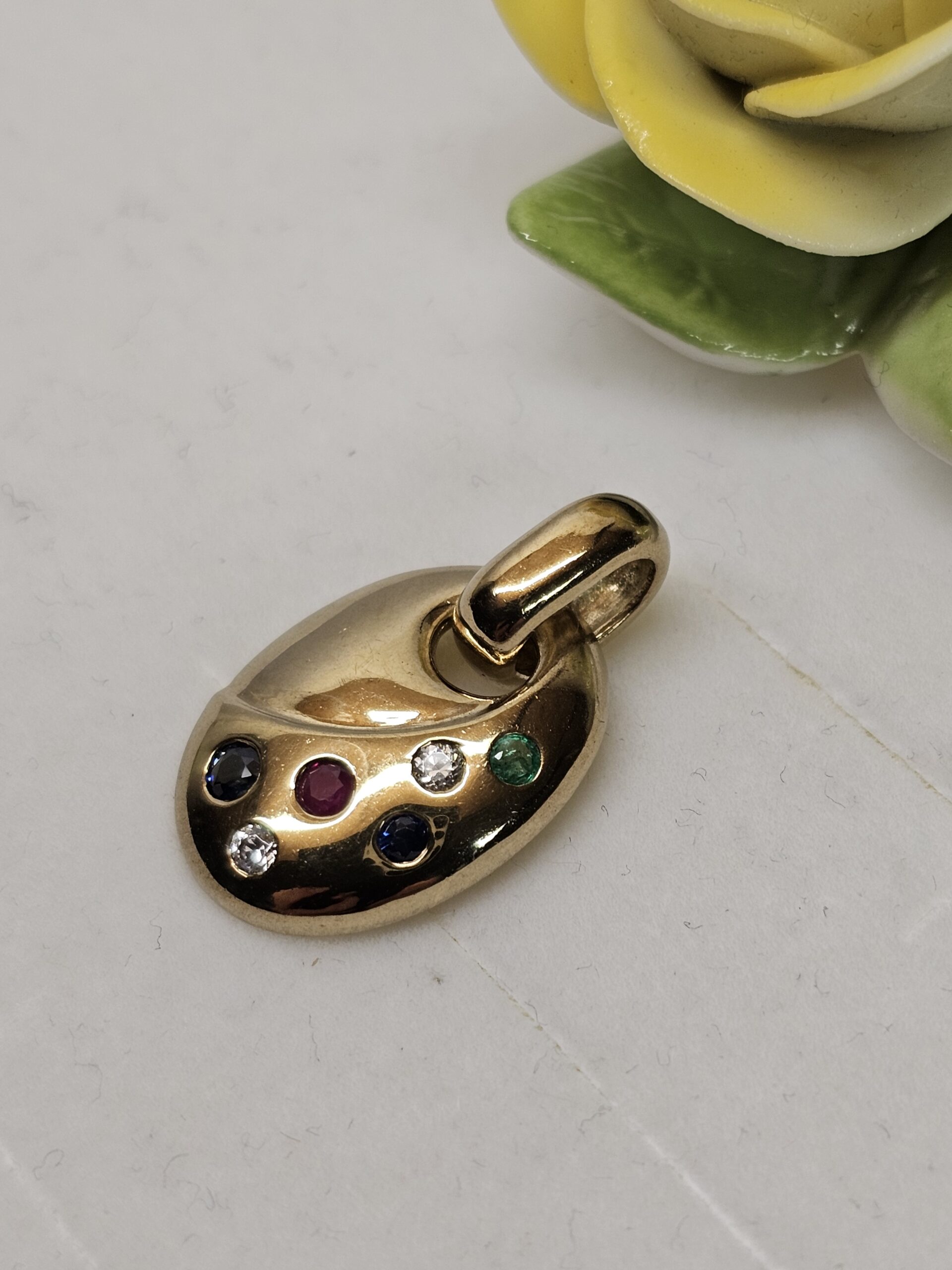 Schicker Anhänger aus Gold 333. Eine schöne Verarbeitung - tolles Design. Geschmückt ist der Anhänger mit einem Smaragd, einem Rubin, 2 Stck. Saphire und 2 Stck. klaren Kristallsteinchen.