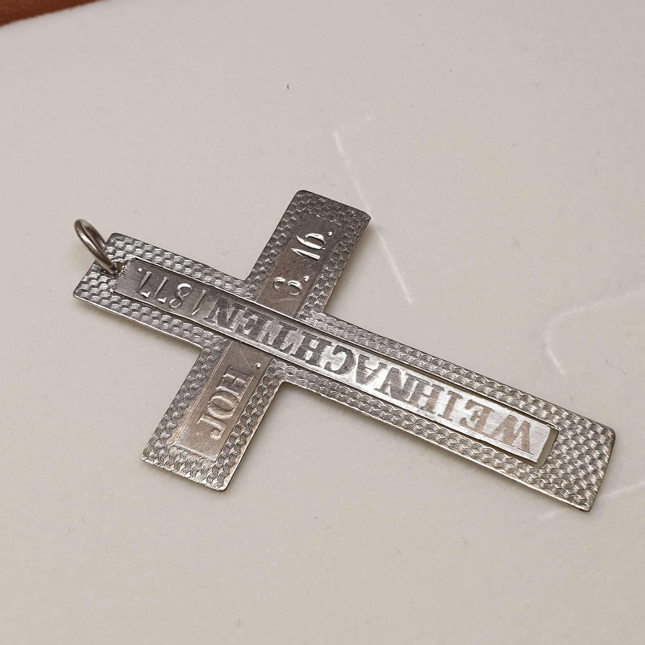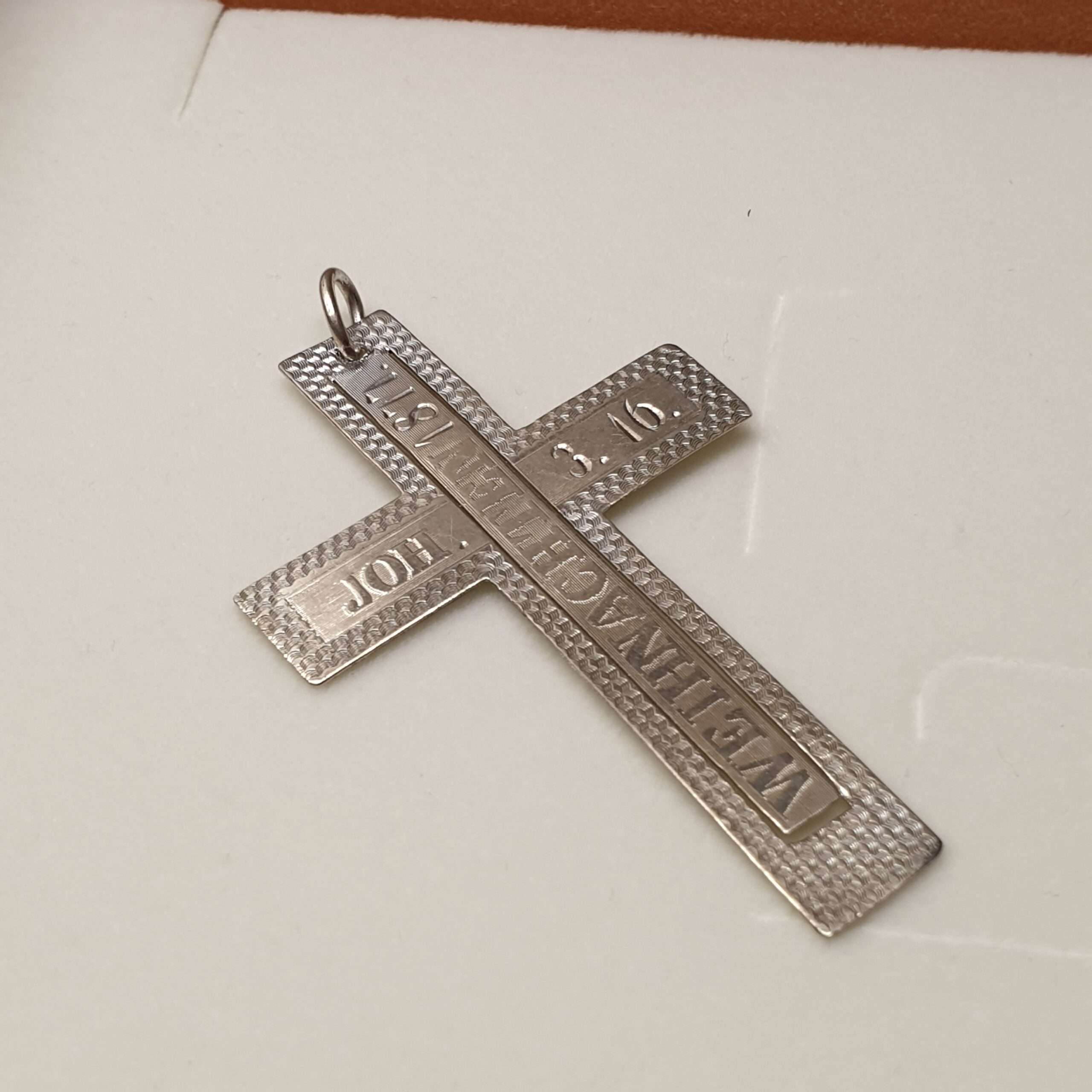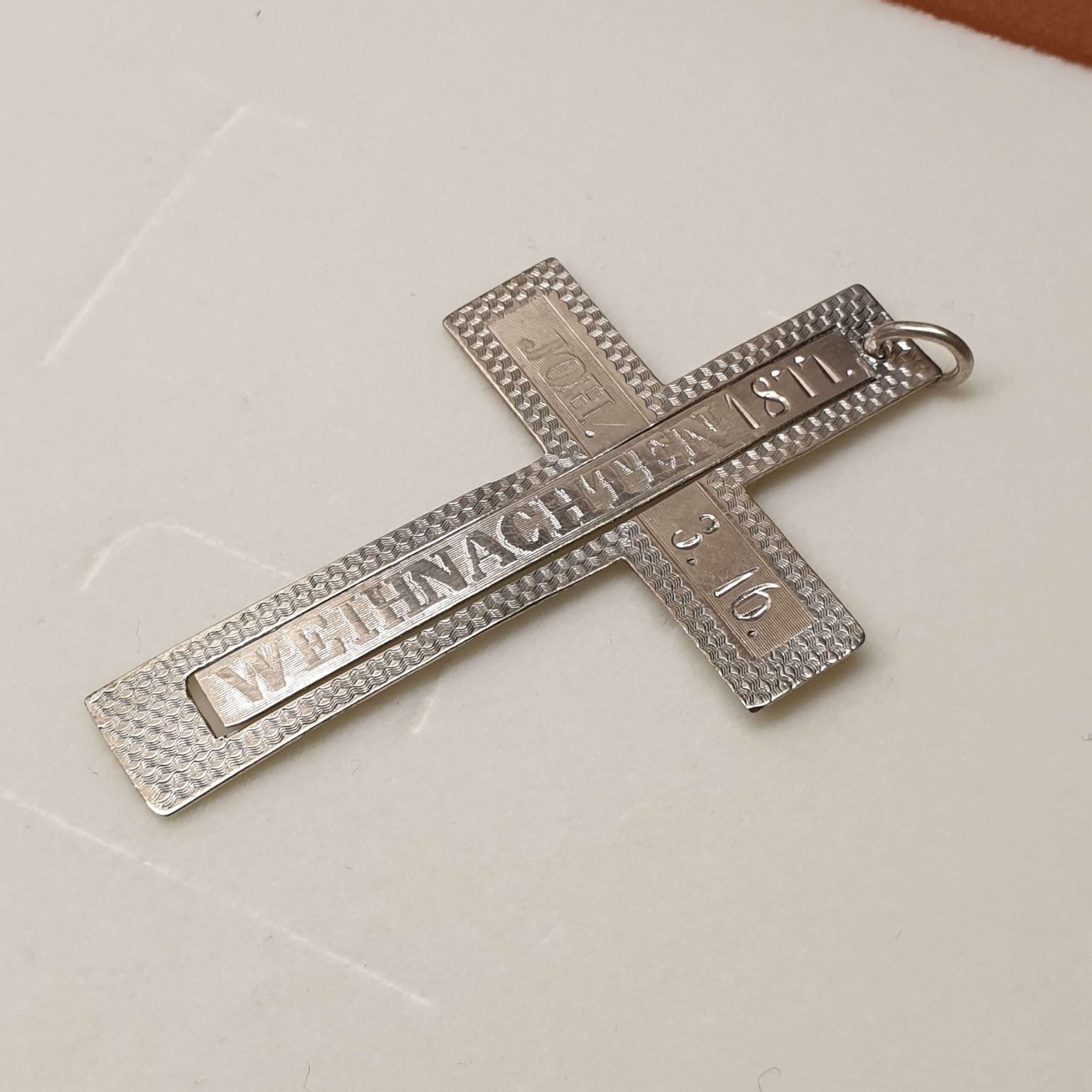 Produktinformationen "Anhänger Kreuz Weihnachten 1877 Joh. 3.16. antik Einzelstück Unikat Silberschmiede Kunst SKA1242"