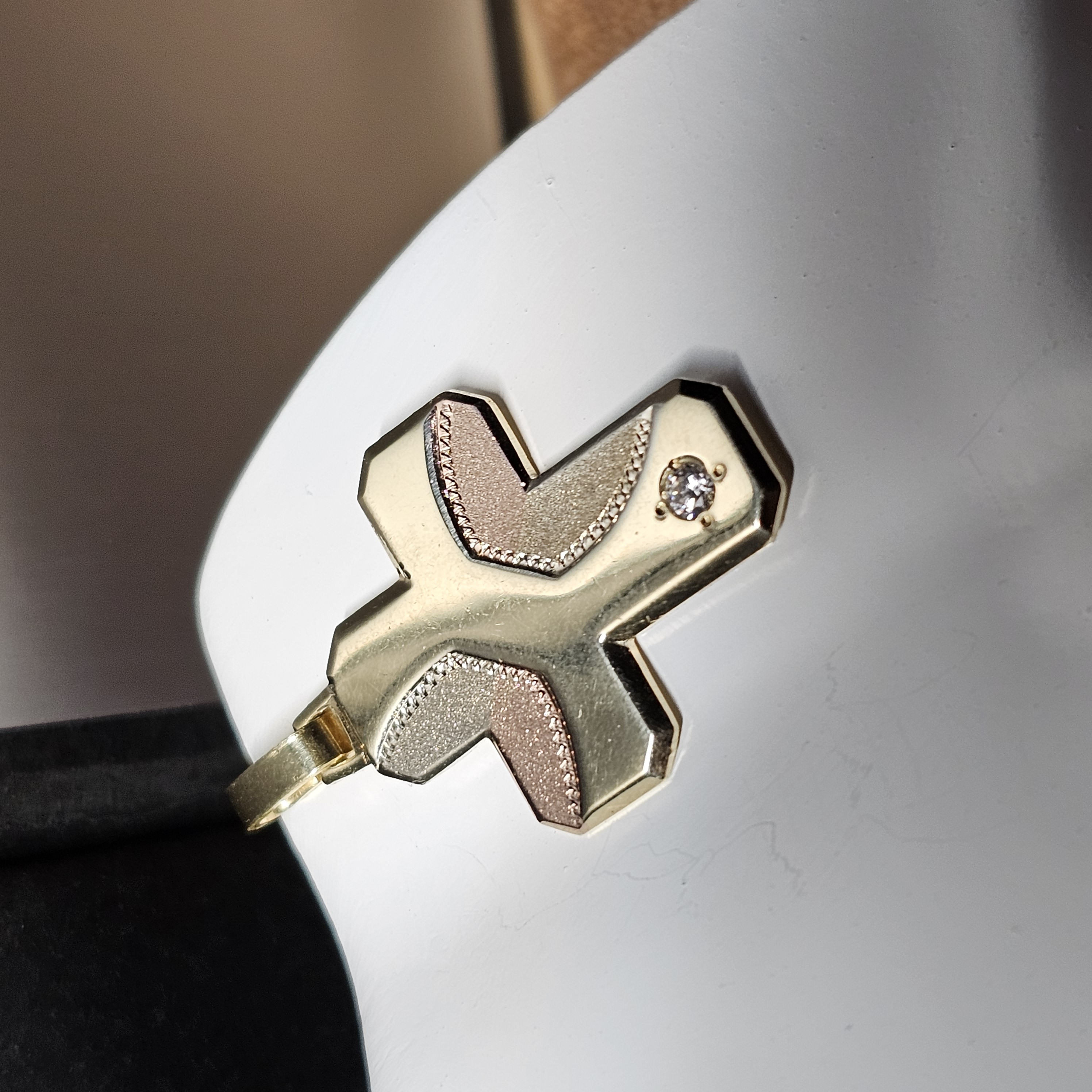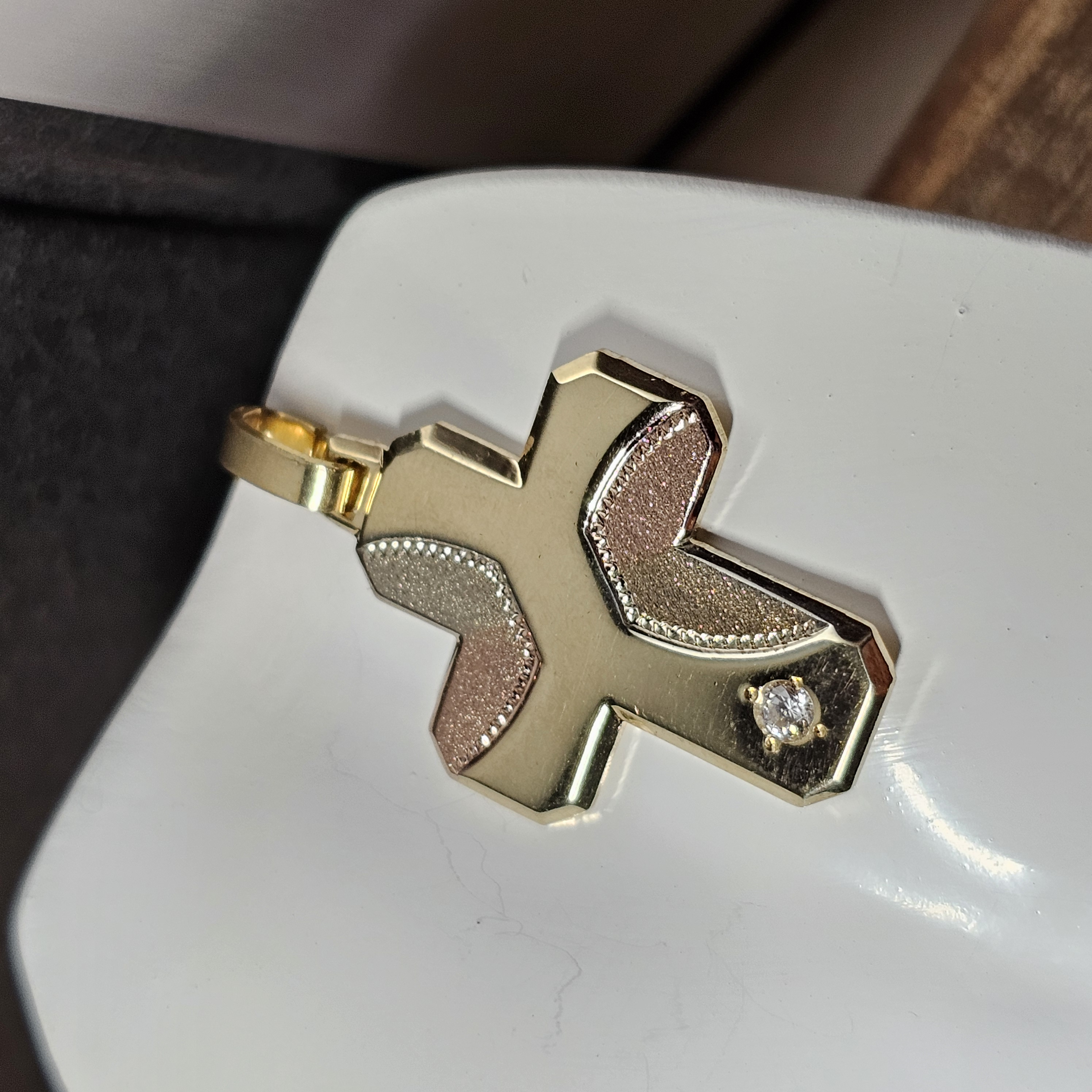 Kreuzanhänger aus Gold 585 massiv in einem wunderschönen bicolor Design gestaltet. Geschmückt ist das schöne Stück mit einem klaren Kristallsteinchen.