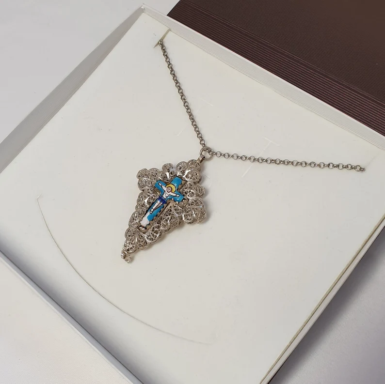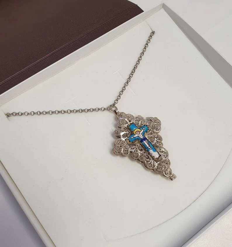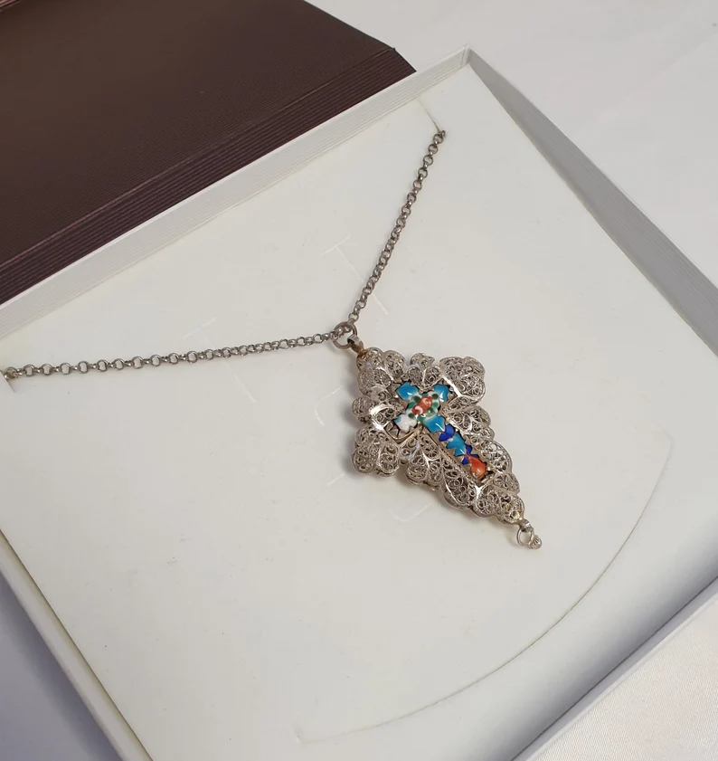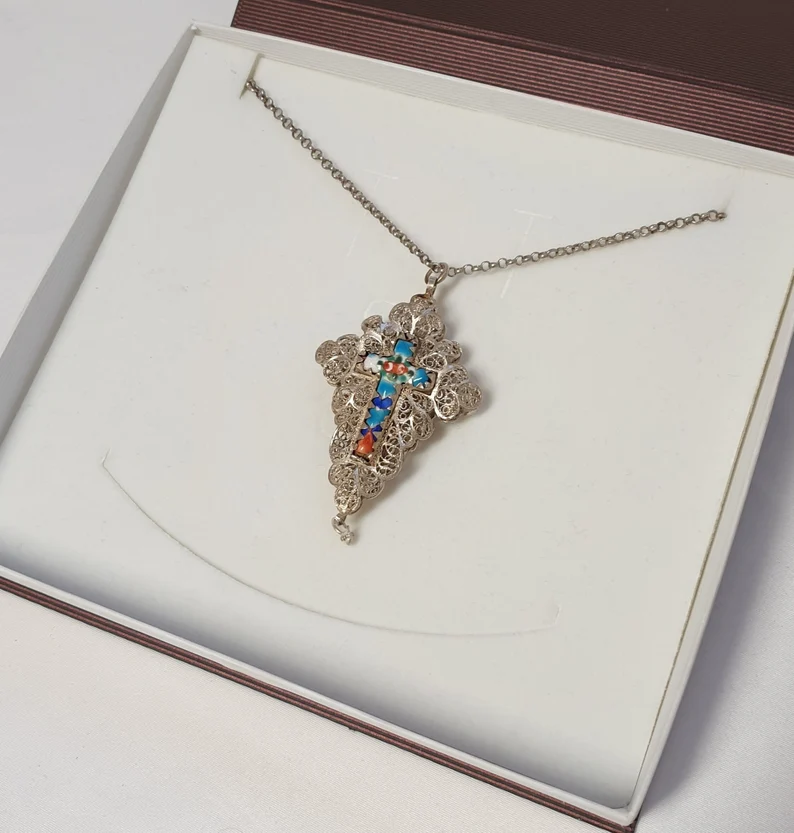 Produktinformationen "Anhänger antik filigran Kreuzanhänger für Rosenkranzkette Jesus Kreuz Silber Emaille bunt Shabby Vintage SKA968"