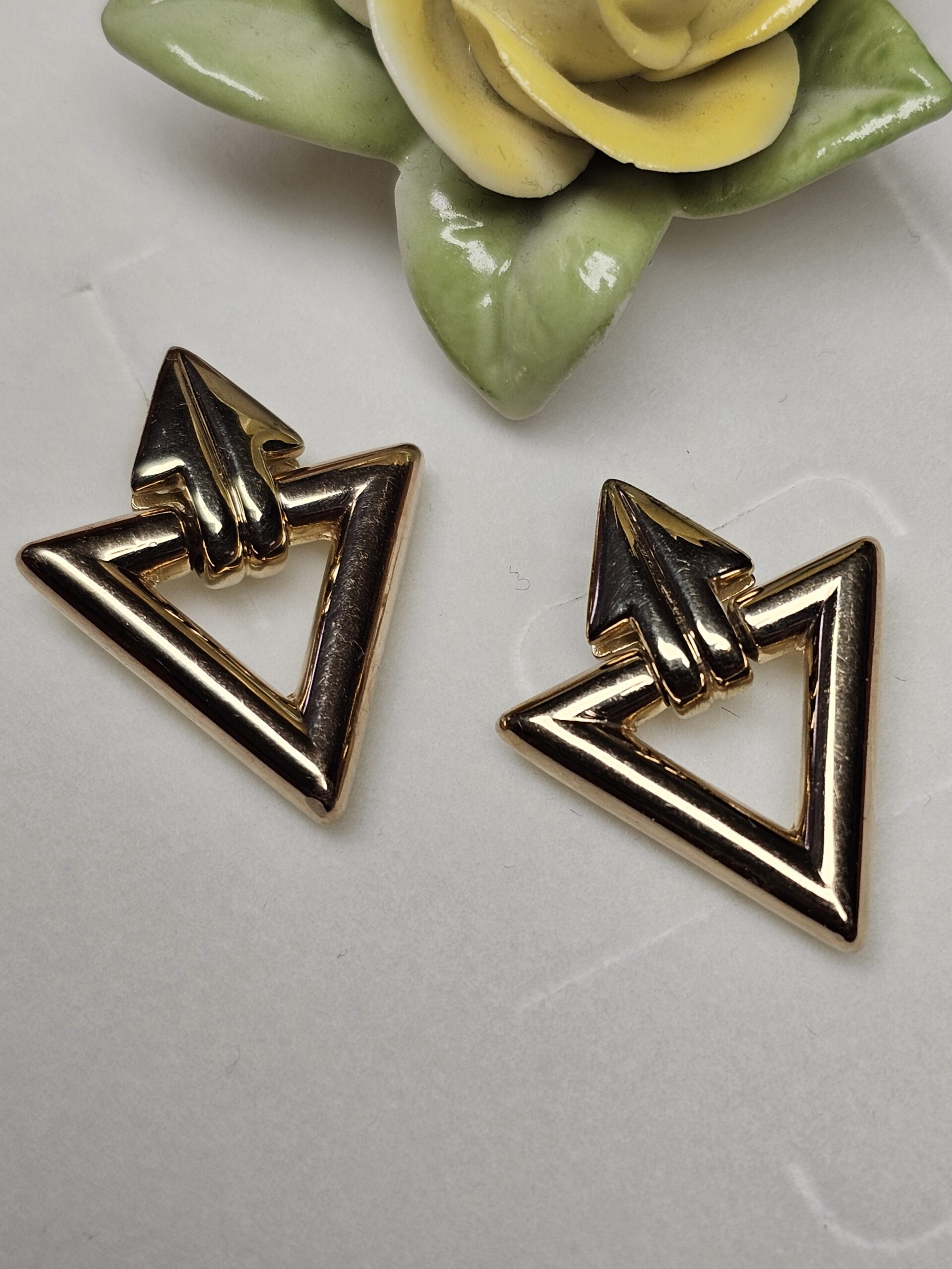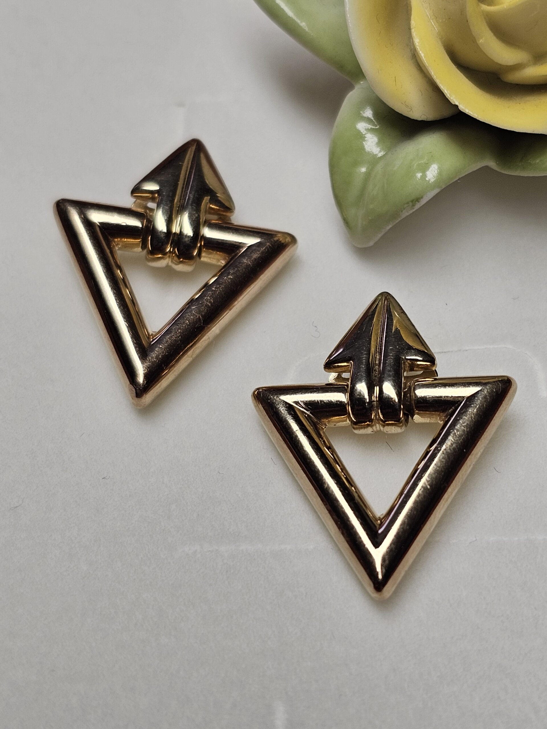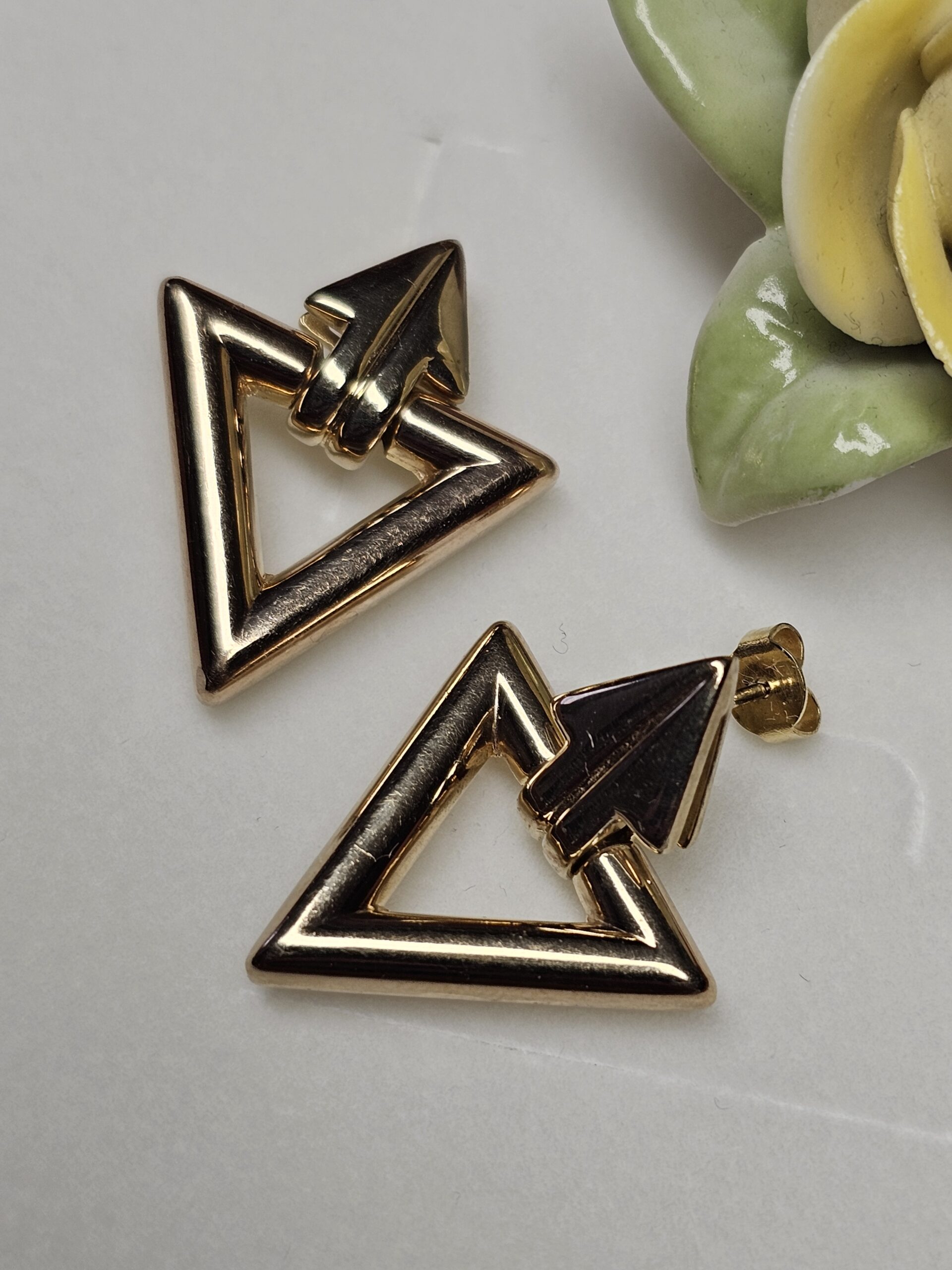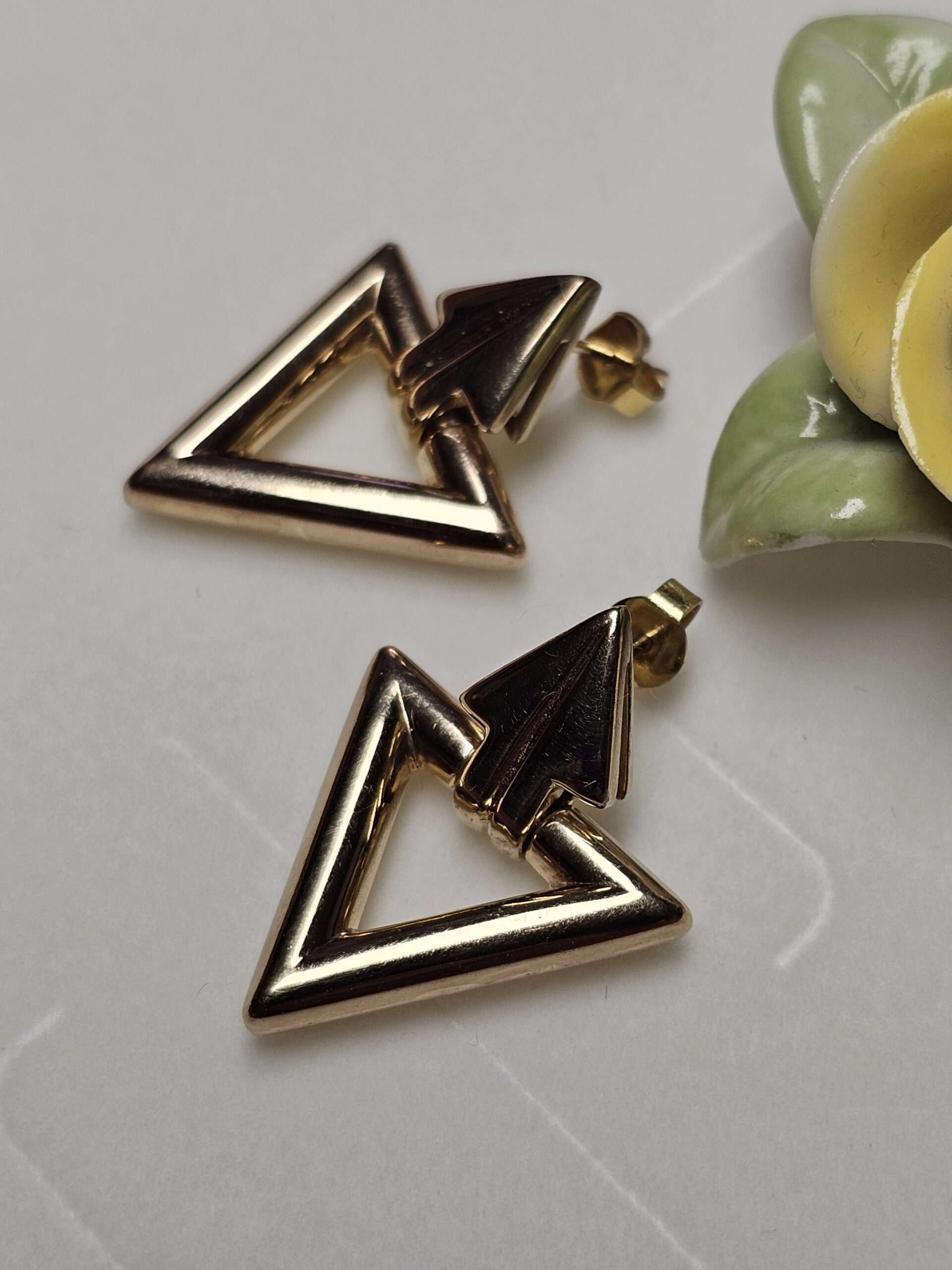 Tolle Vintage-Ohrringe aus Gold 333. Das obere Pfeile-Element ist fest am Ohrstecker angebracht und das untere Dreieck-Element ist beweglich.