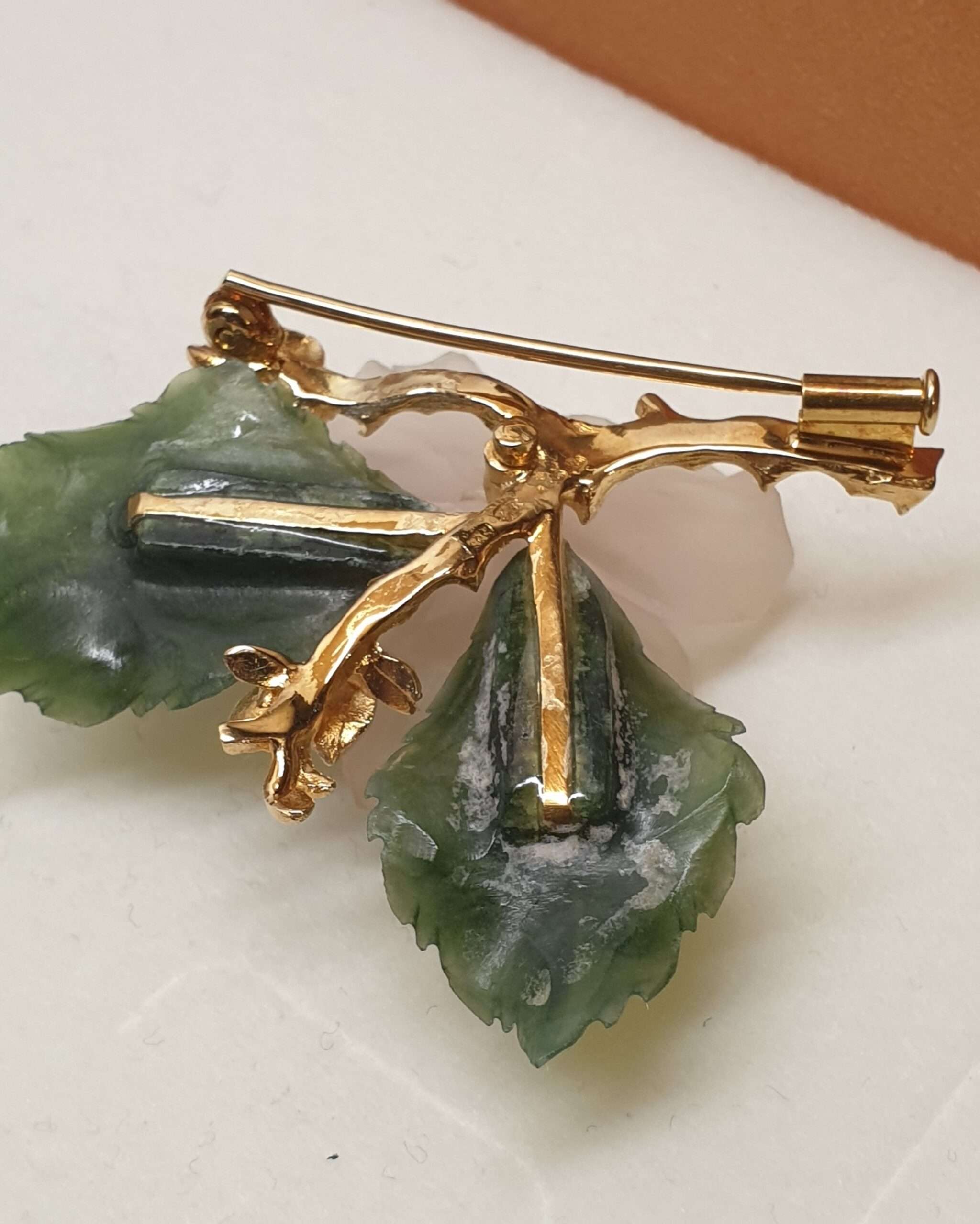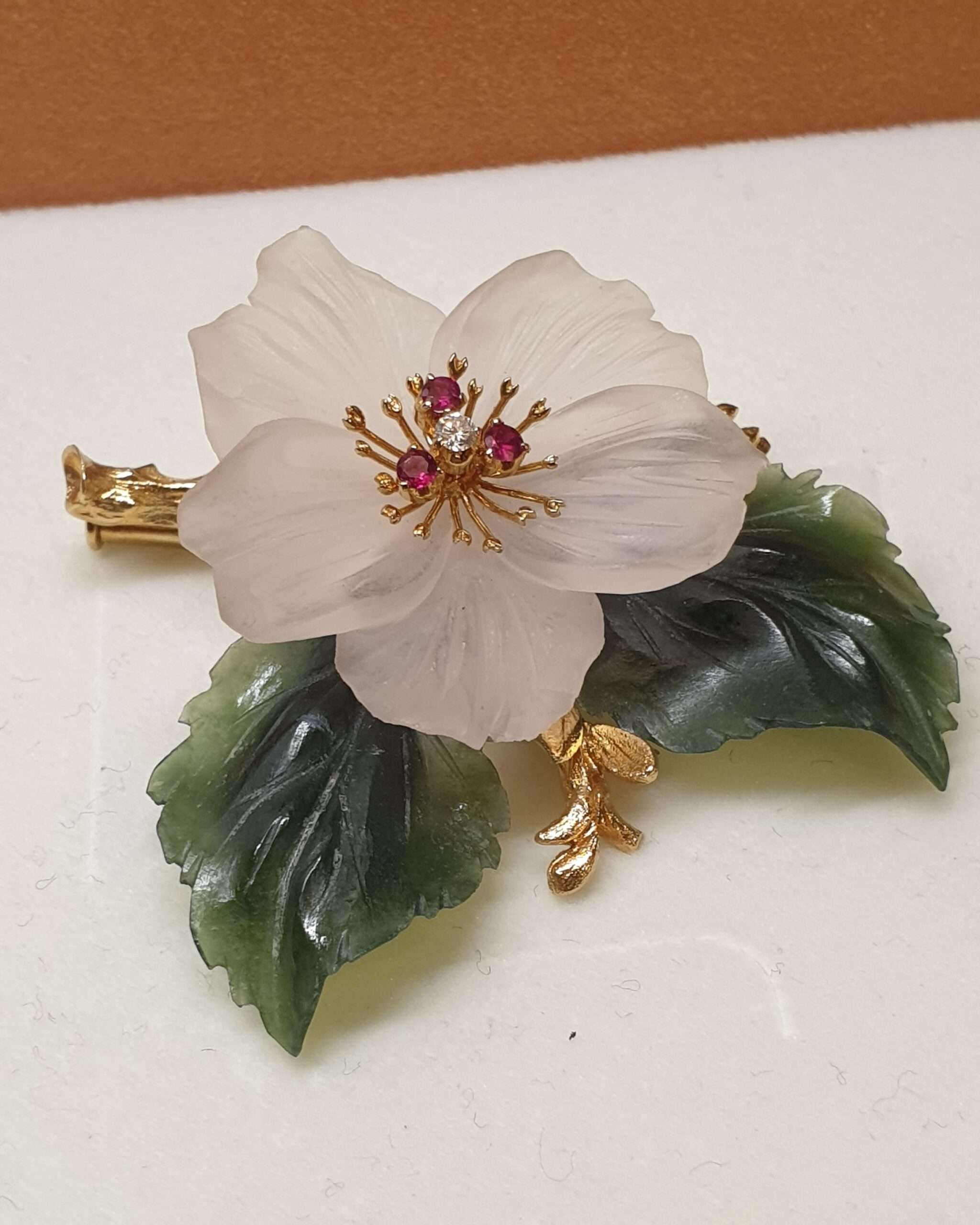 Goldschmiede Kunst Blume Blüten Brosche Anstecknadel Goldbrosche Gold 585 Jade Rosenquarz Rubin Diamant Vintage elegant GB111