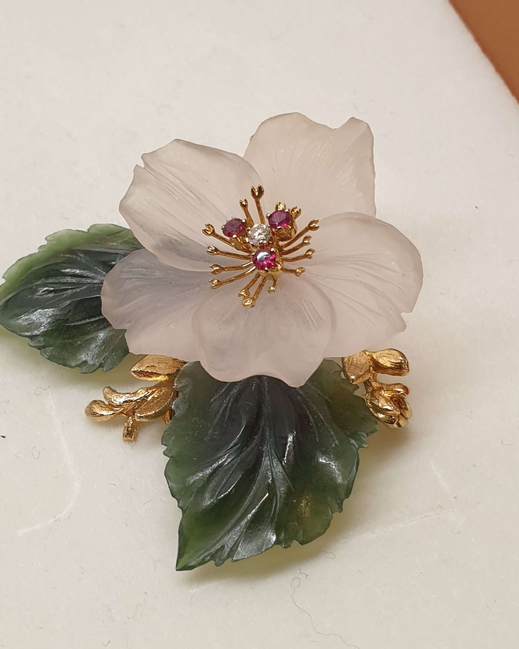 Produktinformationen "Goldschmiede Kunst Blume Blüten Brosche Anstecknadel Goldbrosche Gold 585 Jade Rosenquarz Rubin Diamant Vintage elegant GB111"