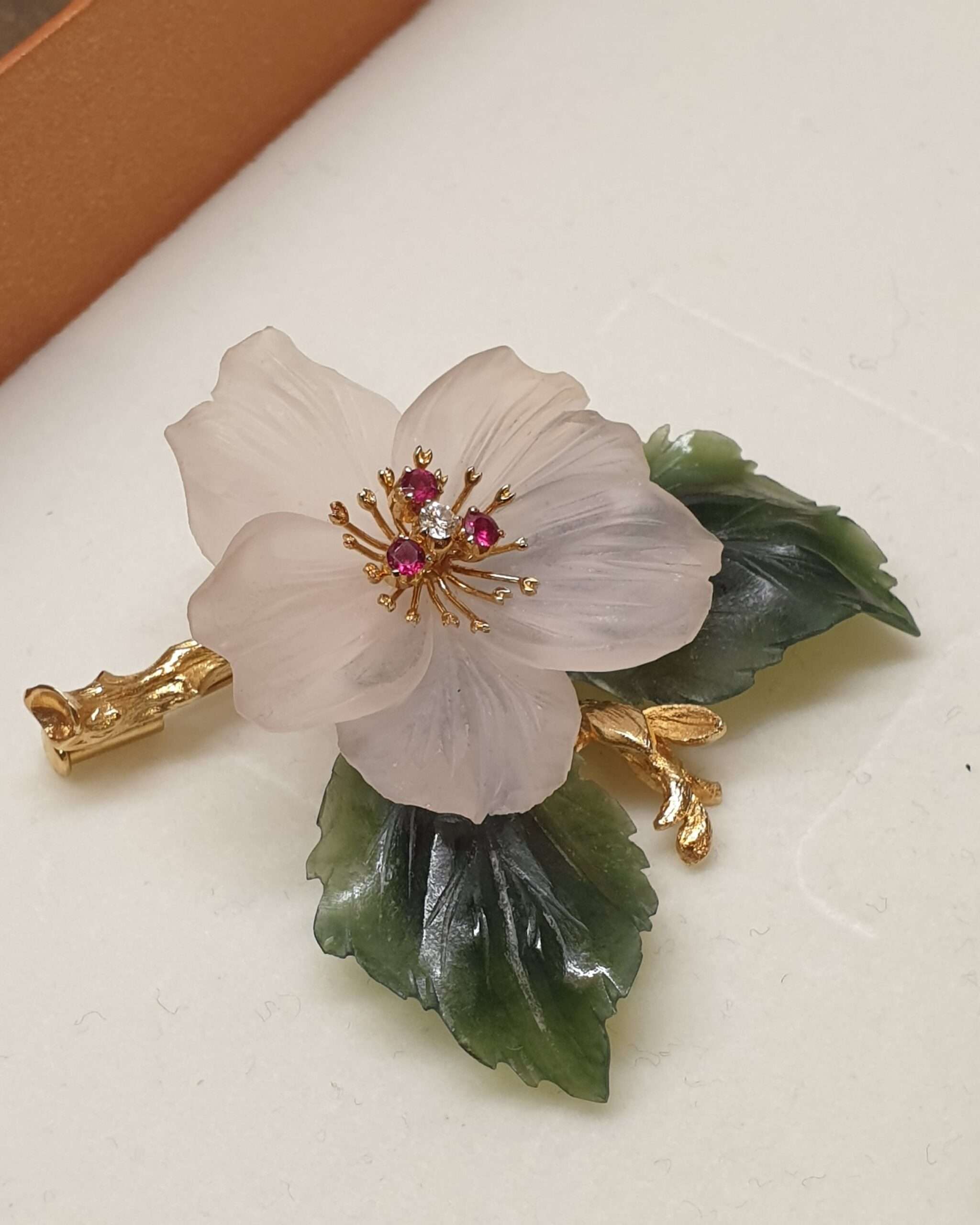 Die hübsche, zart roséfarbene Blume / Blüte ist aus geschnittenem Rosenquarz gefertigt, die in zwei Blättern aus grünem Jade eingebettet ist. Drei Rubine und ein Diamantsteinchen in Brillantschliff bilden das Innenleben der Kirschblüte.