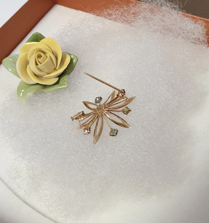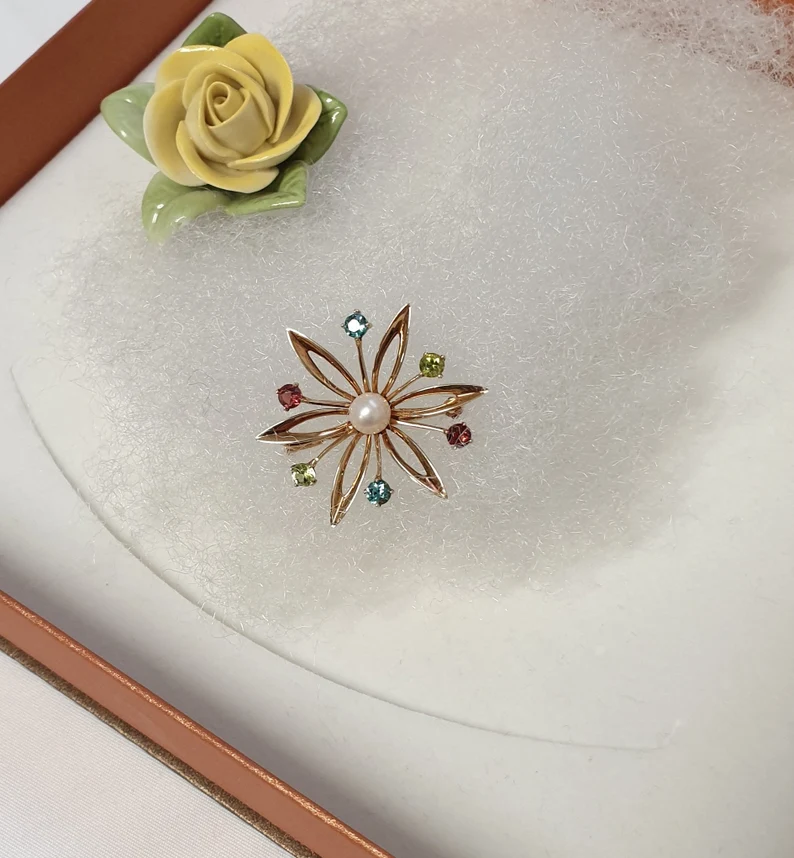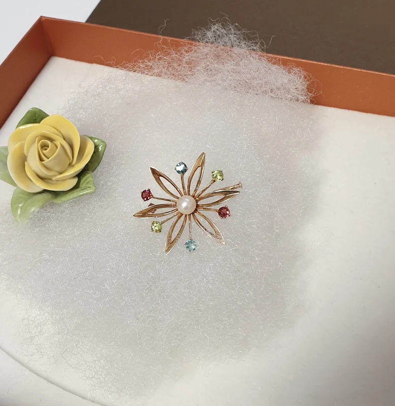 Goldschmiede Kunst Österreich Blume Stern Brosche Anstecknadel Goldbrosche Gold 585 Perle & Kristalle bunt Shabby Vintage elegant GB103