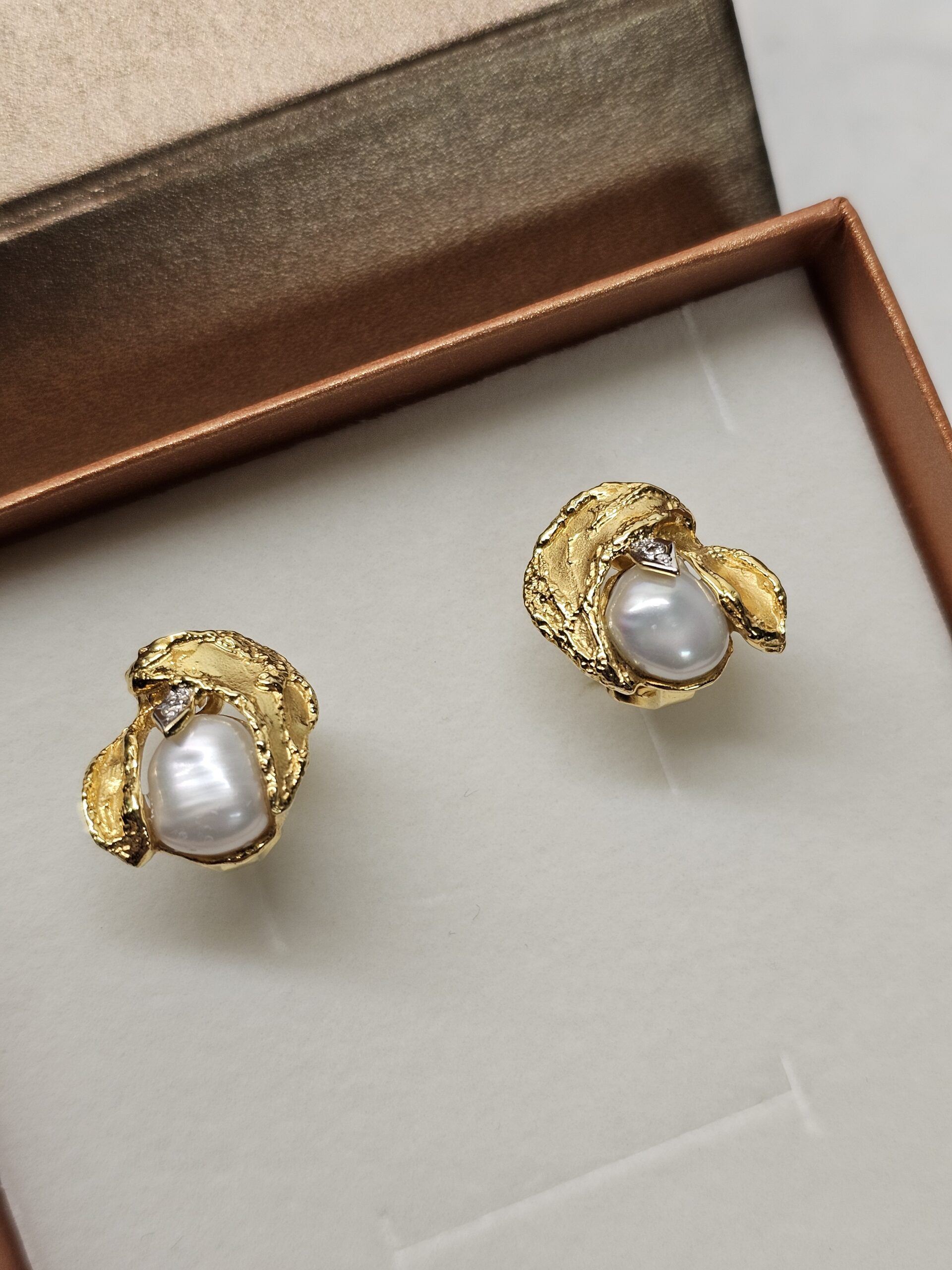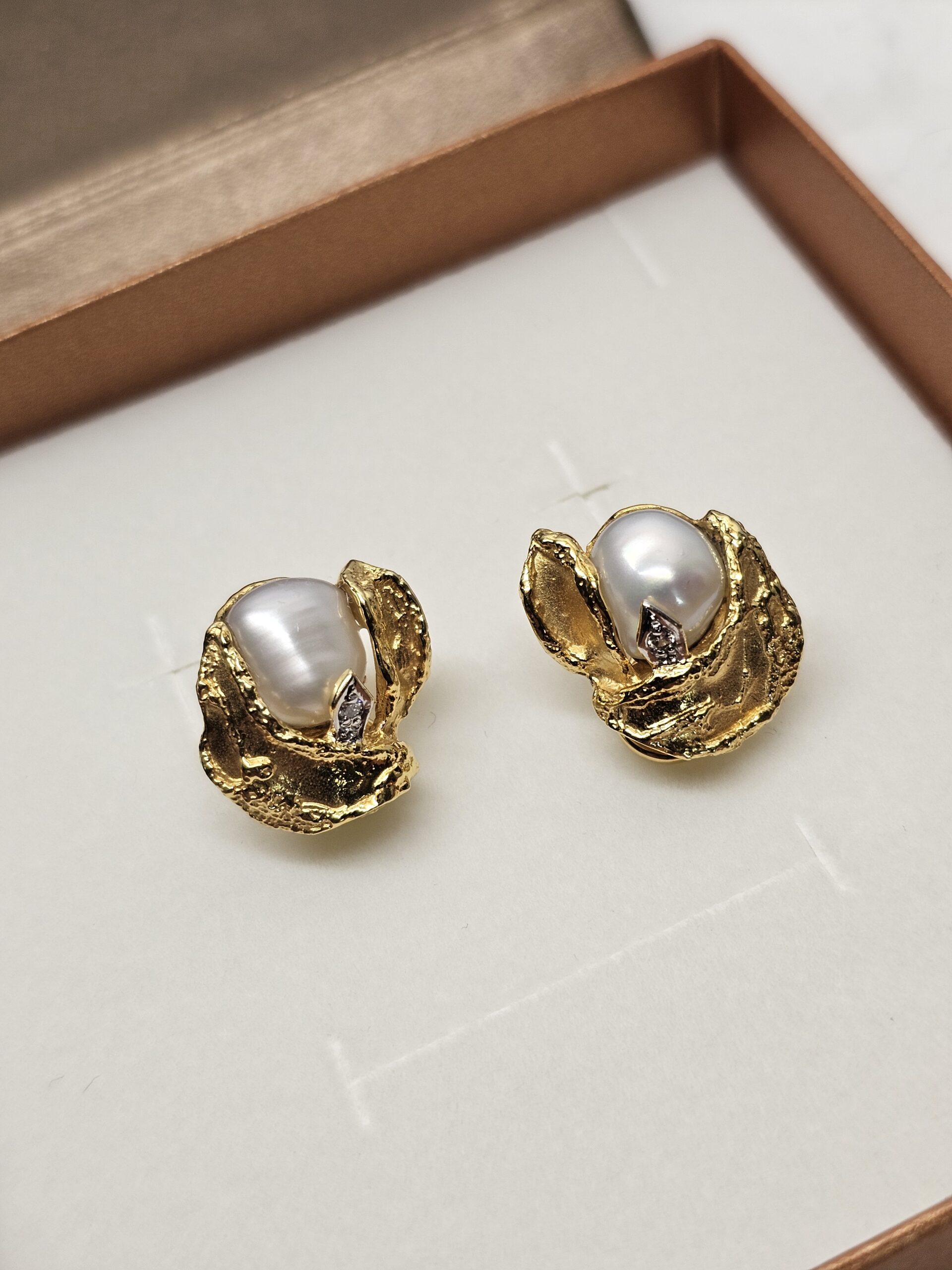 Hübsche Design Ohrringe Ohrclips Clips Gold 585 Perle Keshi Perle & Kristall Steinchen klar edel Vintage OR133