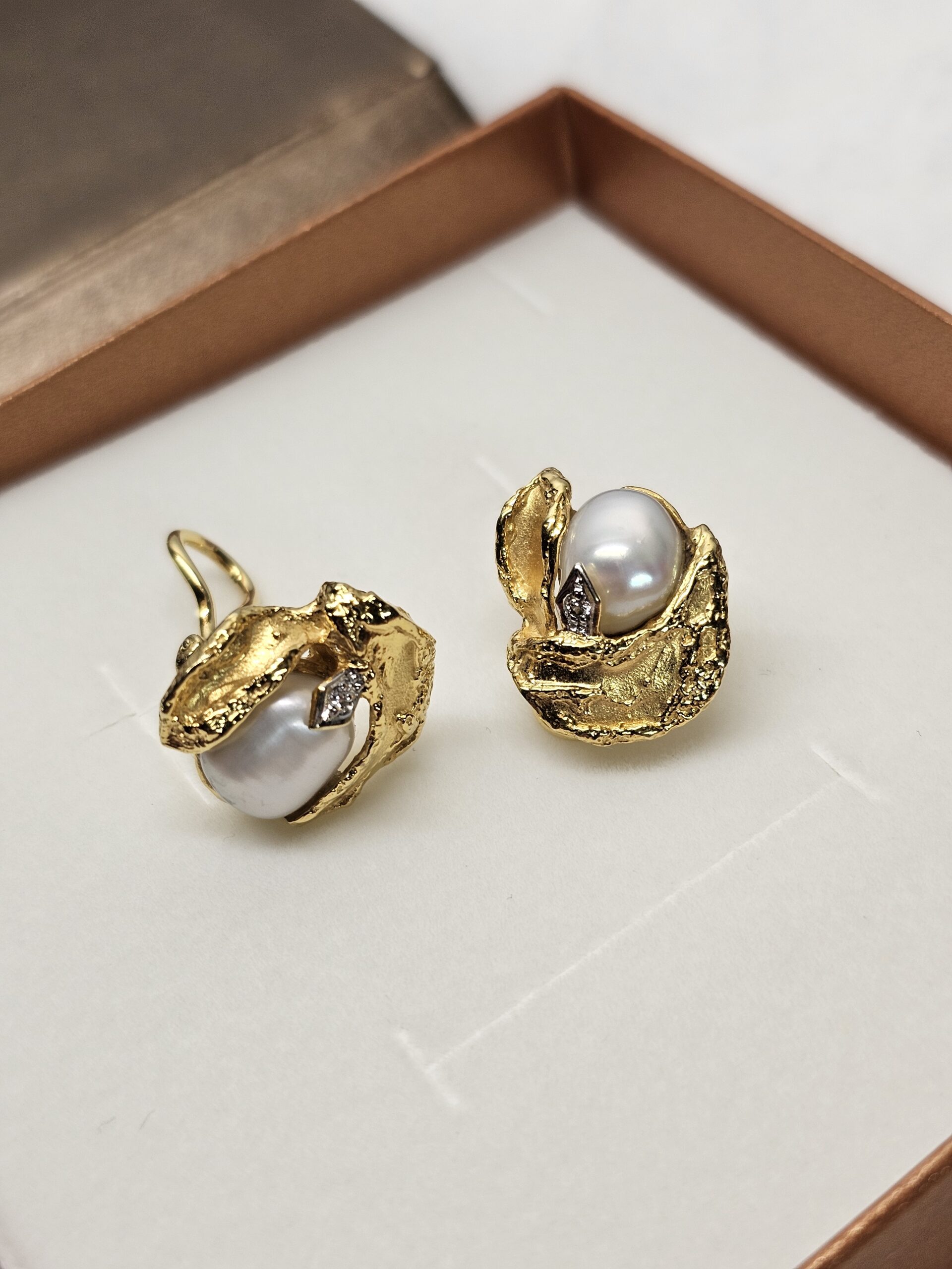 Stylisch schöne Ohrringe / Ohrstecker 585 Gold besetzt je mit einer Keshi-Perle und einem klaren Kristallsteinchen auf platiniertem Untergrund.