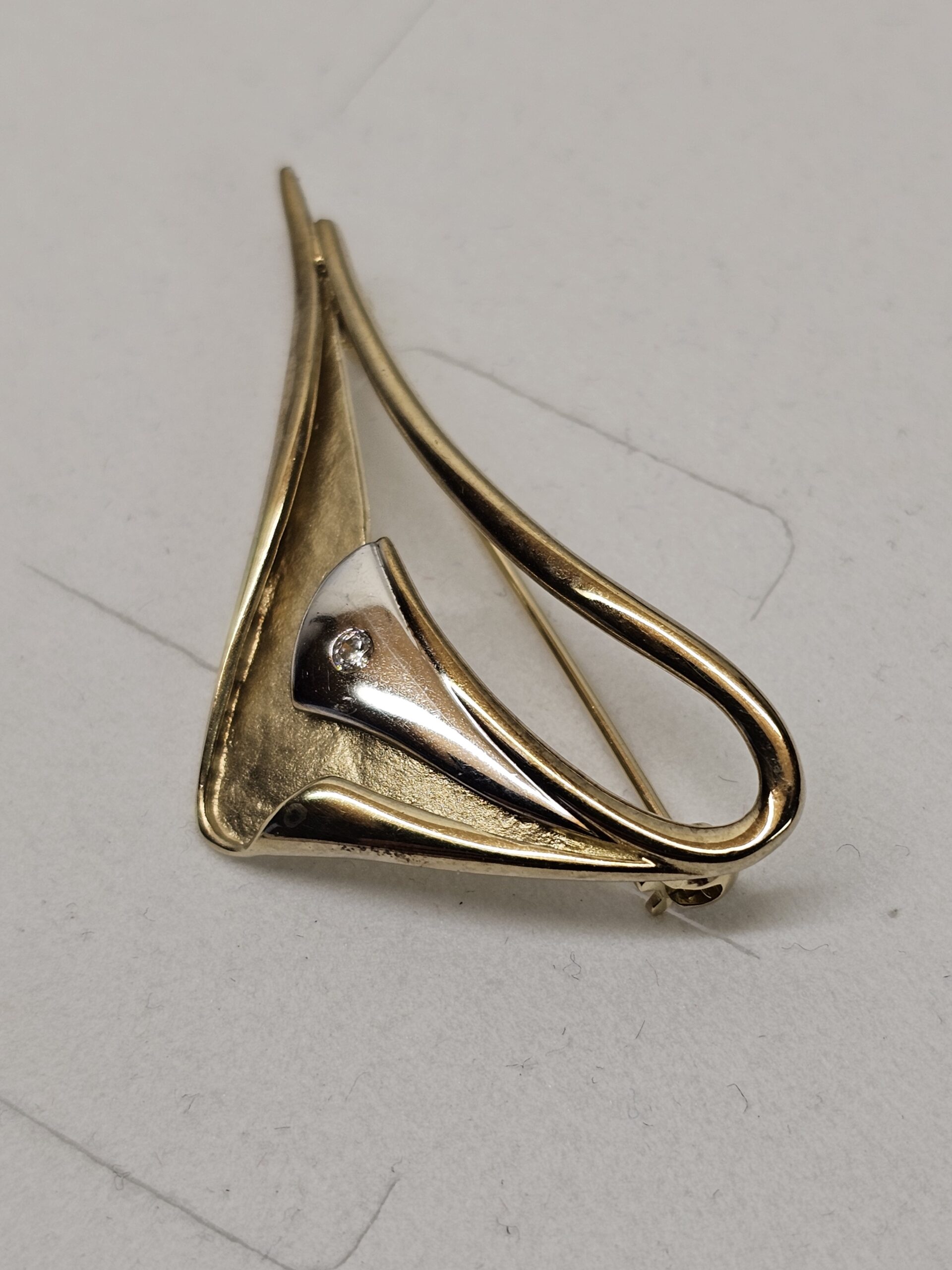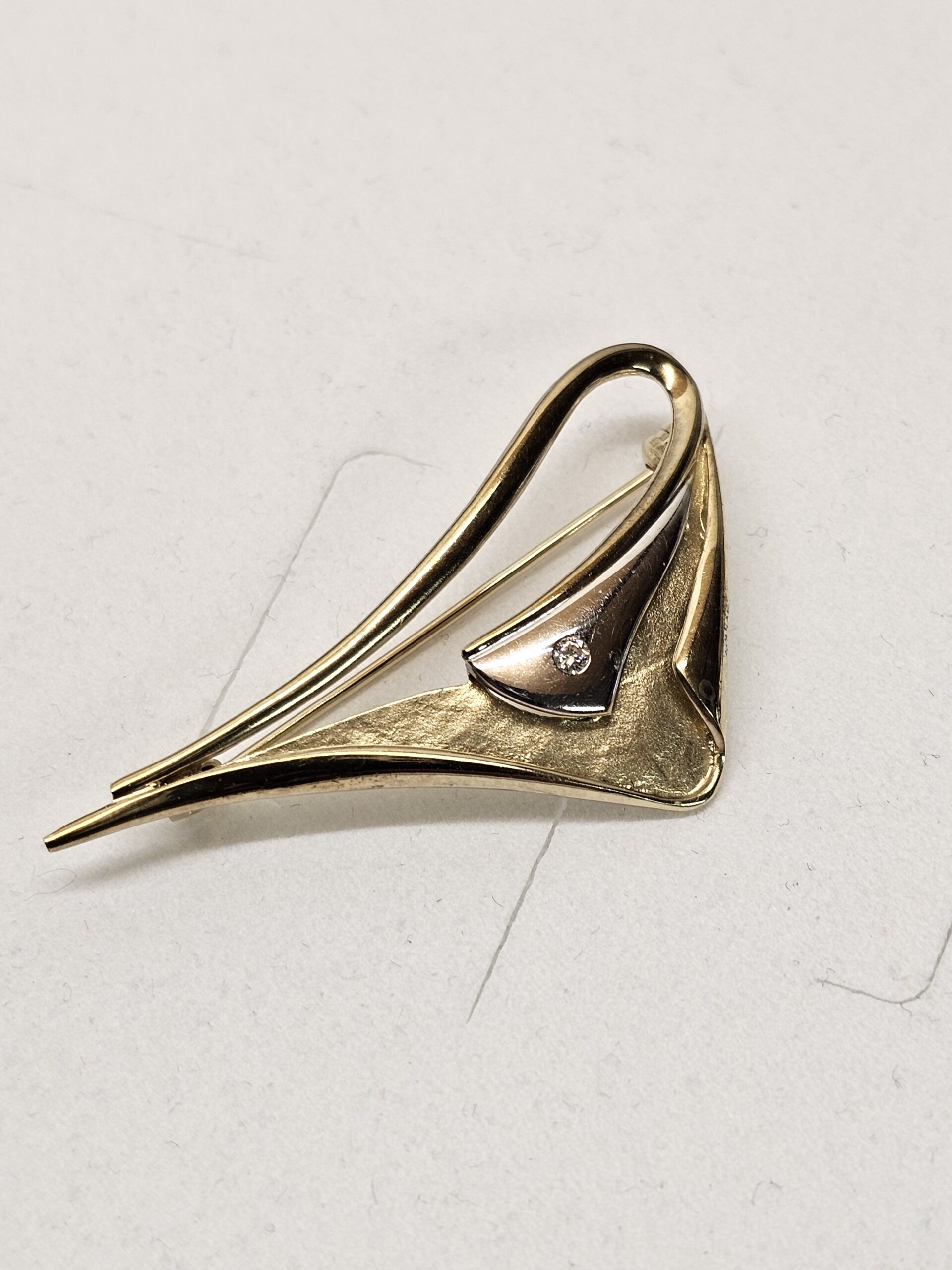 Schicke elegante Vintage-Brosche aus Gold 333, im Design matt / glänzend gearbeitet und mit kleinen klaren Kristallsteinchen verziert. Ein besonderes Schmuckstück mit einer edlen und seltenen Gestaltung.