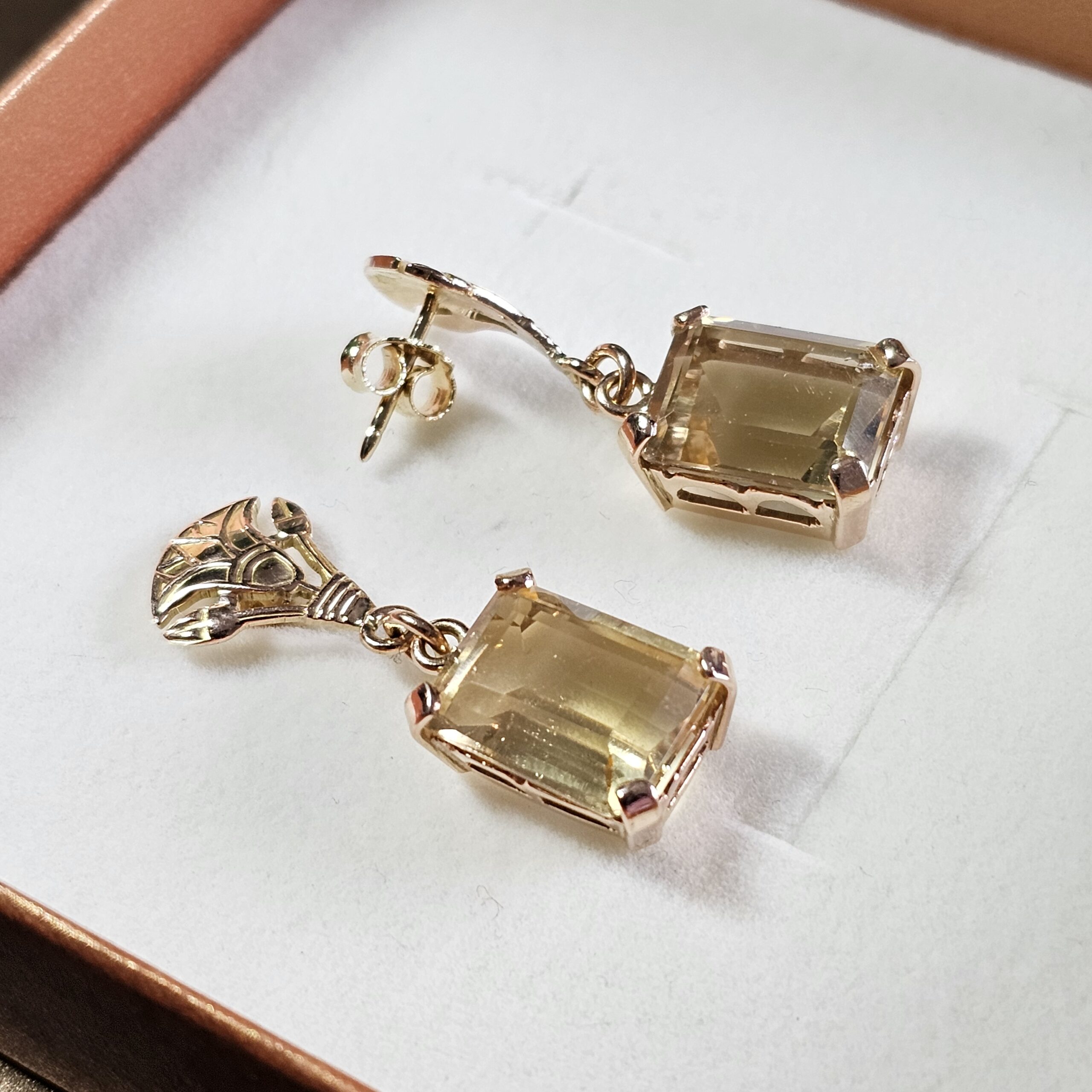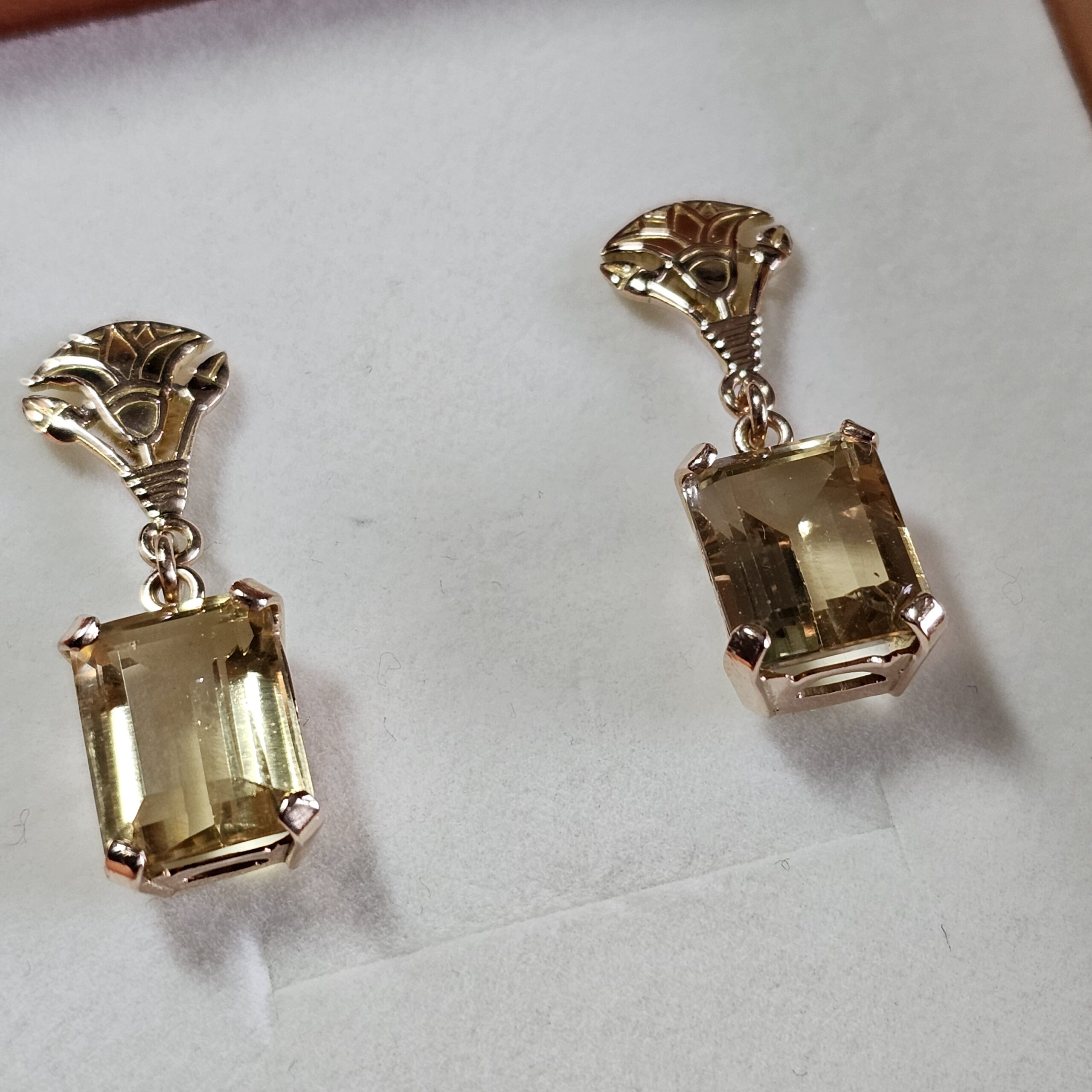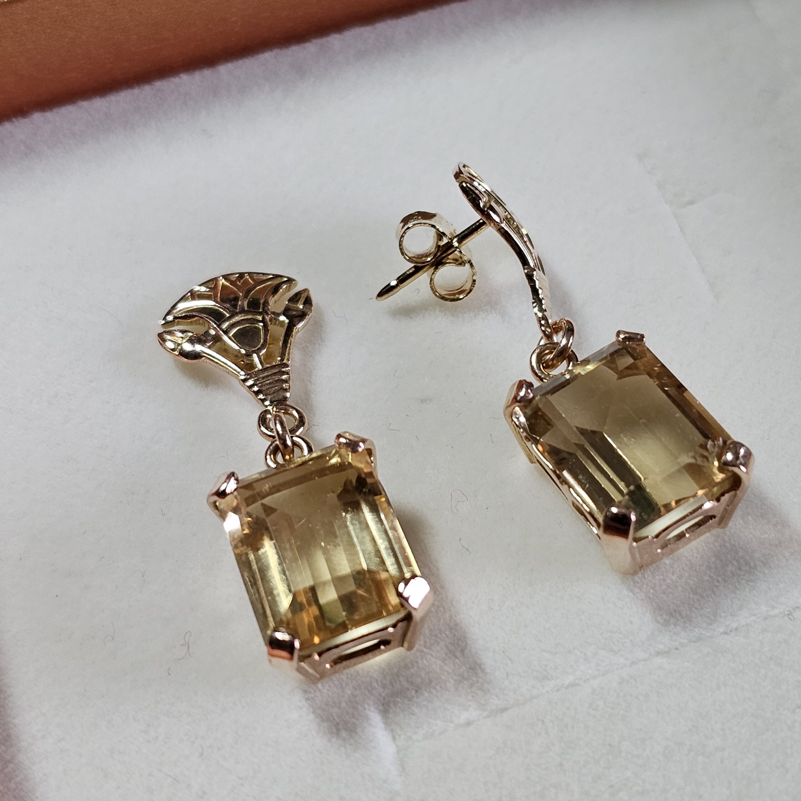 Nostalgische Ohrringe / Ohrstecker lang aus Gold 585 besetzt je mit je einem Citrin.