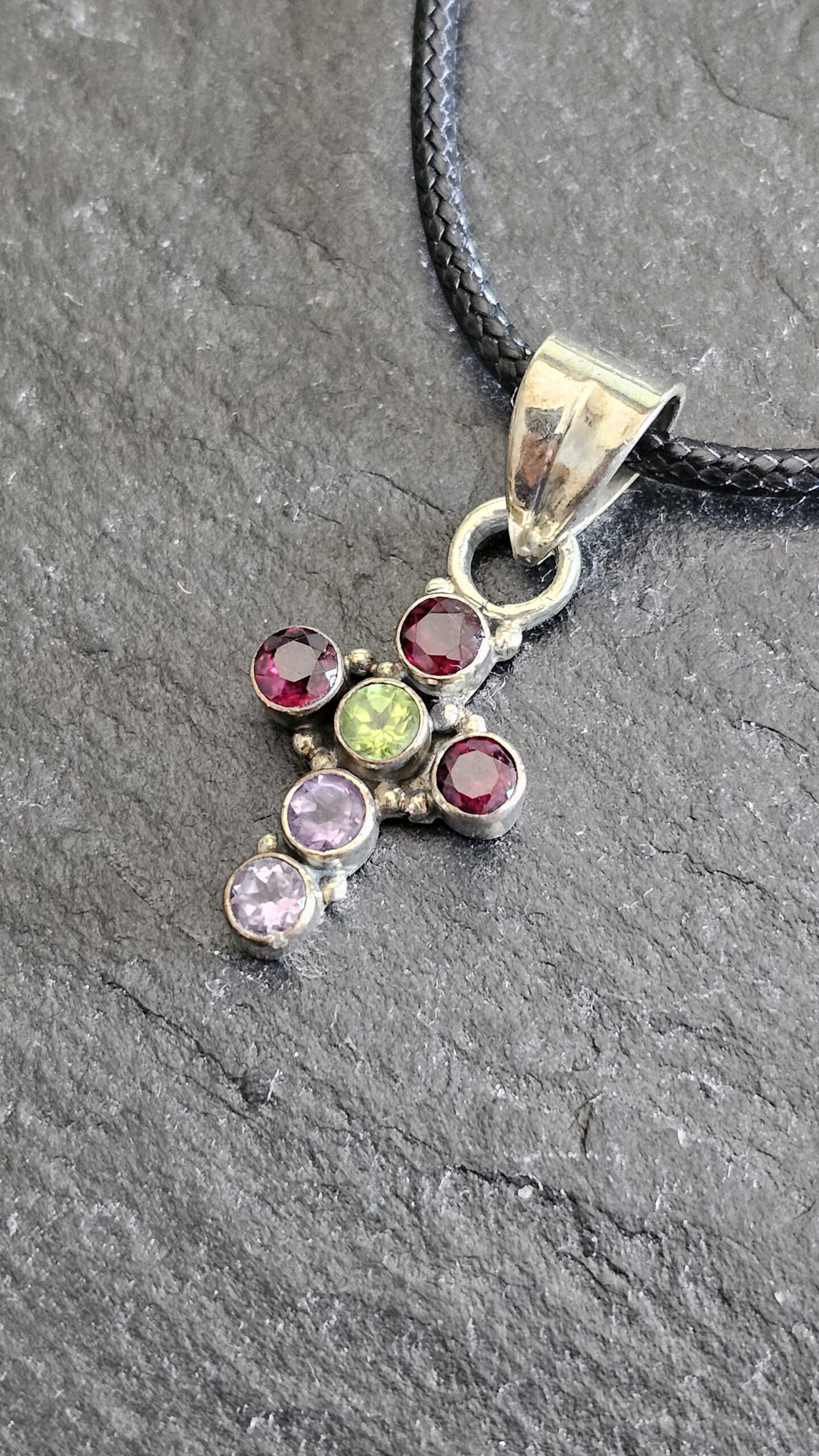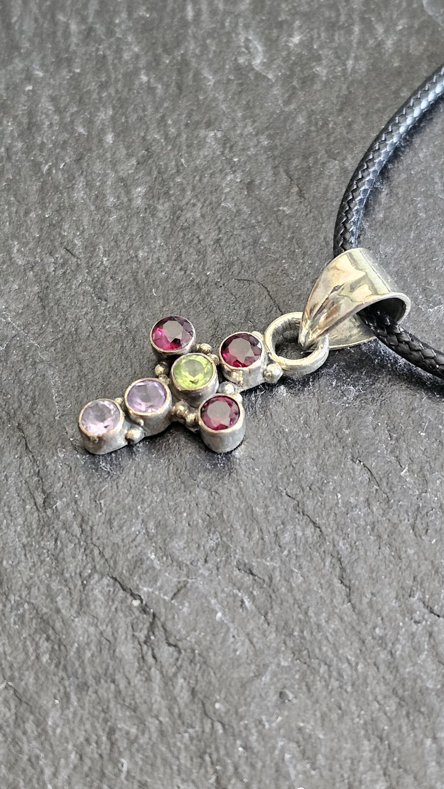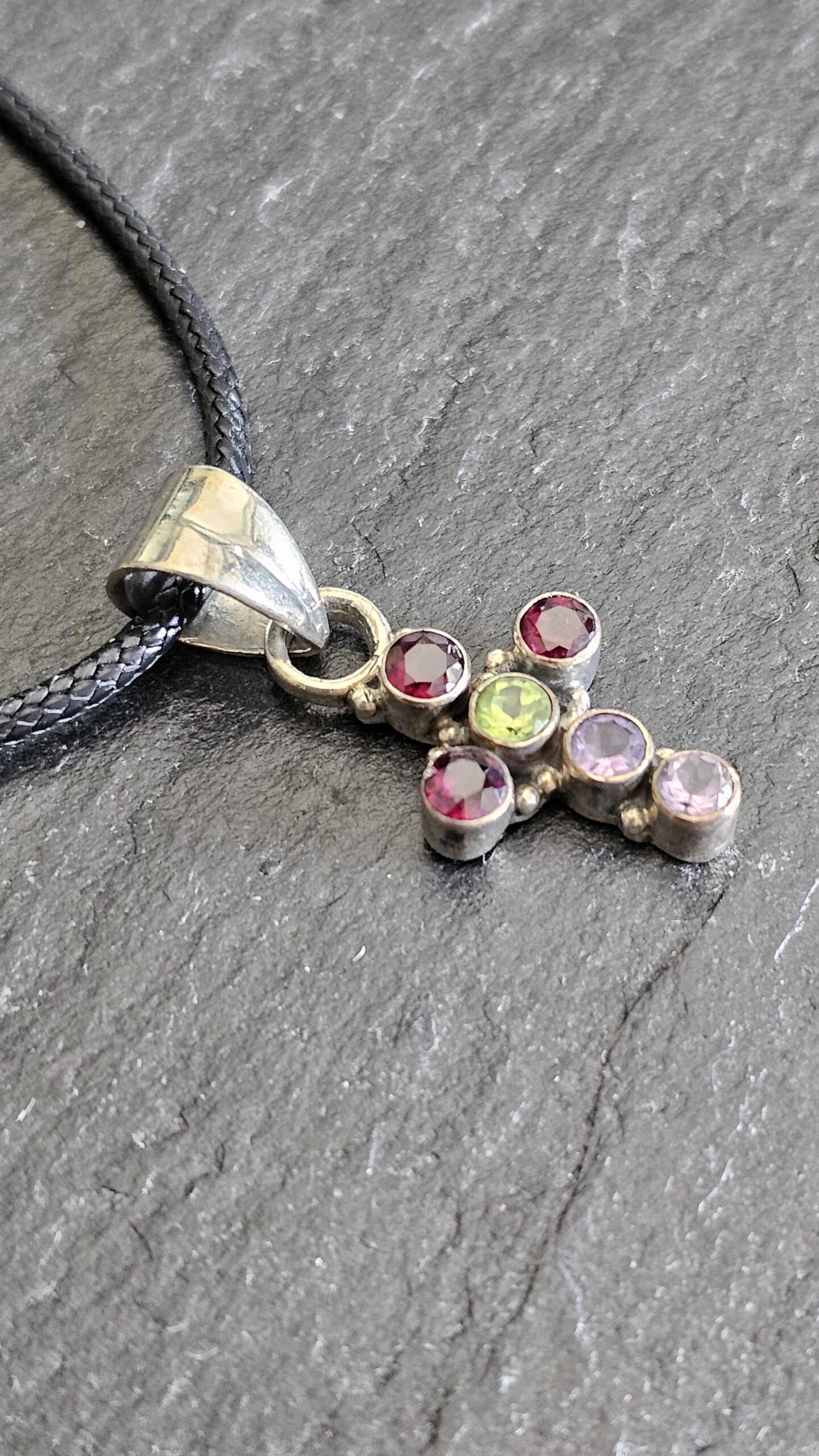 Nostalgischer Kreuzanhänger aus Silber 925 gefertigt. Geschmückt ist das Kreuz mit einem hellgrünen, zwei fliederfarbenen und drei himbeerfarbenen Turmalinsteinchen.